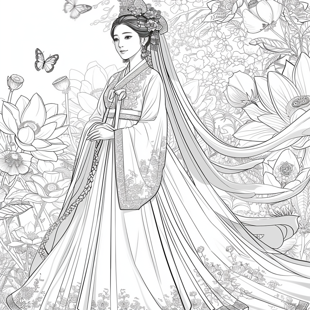 This artwork presents a breathtaking portrait of a Korean bride in an elaborate royal hanbok, standing gracefully before a vibrant backdrop of blooming lotus flowers and fluttering butterflies. Her attire shimmers in radiant hues of gold, red, blue, and ivory, richly embroidered with floral and symbolic motifs that represent purity, prosperity, and harmony. The jeweled crown and intricate hair ornaments enhance her regal aura, while the flowing robes and trailing silk embody timeless elegance. The lotus garden setting creates a dreamlike harmony between nature, beauty, and tradition, making this image a celebration of cultural grandeur and feminine grace.