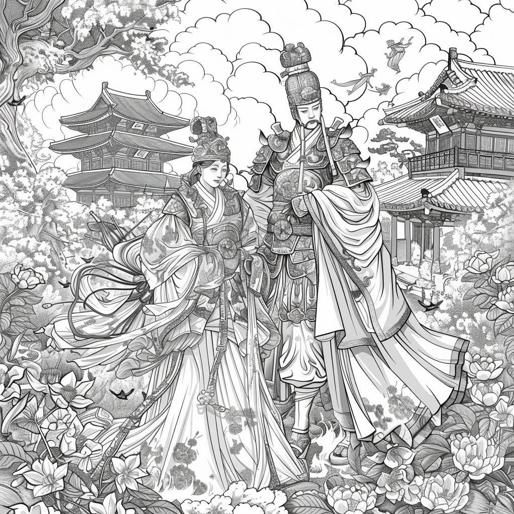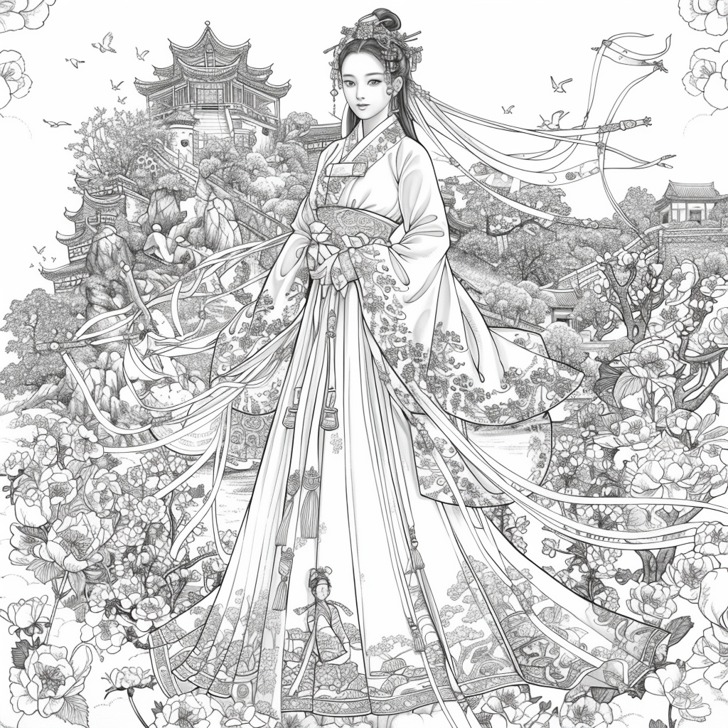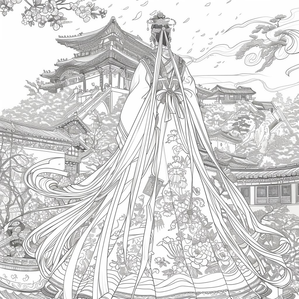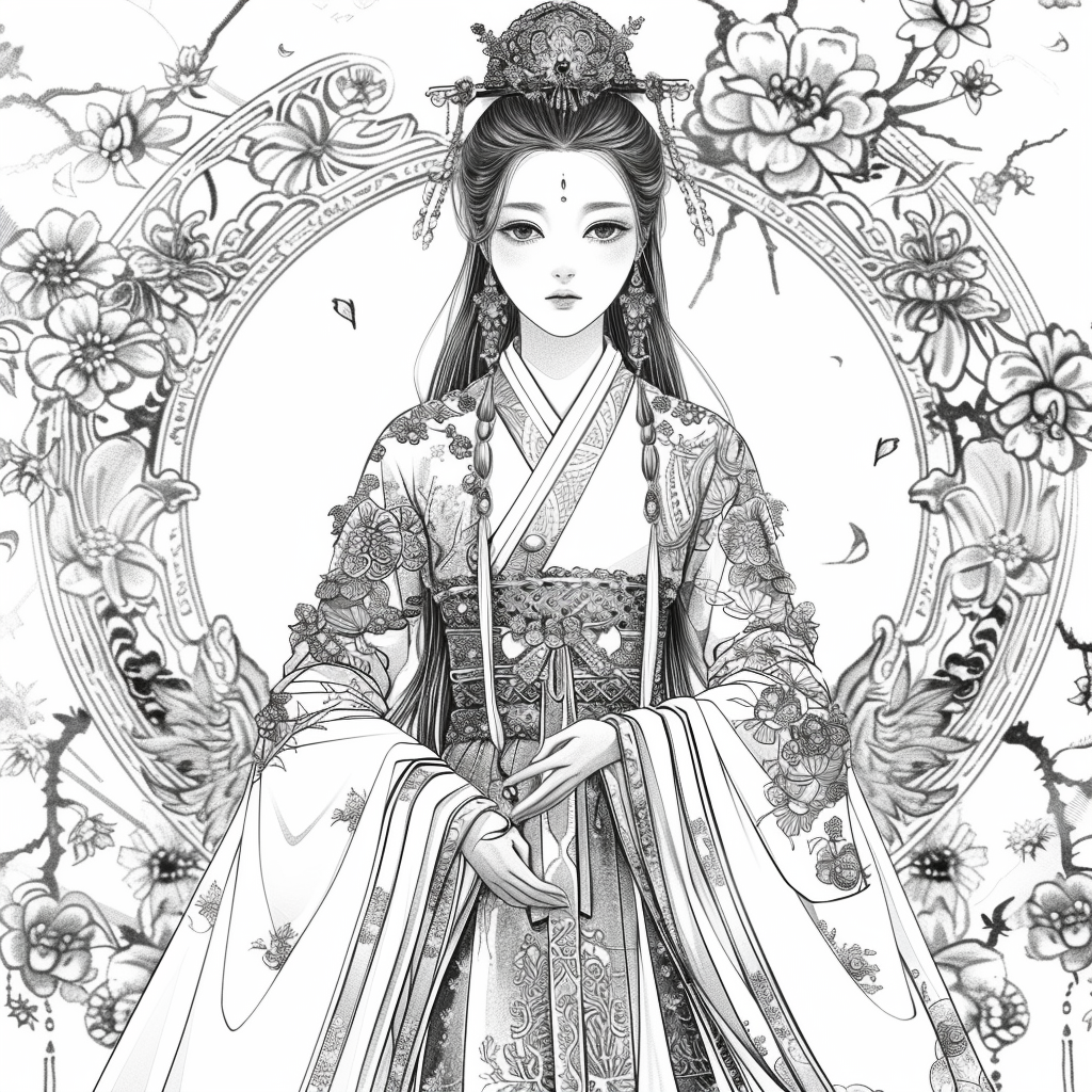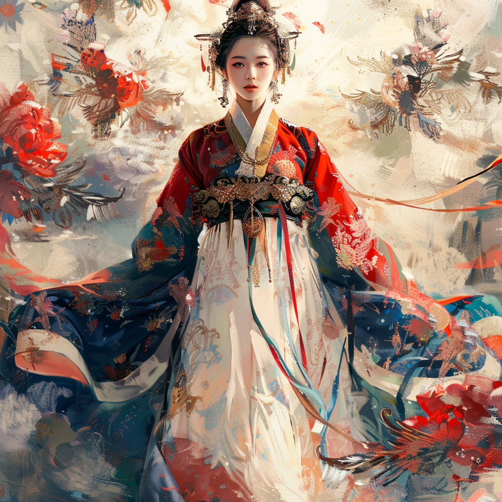 A noble princess stands in majestic poise, her hanbok flowing in deep crimson, ivory, and indigo hues, embroidered with golden patterns of flowers and phoenixes. The ornate black-and-gold belt across her waist accentuates her regal stature, while her jeweled crown glimmers under soft light. Around her, blossoms and painterly strokes swirl like a living canvas, blending the elegance of tradition with the vibrancy of artistry. This image captures the timeless beauty, strength, and dignity of a princess whose presence radiates both power and serenity.