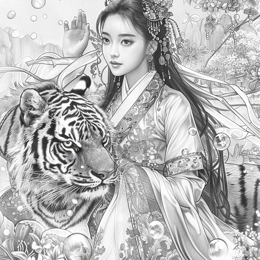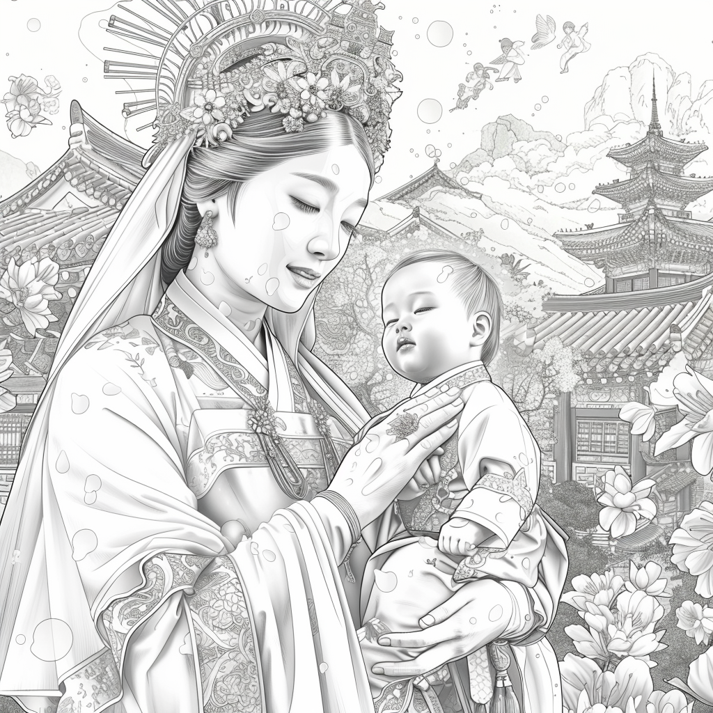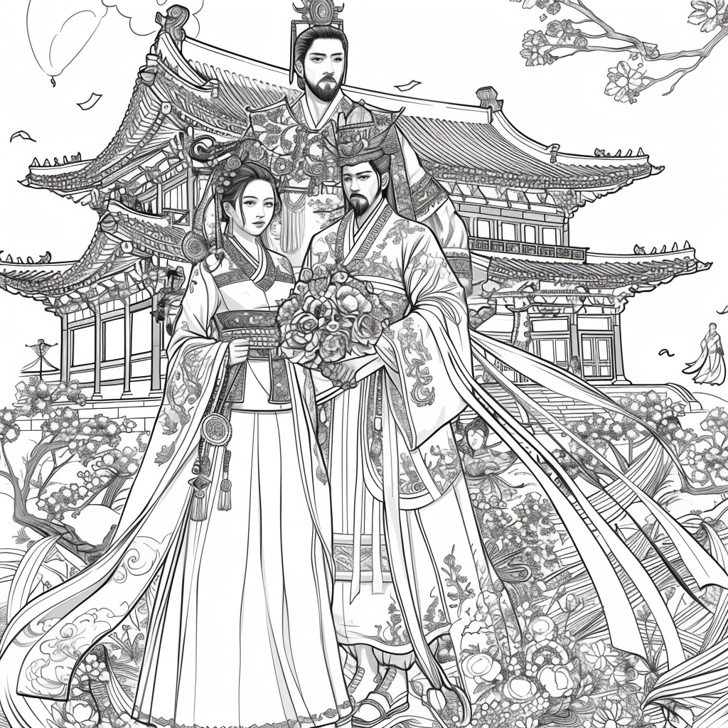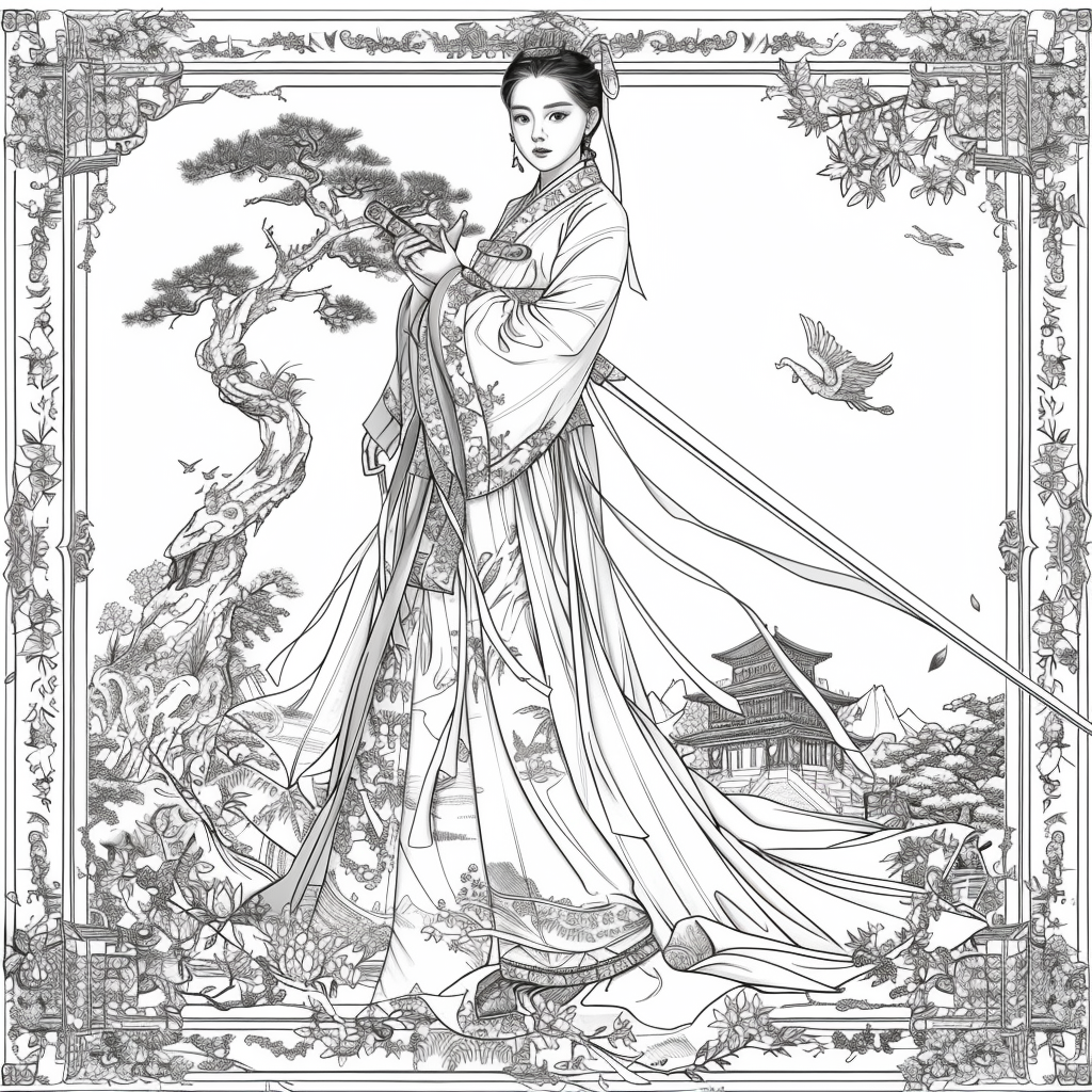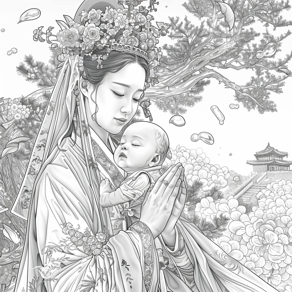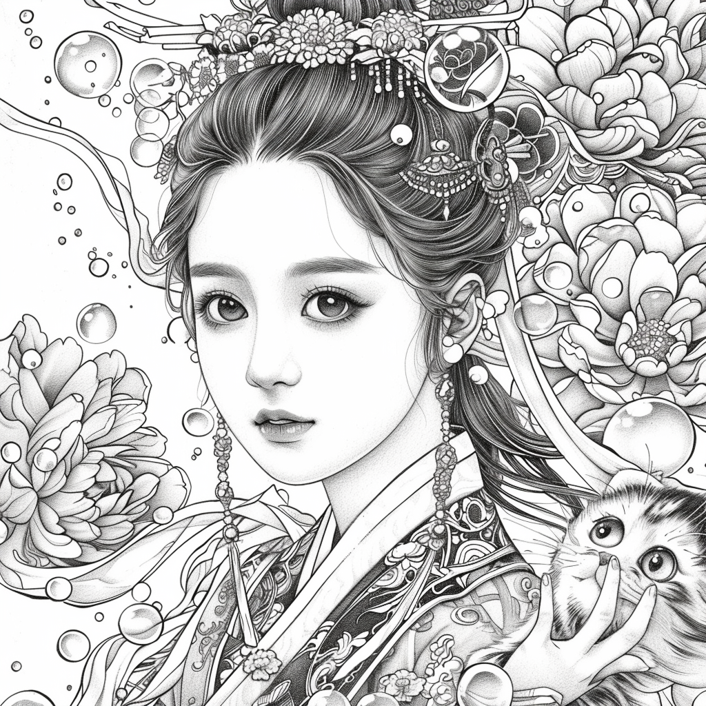 A noble princess stands in majestic poise, her hanbok flowing in deep crimson, ivory, and indigo hues, embroidered with golden patterns of flowers and phoenixes. The ornate black-and-gold belt across her waist accentuates her regal stature, while her jeweled crown glimmers under soft light. Around her, blossoms and painterly strokes swirl like a living canvas, blending the elegance of tradition with the vibrancy of artistry. This image captures the timeless beauty, strength, and dignity of a princess whose presence radiates both power and serenity.