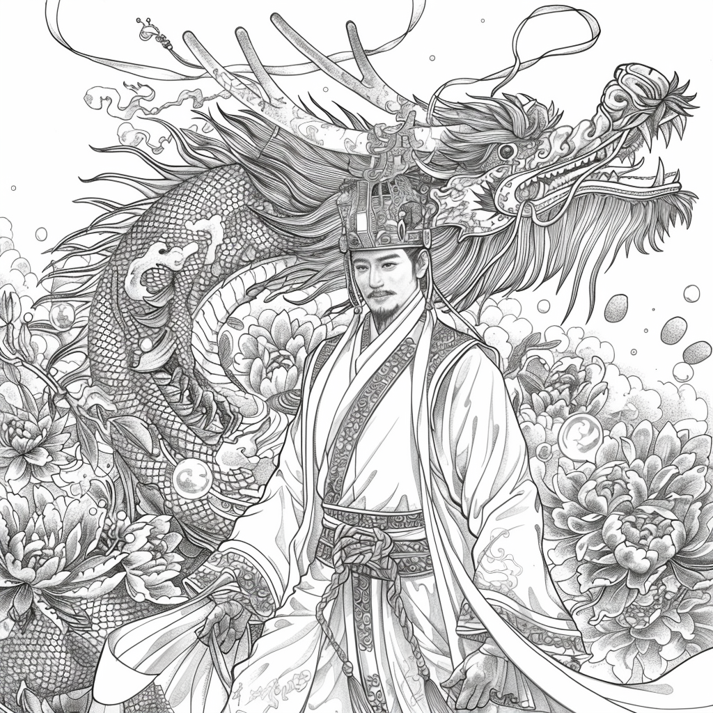 This artwork presents a breathtaking portrait of a royal figure adorned with an elaborate celestial crown, richly detailed with jewels, dragons, and sacred motifs. The serene yet commanding expression reflects wisdom and authority, while the intricate hanbok shimmers in radiant hues of blue, pink, and gold. Surrounding the figure are flowing silks, clouds, and floral blossoms, symbolizing divine harmony and cosmic balance. The fusion of traditional heritage and fantastical artistry creates an ethereal vision of timeless royalty and spiritual majesty.