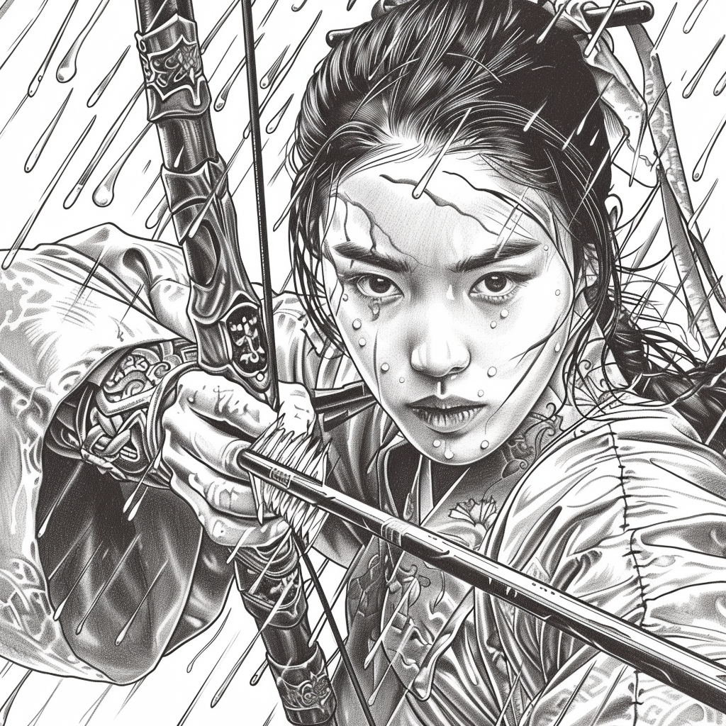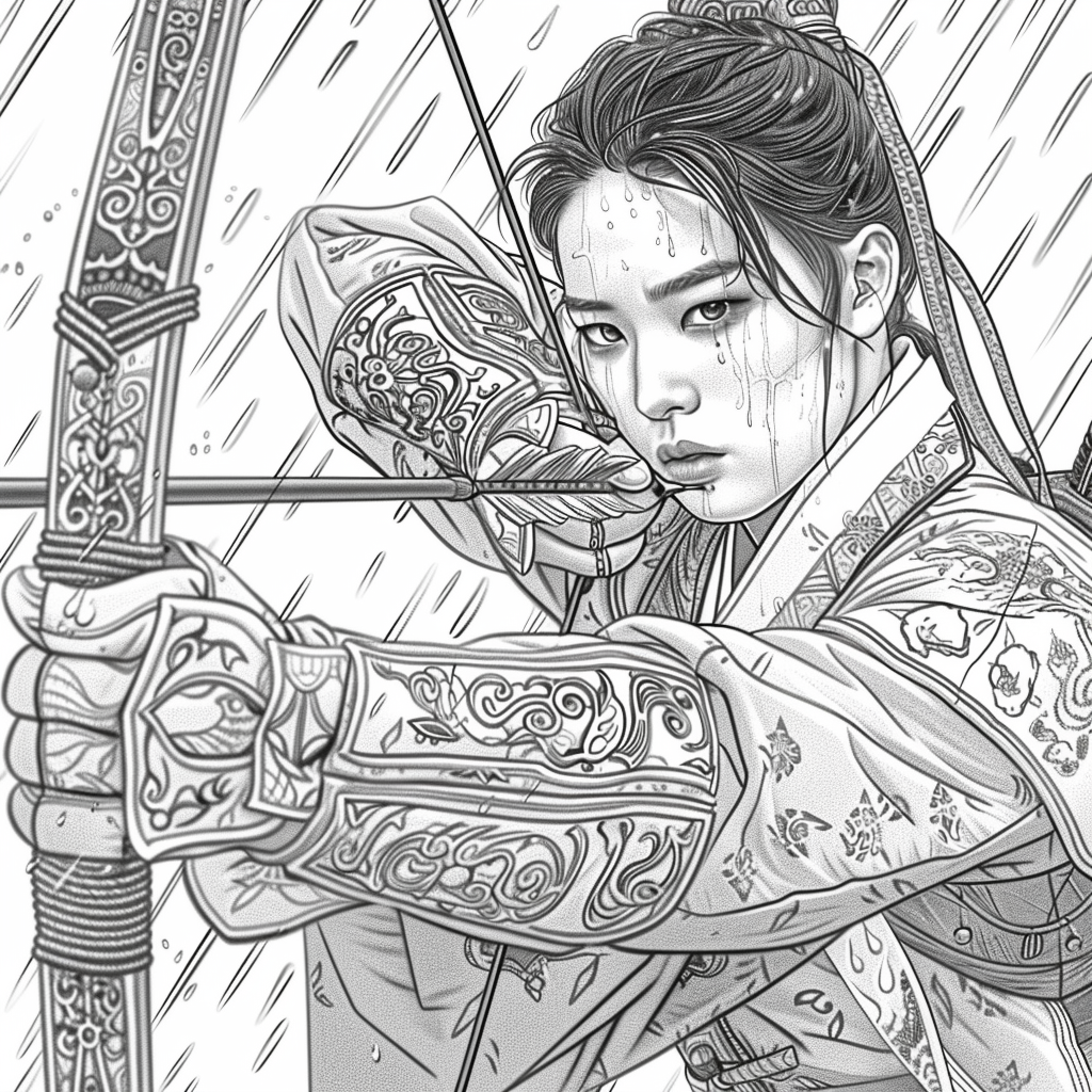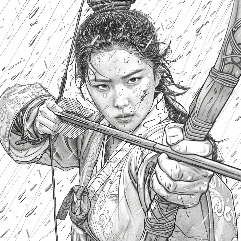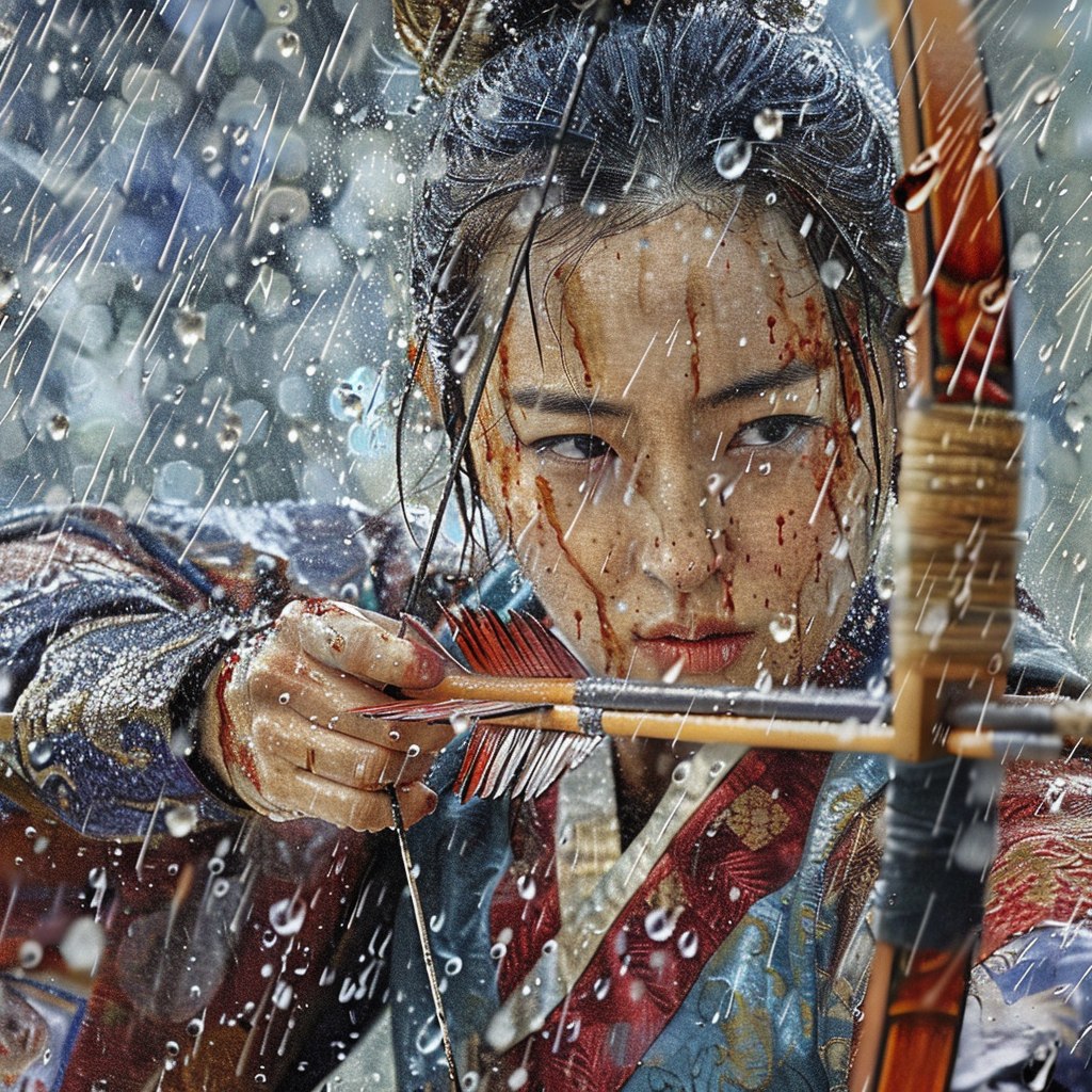 Amid a storm of rain and blood, a fierce Korean warrior woman draws her bow with unyielding determination. Her face, streaked with water and battle scars, radiates focus and unbreakable will. Every droplet emphasizes the intensity of the moment, as the arrow’s sharp edge points toward destiny. Clad in a richly patterned hanbok armor, she embodies the union of tradition and strength. The dramatic realism of the scene captures resilience in the face of chaos, symbolizing the warrior’s spirit that refuses to falter, even against overwhelming odds.