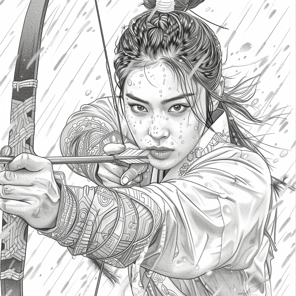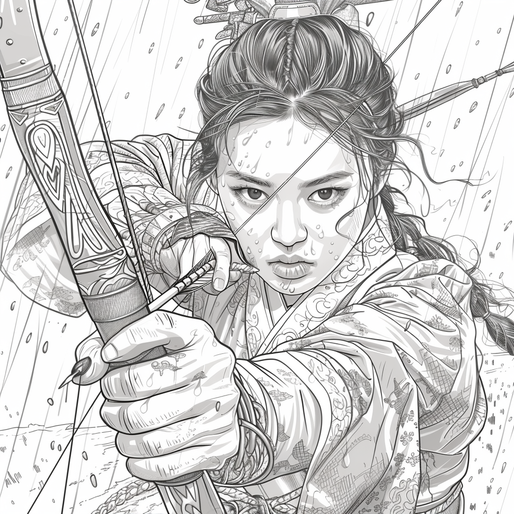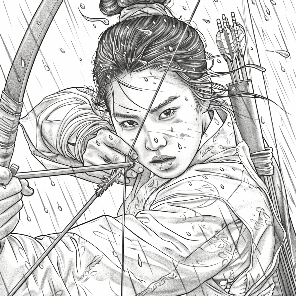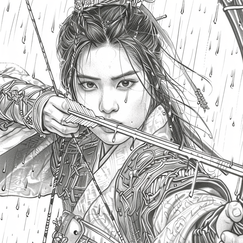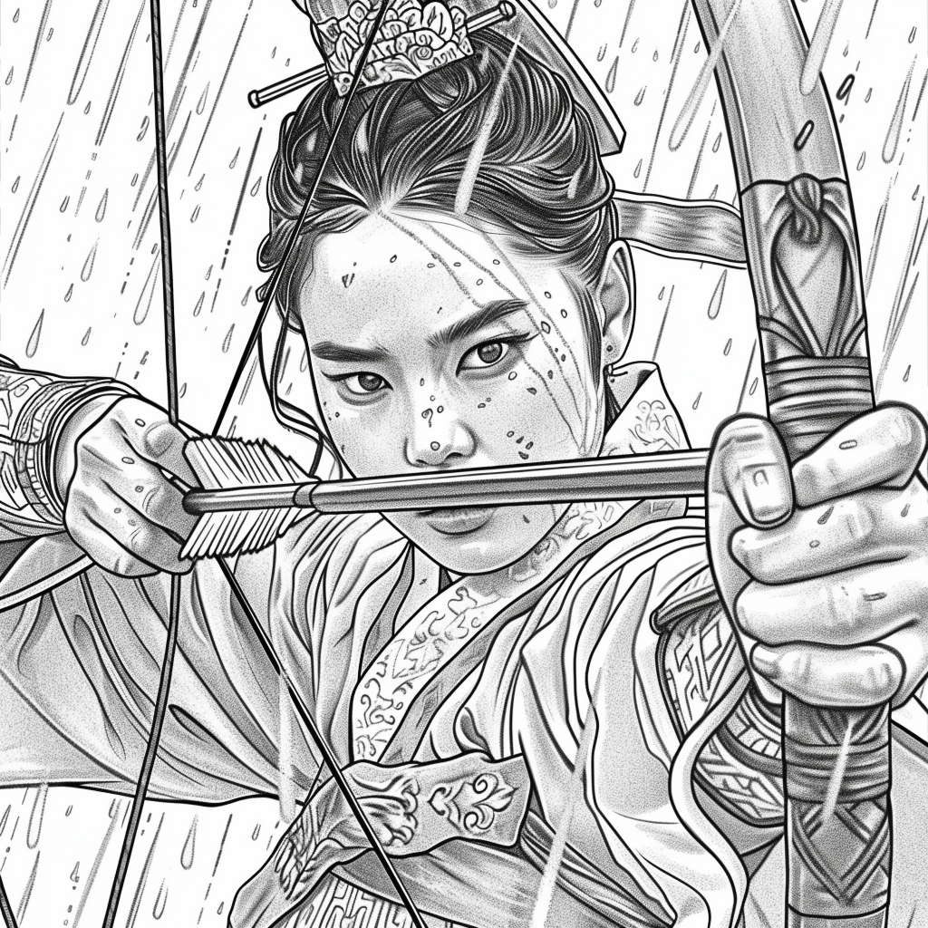 Amid a storm of rain and blood, a fierce Korean warrior woman draws her bow with unyielding determination. Her face, streaked with water and battle scars, radiates focus and unbreakable will. Every droplet emphasizes the intensity of the moment, as the arrow’s sharp edge points toward destiny. Clad in a richly patterned hanbok armor, she embodies the union of tradition and strength. The dramatic realism of the scene captures resilience in the face of chaos, symbolizing the warrior’s spirit that refuses to falter, even against overwhelming odds.