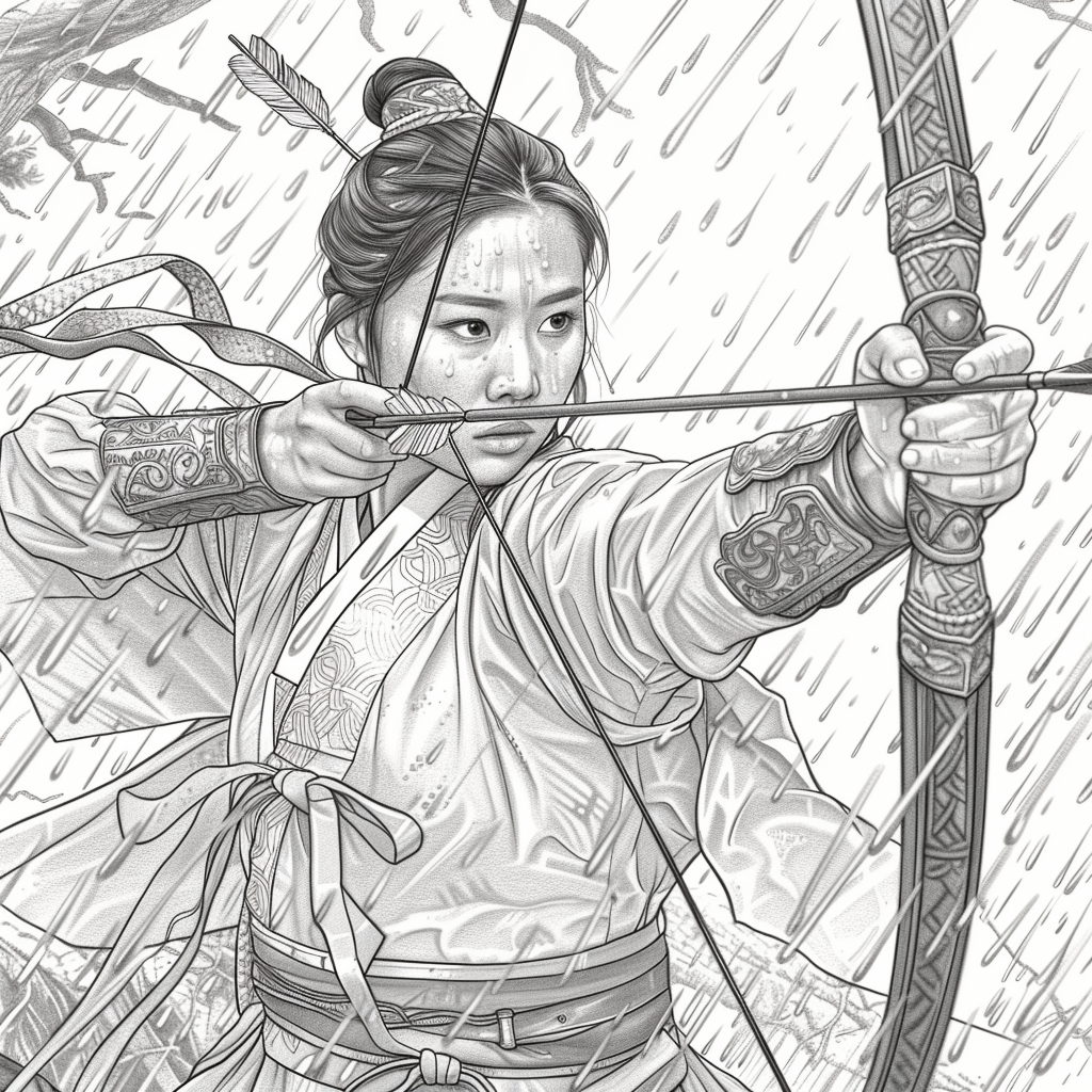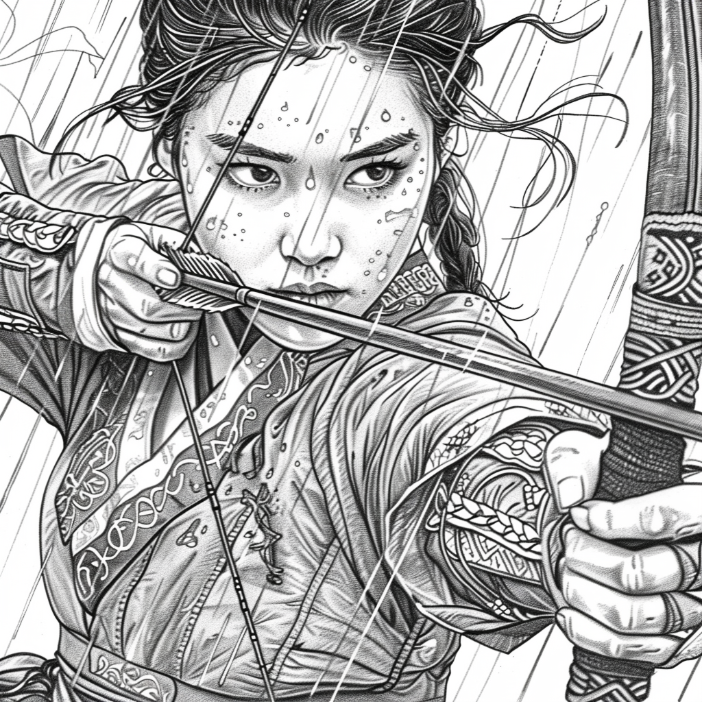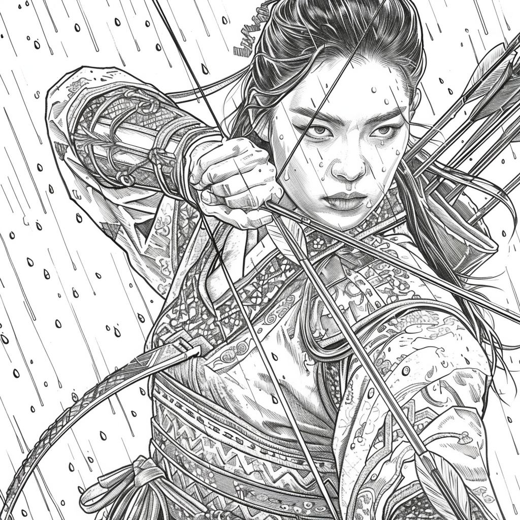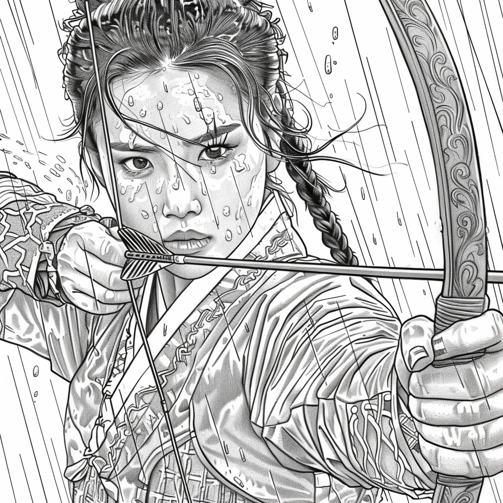 Amid a storm of rain and blood, a fierce Korean warrior woman draws her bow with unyielding determination. Her face, streaked with water and battle scars, radiates focus and unbreakable will. Every droplet emphasizes the intensity of the moment, as the arrow’s sharp edge points toward destiny. Clad in a richly patterned hanbok armor, she embodies the union of tradition and strength. The dramatic realism of the scene captures resilience in the face of chaos, symbolizing the warrior’s spirit that refuses to falter, even against overwhelming odds.