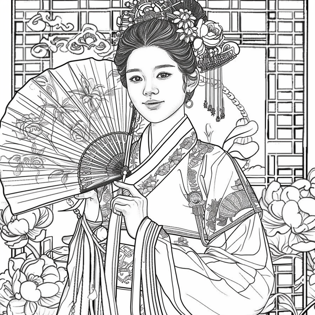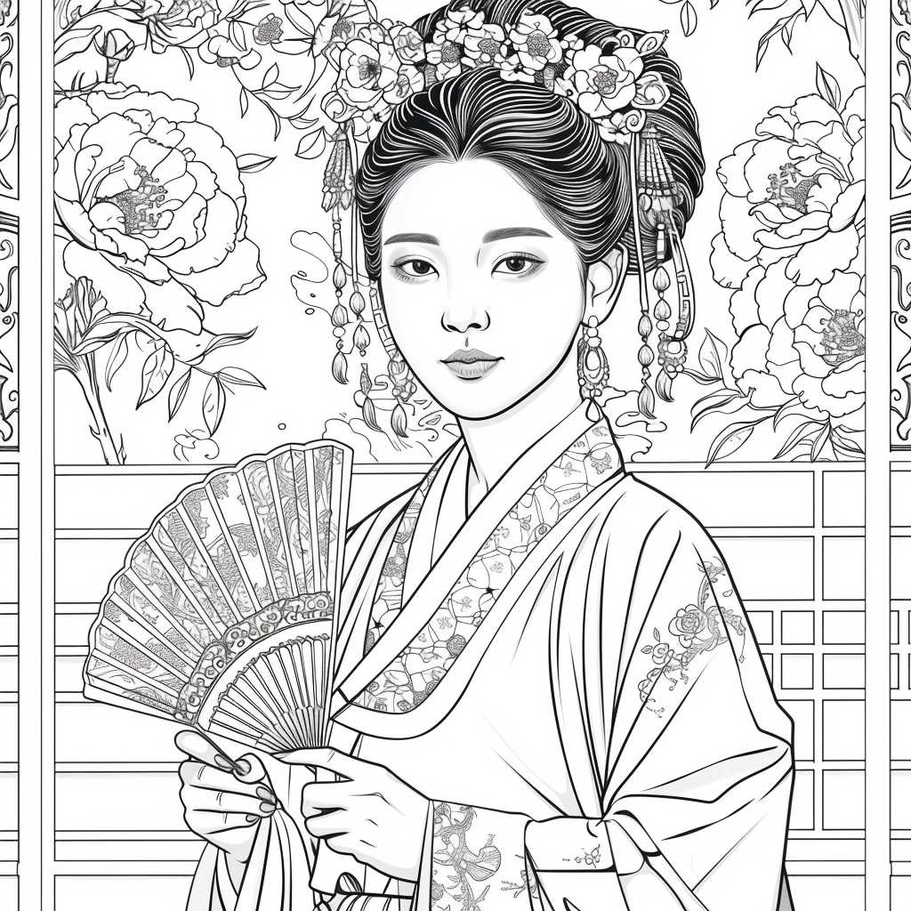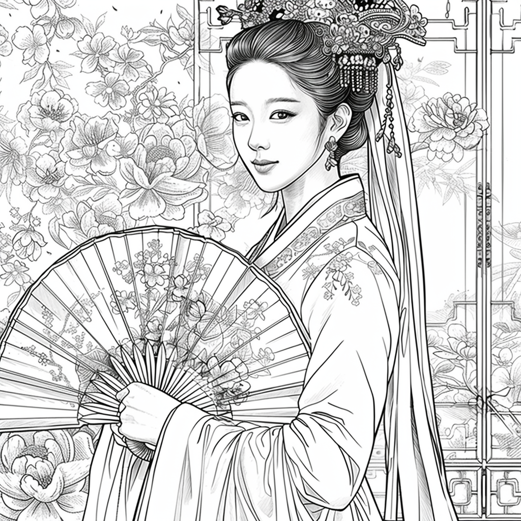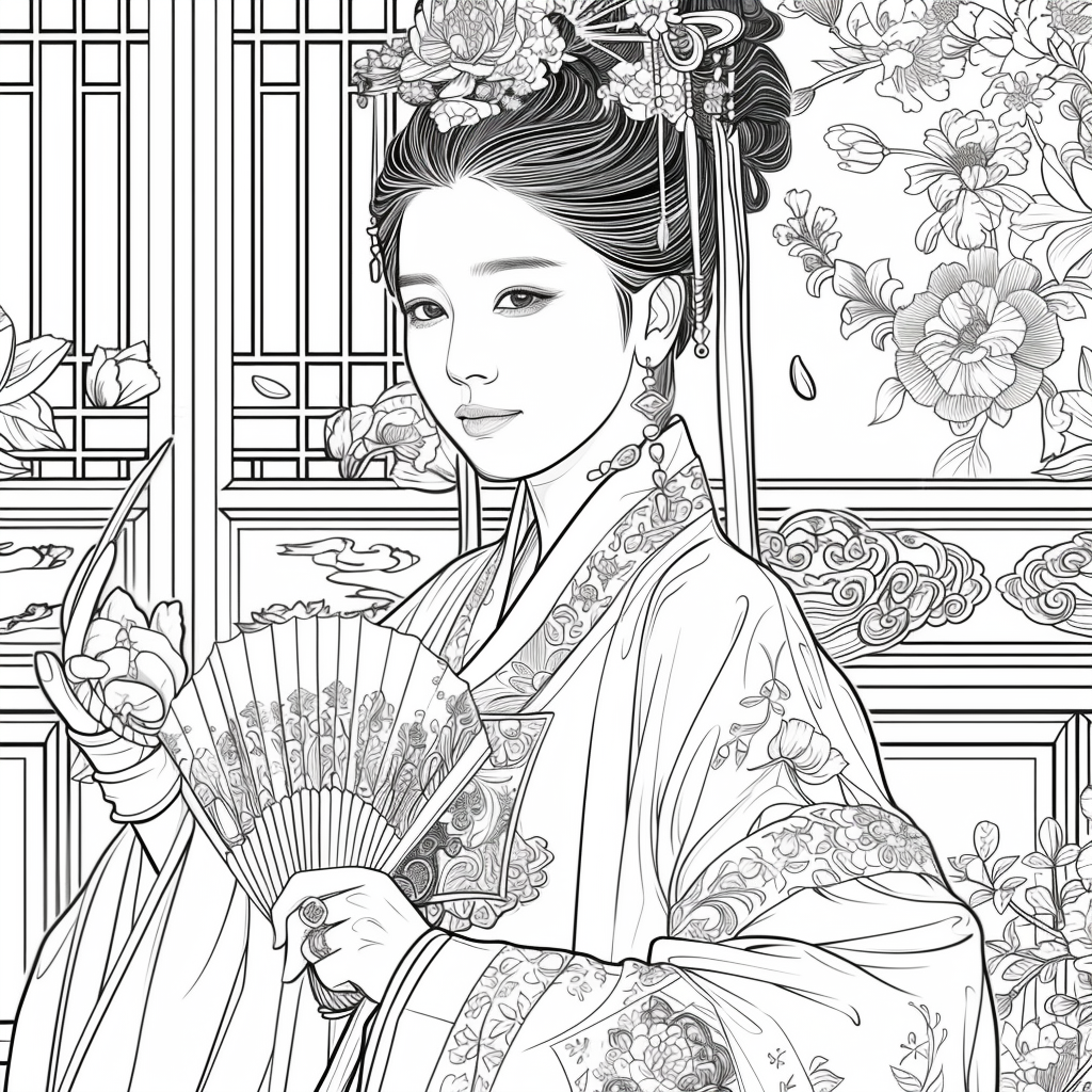 Bathed in the golden light of autumn, a Korean noblewoman stands poised with a graceful fan in her hands. Her hanbok glows in rich shades of crimson and gold, embroidered with intricate phoenix and floral motifs that symbolize power and harmony. Behind her, the lattice window frames falling leaves and warm amber hues, evoking the quiet beauty of a palace courtyard in late autumn. The delicate watercolor brushwork blends tradition and serenity, capturing both the strength and gentleness of feminine grace in the Joseon era.