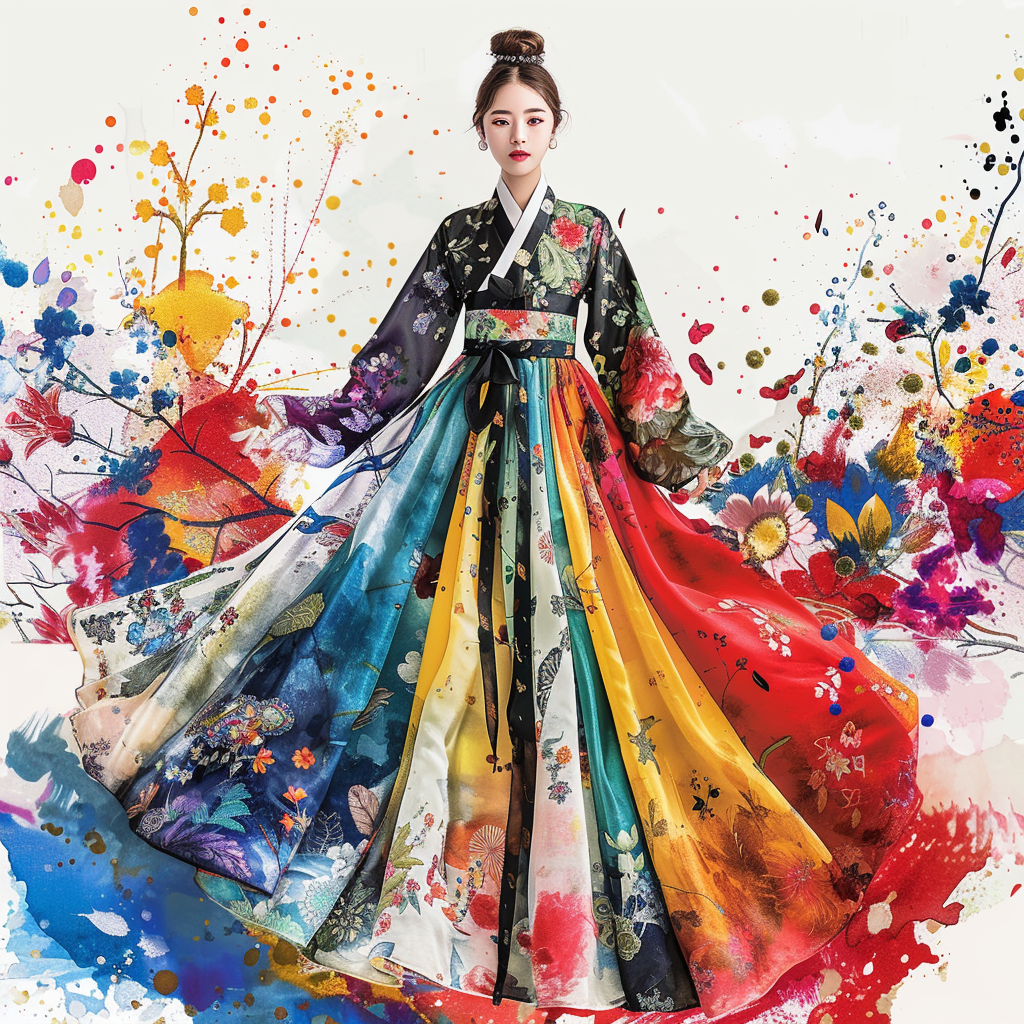 This captivating artwork showcases a striking woman in a modern reinterpretation of the traditional Korean hanbok. Her flowing gown bursts into a kaleidoscope of colors—deep blues, radiant yellows, fiery reds, and lush greens—each panel adorned with delicate floral patterns. The background blends watercolor splashes and blossoms, seamlessly merging fashion with abstract artistry. Symbolizing harmony between heritage and innovation, the piece captures both the timeless grace of Korean culture and the bold vibrancy of contemporary design.