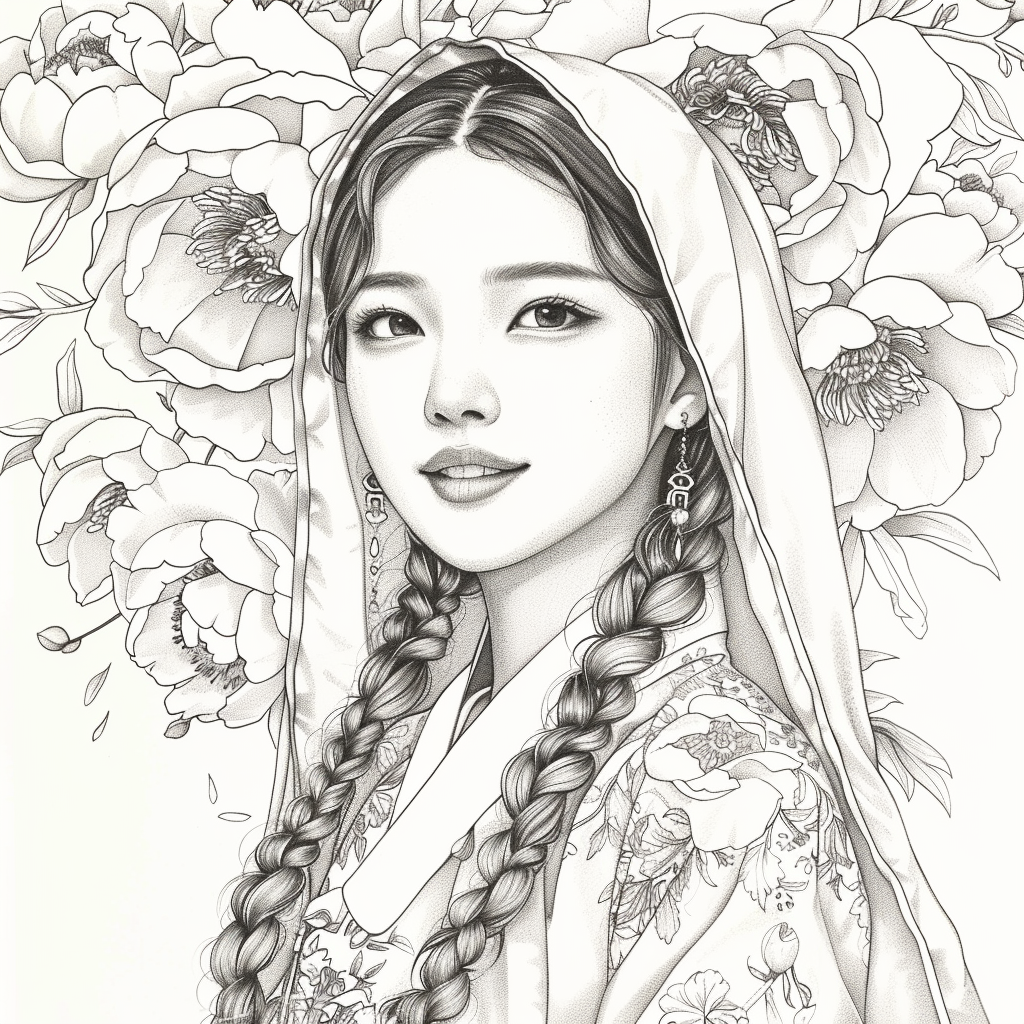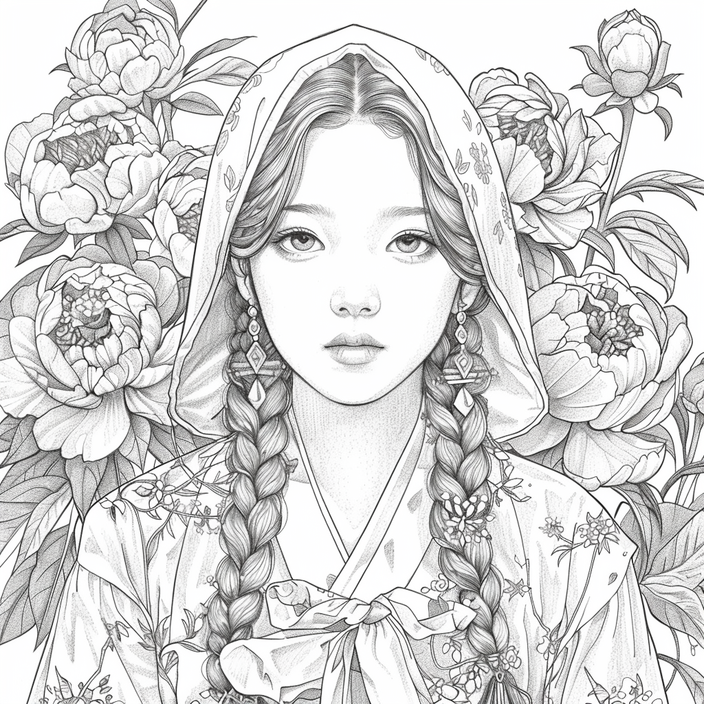 A serene Korean maiden stands before a magnificent backdrop of blooming peonies, her braided hair framed by an embroidered hood rich with intricate patterns and vibrant colors. The delicate details of her hanbok, adorned with floral motifs and ornate stitching, complement the soft radiance of her gentle expression. Layers of watercolor textures blend harmoniously with the lush petals behind her, creating a portrait that celebrates grace, tradition, and the timeless beauty of spring flowers.