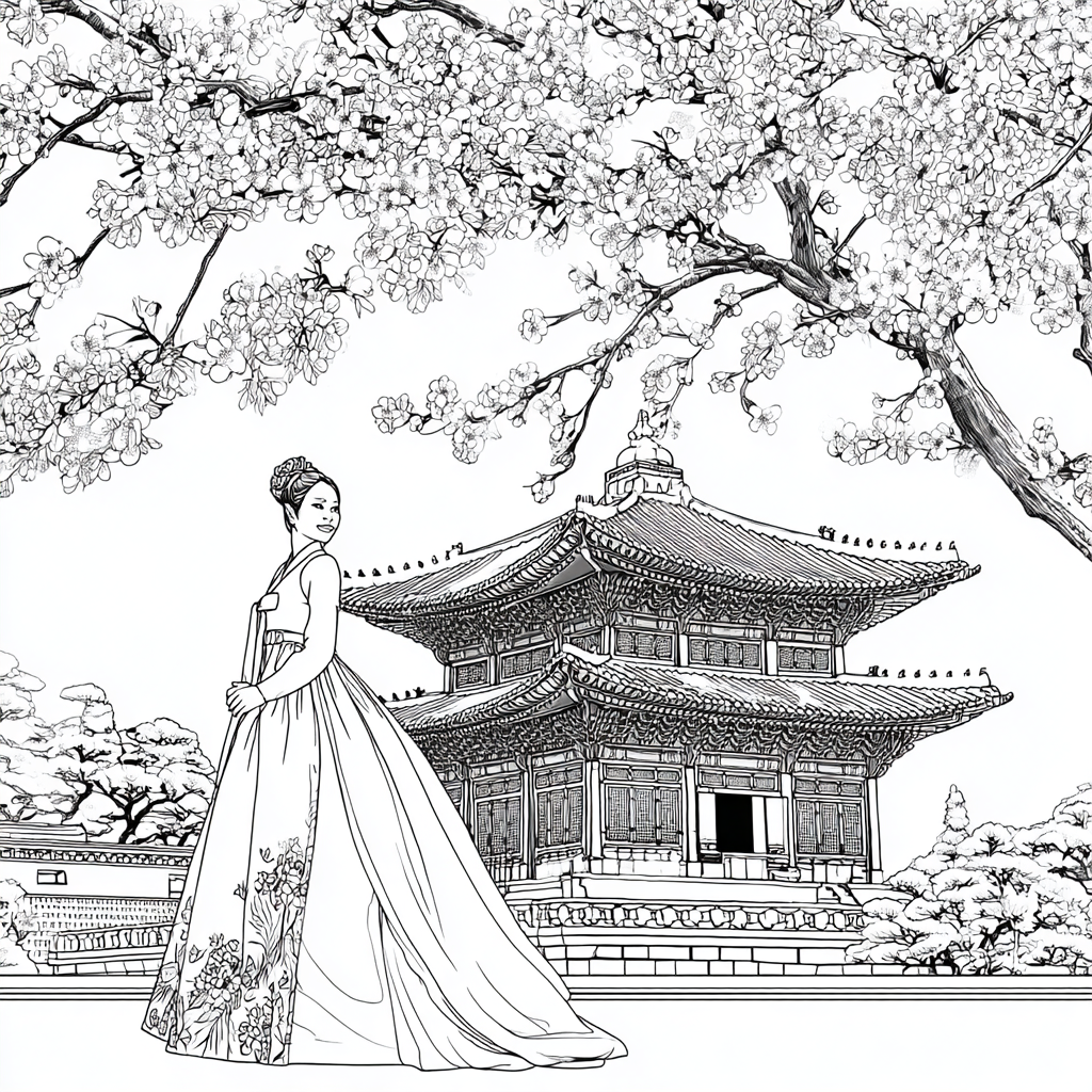 A graceful Korean woman in a vibrant hanbok strolls beneath blooming cherry blossoms, her figure illuminated by the warm glow of a traditional palace in the background. The scene is painted in radiant watercolor, where soft pink petals cascade through the air, blending with the pastel sky to create a dreamy atmosphere. This artwork captures the harmony of nature, tradition, and timeless beauty, evoking a sense of peace and poetic elegance.
