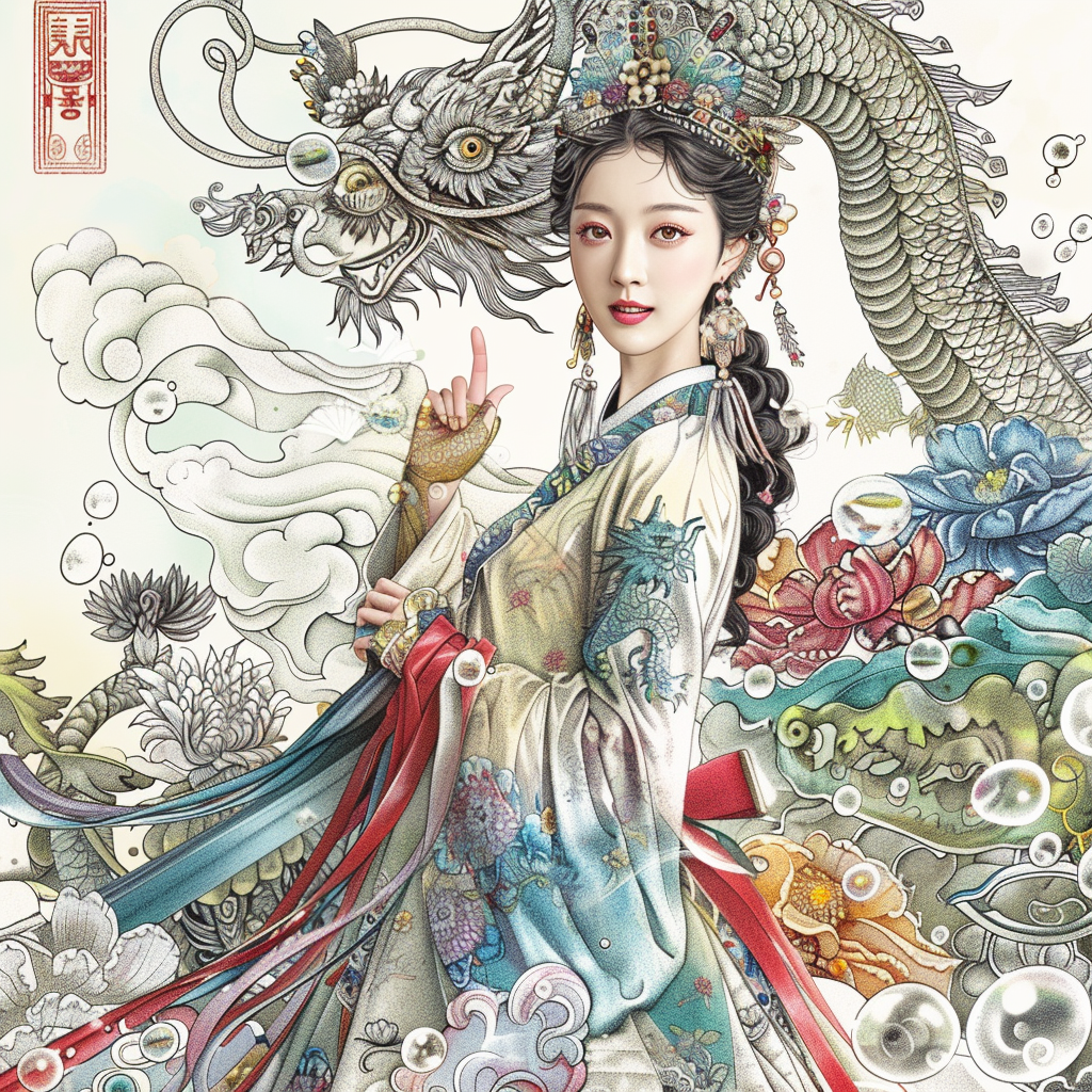 This artwork presents a radiant Korean princess clothed in a flowing hanbok adorned with embroidered dragons and floral motifs, symbolizing strength, nobility, and harmony. Her elaborate jeweled crown and earrings glimmer with regal elegance, while her gentle smile conveys both warmth and authority. Behind her rises a majestic dragon, surrounded by clouds and lotus blossoms, embodying wisdom, protection, and divine power. The colorful waves, vibrant flowers, and floating bubbles create a dreamlike aura that merges myth and beauty. This composition captures the essence of legendary guardianship—where the princess stands as both a protector of tradition and a beacon of hope.