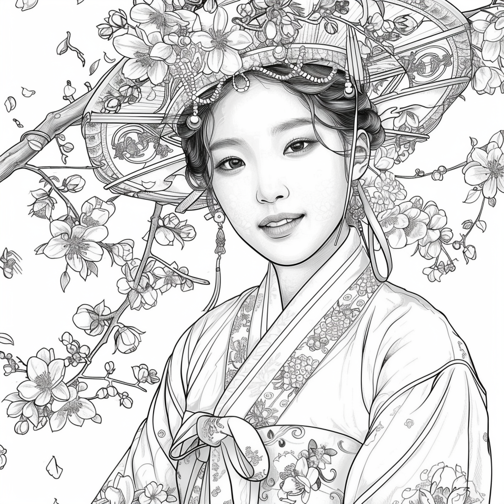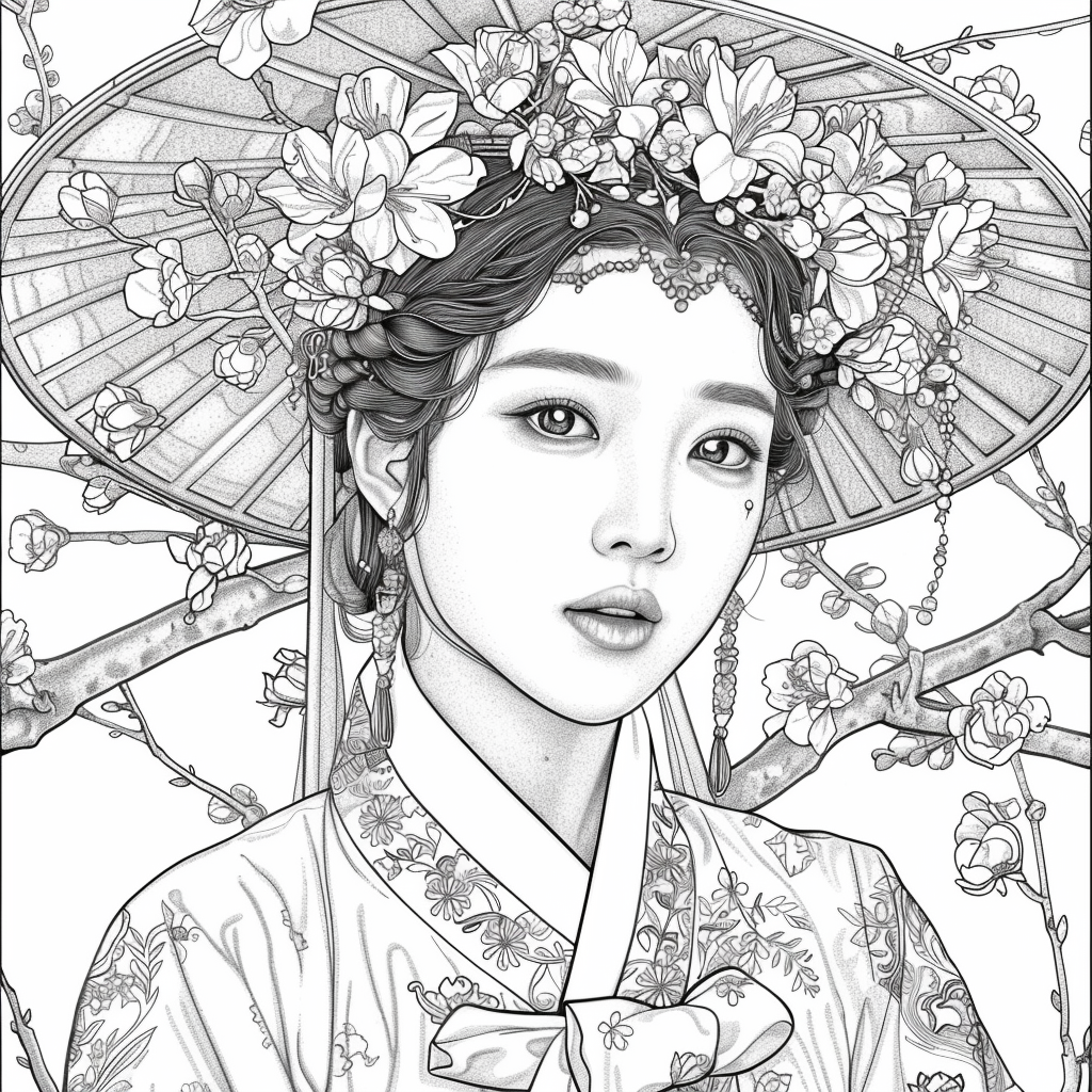 A graceful woman dressed in a richly embroidered hanbok sits among blossoming branches, her serene gaze reflecting both poise and quiet strength. The vivid crimson and deep sapphire hues of her attire, adorned with floral and mythical patterns, symbolize vitality and dignity. Her ornate hat, decorated with intricate designs and flowers, harmonizes with the delicate blossoms around her, creating a portrait that celebrates beauty, tradition, and the timeless harmony between humanity and nature.