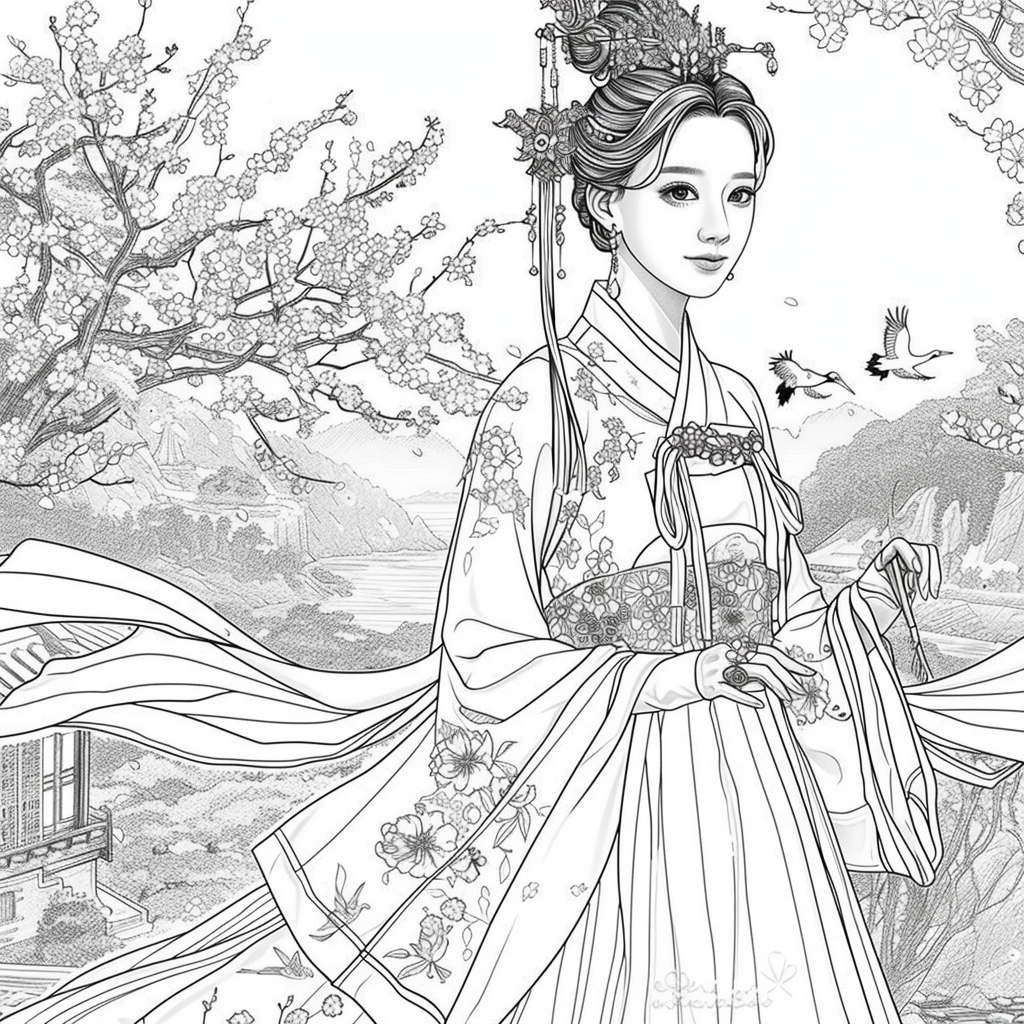 A graceful woman dressed in a richly embroidered hanbok stands on a palace terrace, her gaze serene as cherry blossoms drift through the air. Her gown flows with vibrant patterns of peonies, butterflies, and intricate motifs, blending traditional artistry with dreamlike elegance. Behind her, a waterfall cascades gently through the palace gardens, framed by tiled rooftops and autumn trees. Cranes soar gracefully across the sky, symbolizing longevity and harmony. This artwork captures the timeless beauty of Korean tradition, weaving together nature, architecture, and cultural splendor in a luminous watercolor composition.
