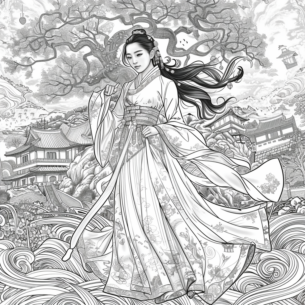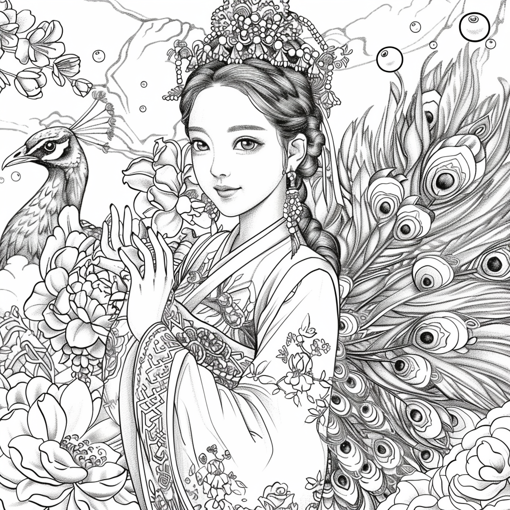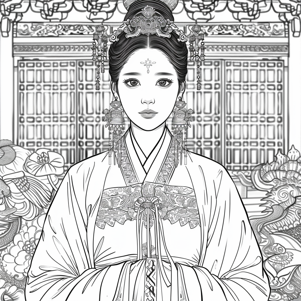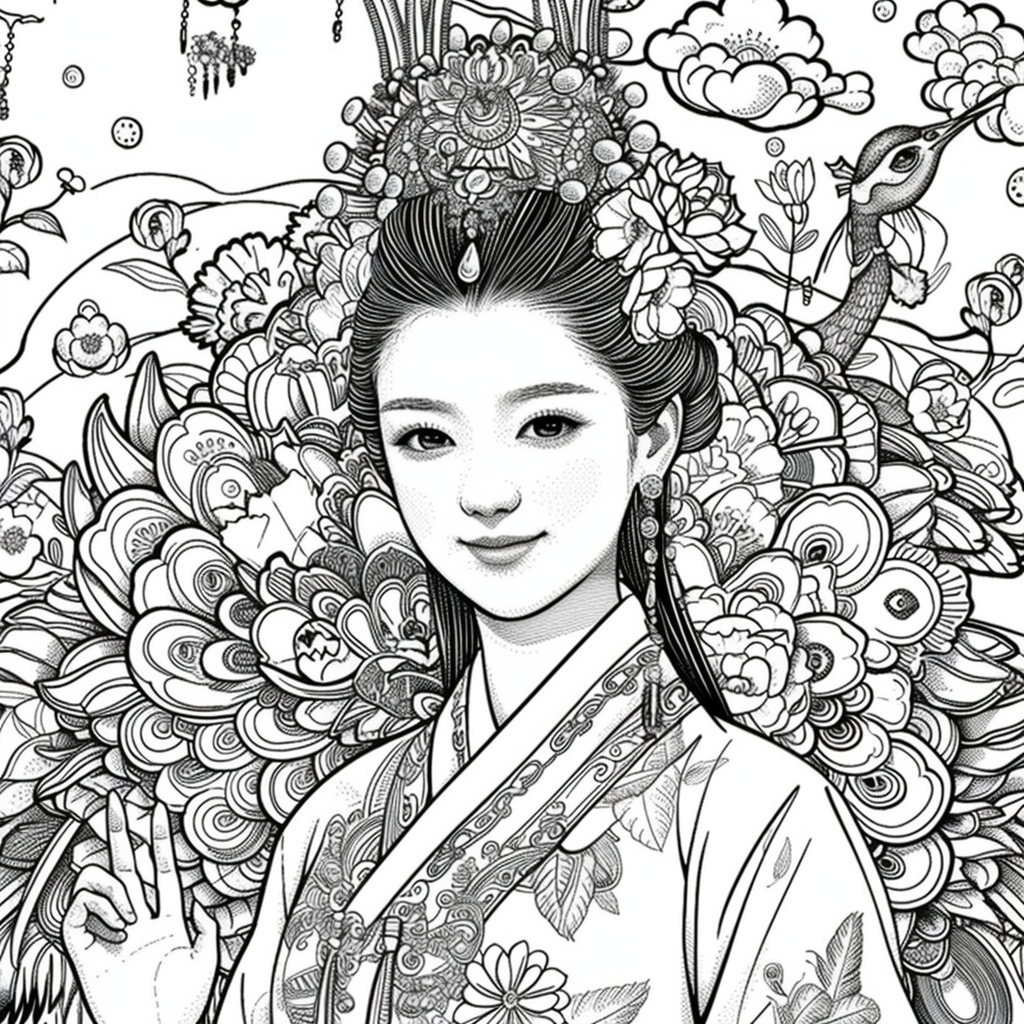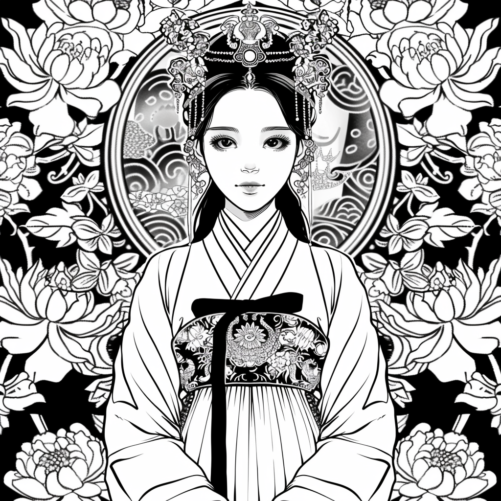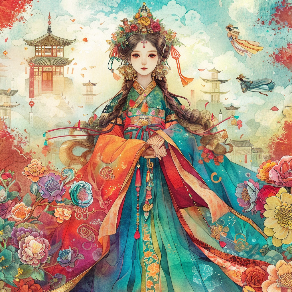 Crowned in golden finery and clothed in a radiant hanbok of turquoise, crimson, and amber, the empress stands as the heart of a heavenly kingdom. Her braided hair flows like ink strokes through a dreamy sky filled with floating maidens, cherry petals, and distant temples rising from the clouds. Surrounding her, a bloom of fantastical florals mirrors her divine presence—each petal an offering to her grace. She is the guardian of balance between earth and heavens, the embodiment of regal beauty, wisdom, and myth.