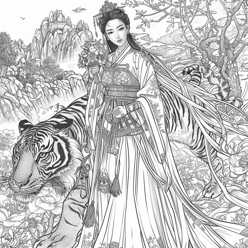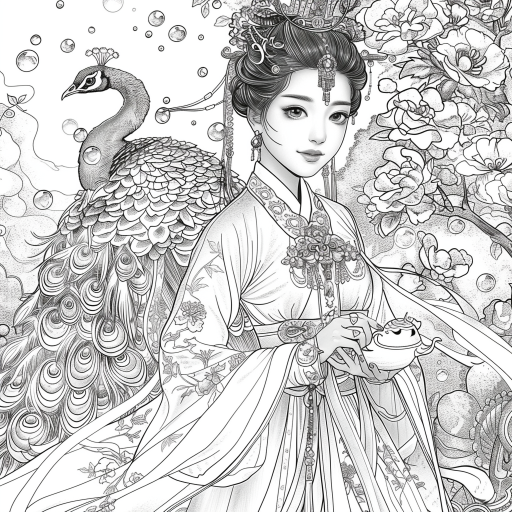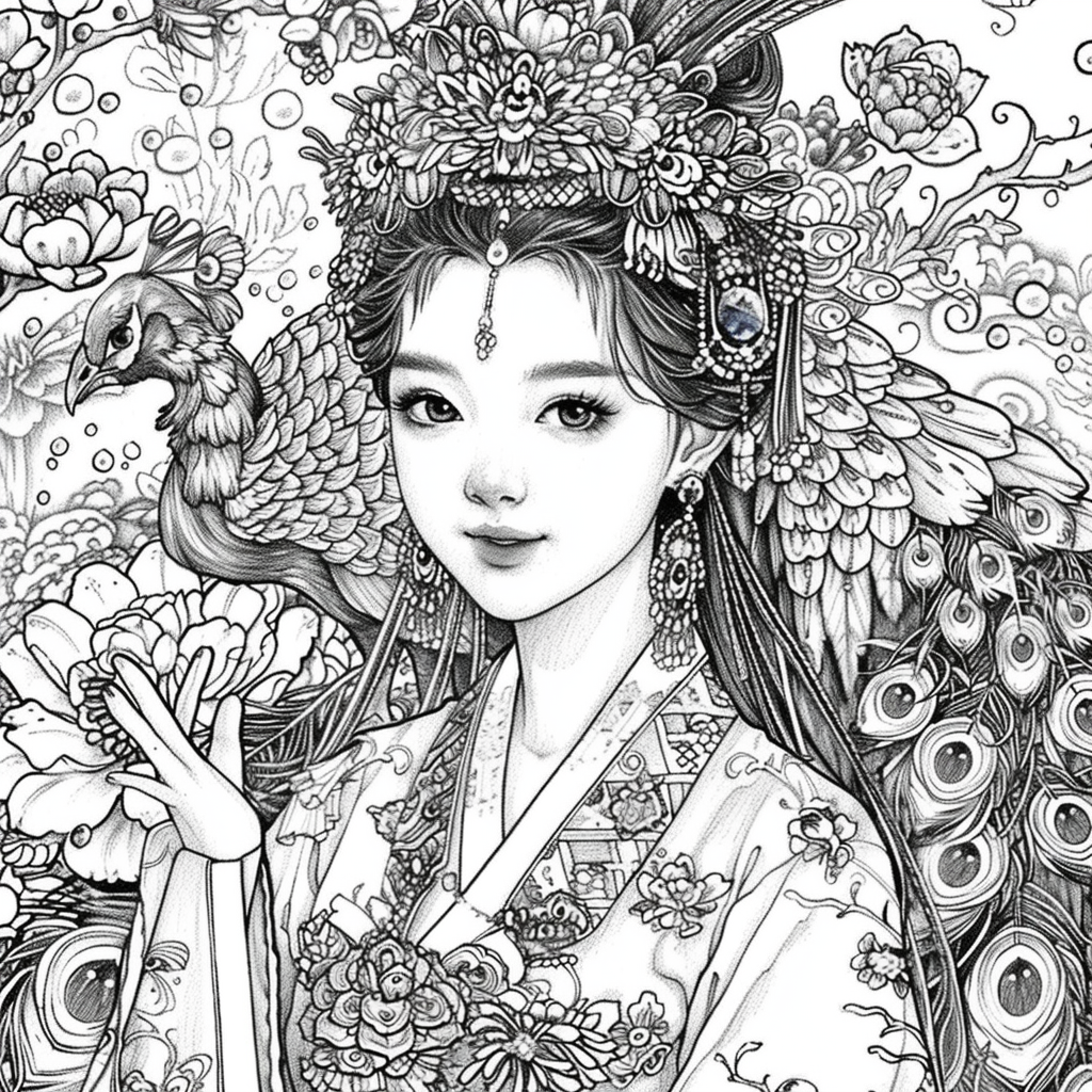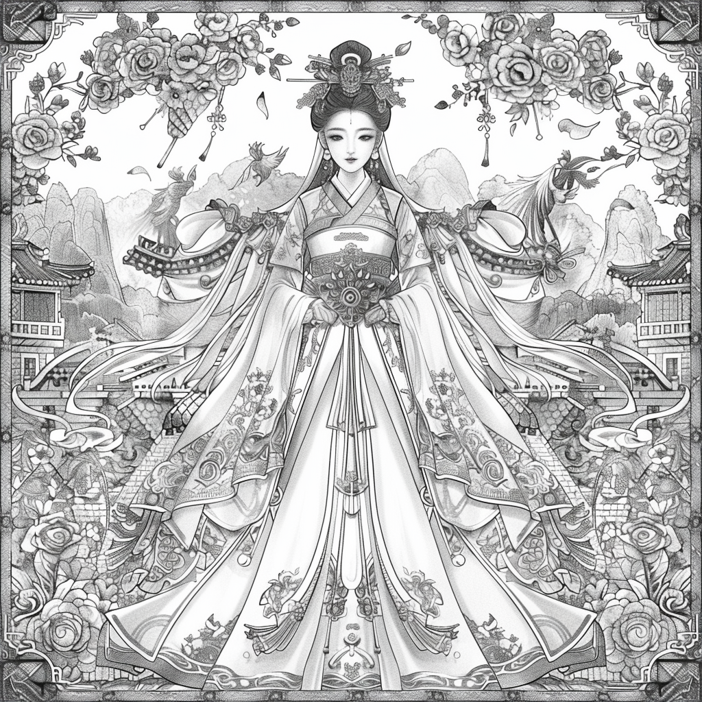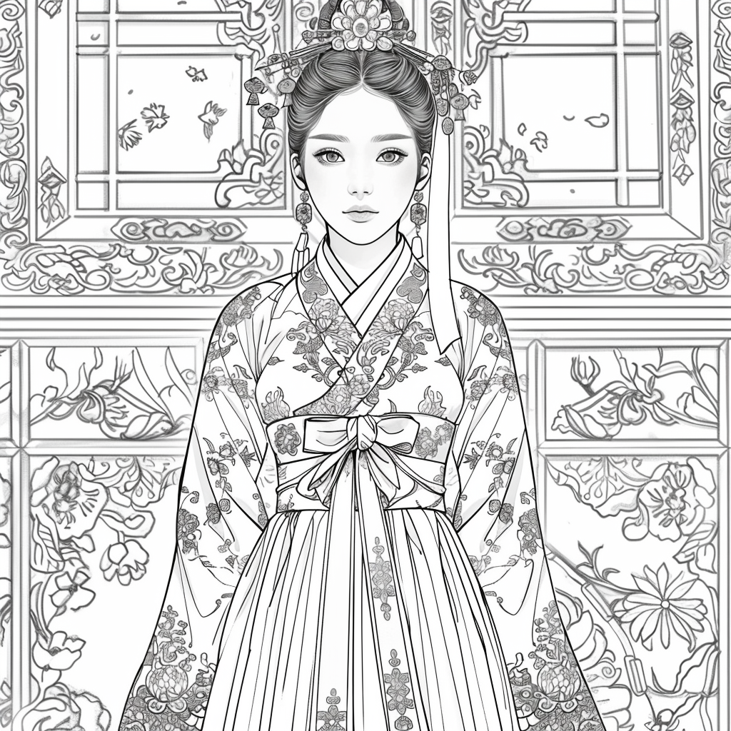Crowned in golden finery and clothed in a radiant hanbok of turquoise, crimson, and amber, the empress stands as the heart of a heavenly kingdom. Her braided hair flows like ink strokes through a dreamy sky filled with floating maidens, cherry petals, and distant temples rising from the clouds. Surrounding her, a bloom of fantastical florals mirrors her divine presence—each petal an offering to her grace. She is the guardian of balance between earth and heavens, the embodiment of regal beauty, wisdom, and myth.
