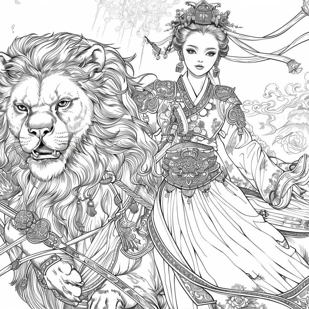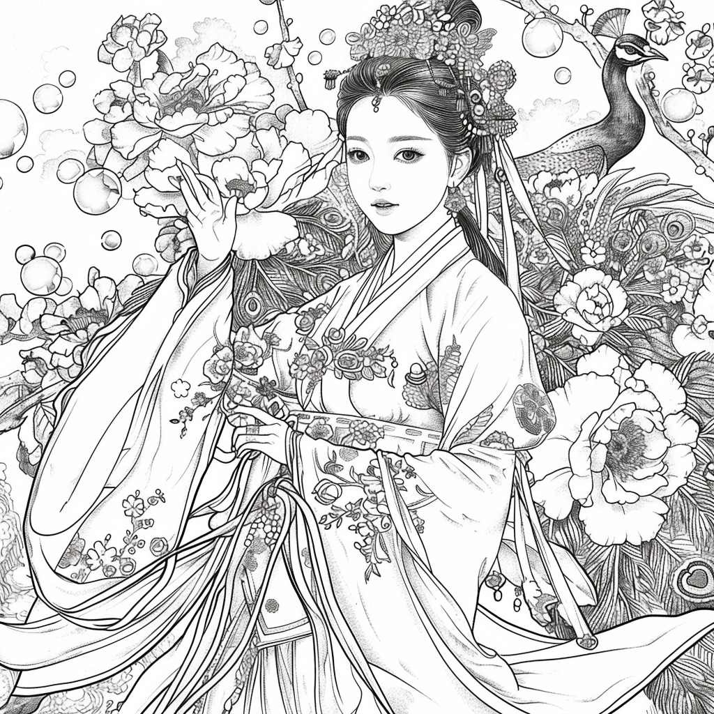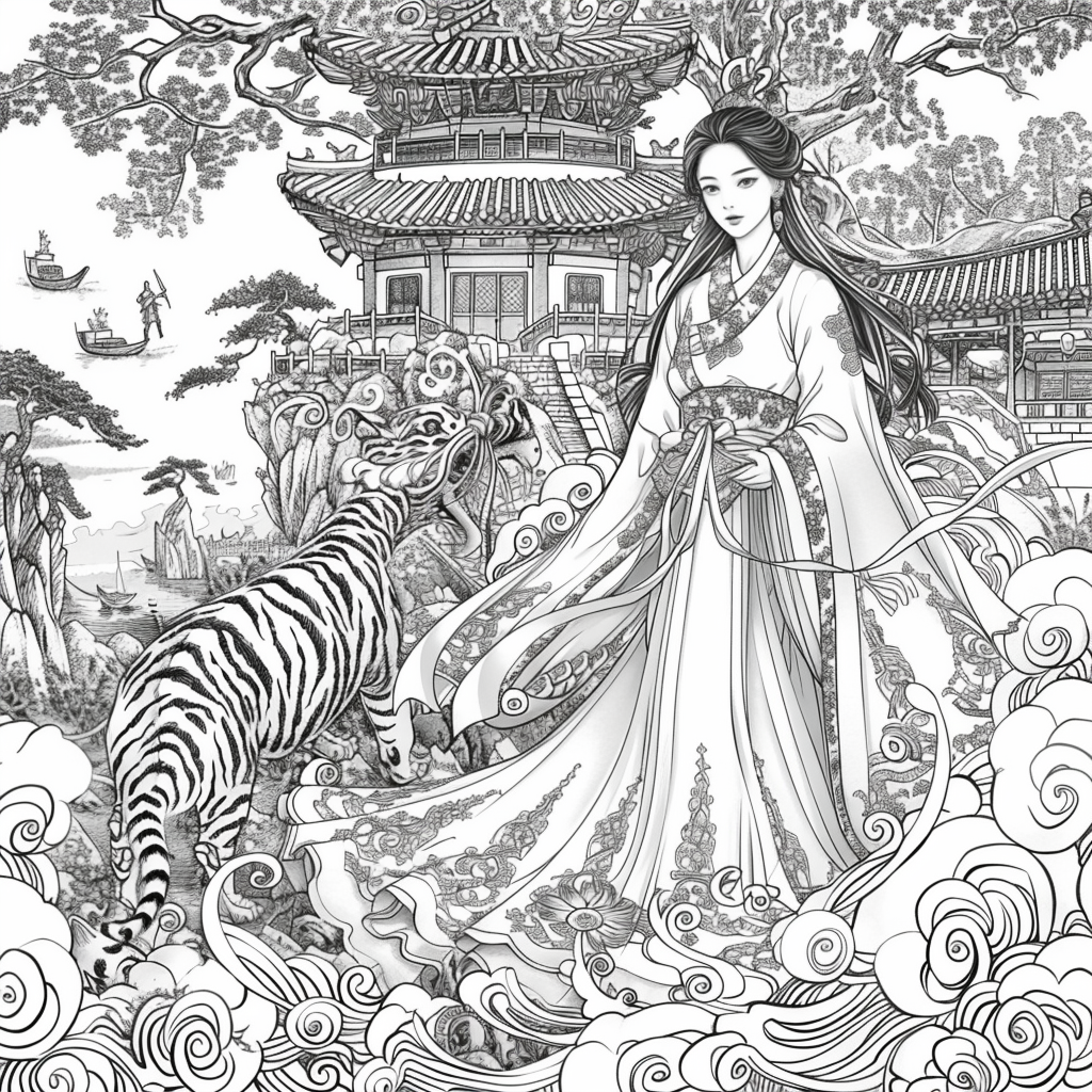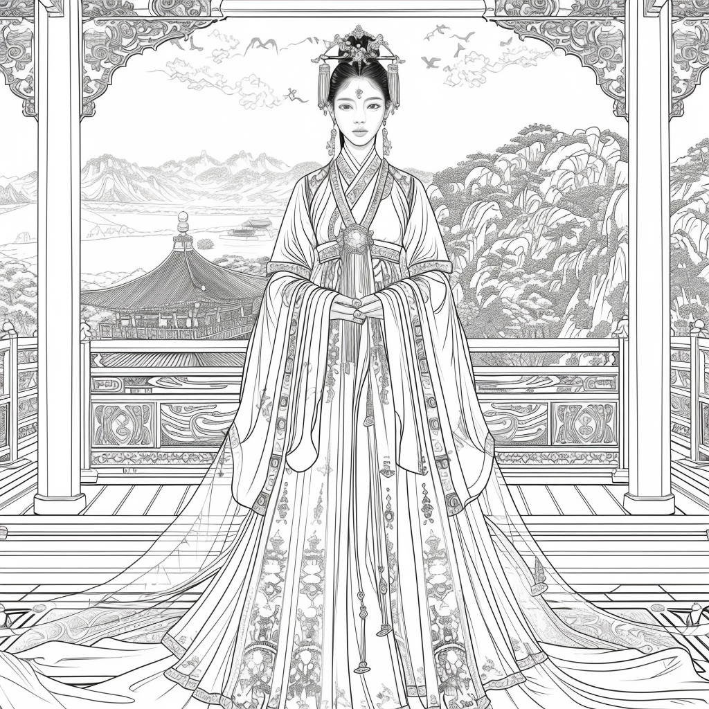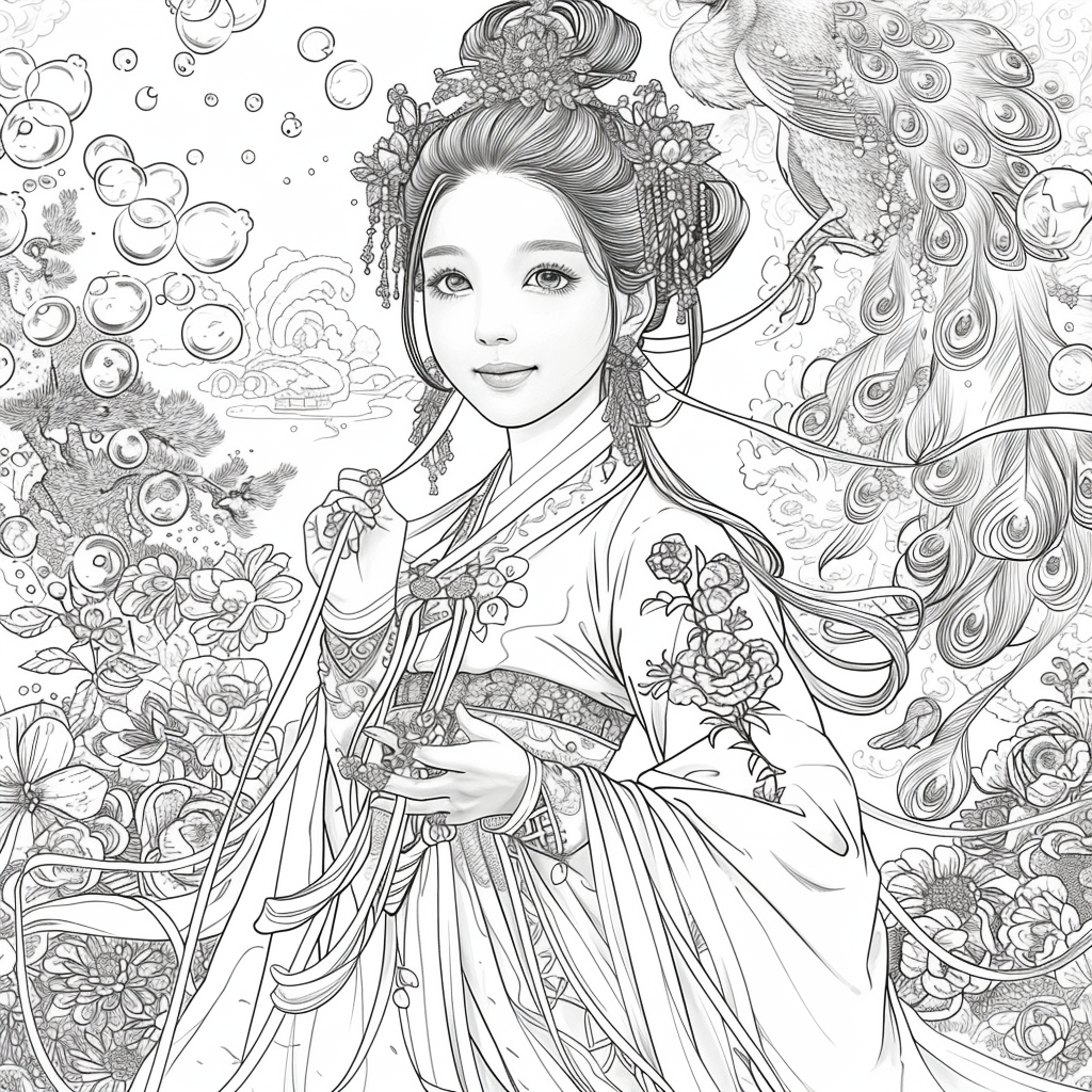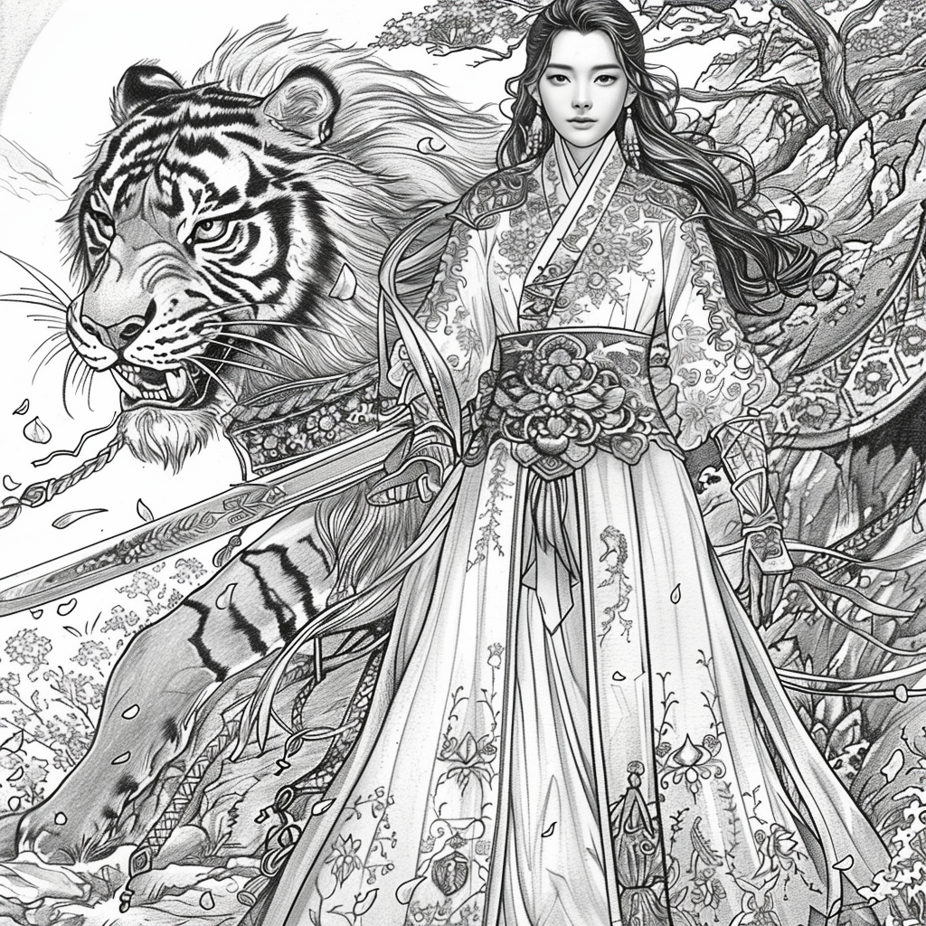 Crowned in golden finery and clothed in a radiant hanbok of turquoise, crimson, and amber, the empress stands as the heart of a heavenly kingdom. Her braided hair flows like ink strokes through a dreamy sky filled with floating maidens, cherry petals, and distant temples rising from the clouds. Surrounding her, a bloom of fantastical florals mirrors her divine presence—each petal an offering to her grace. She is the guardian of balance between earth and heavens, the embodiment of regal beauty, wisdom, and myth.