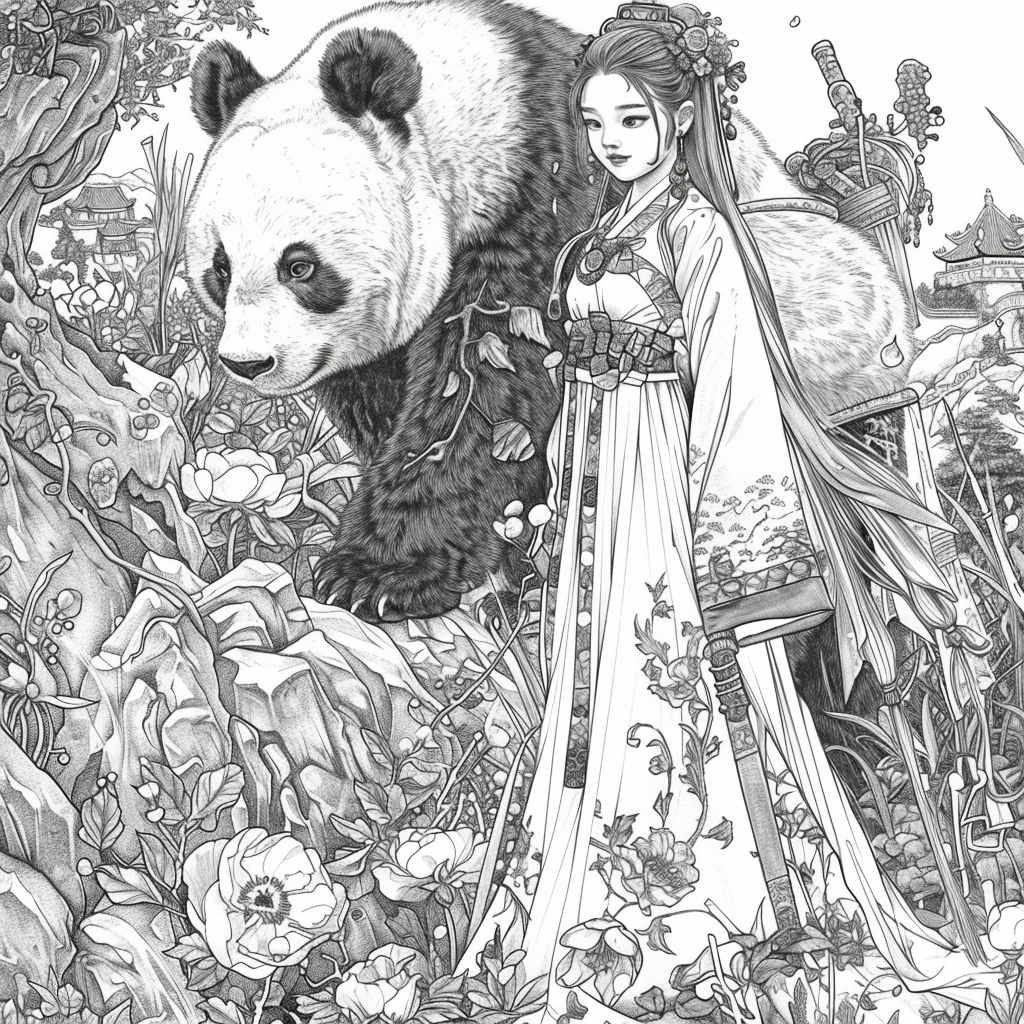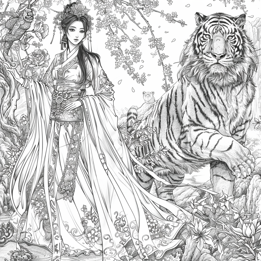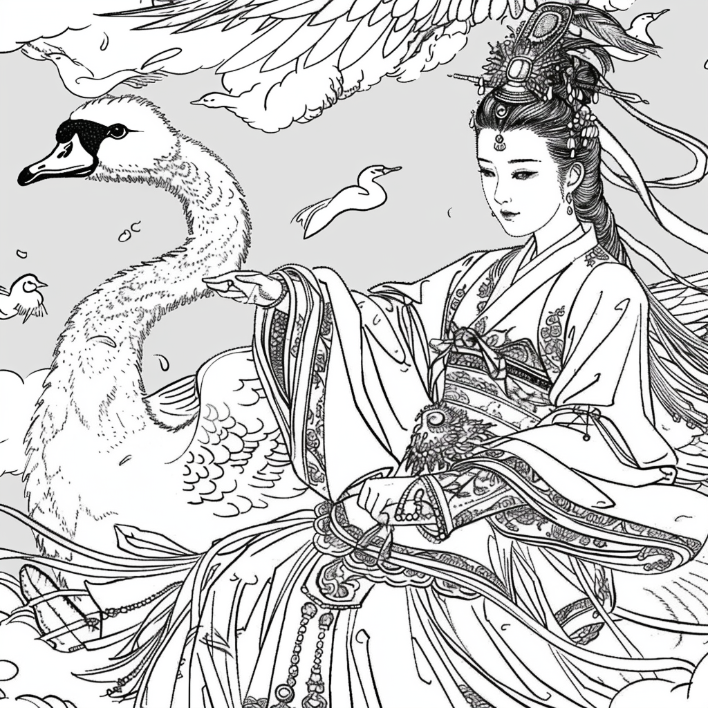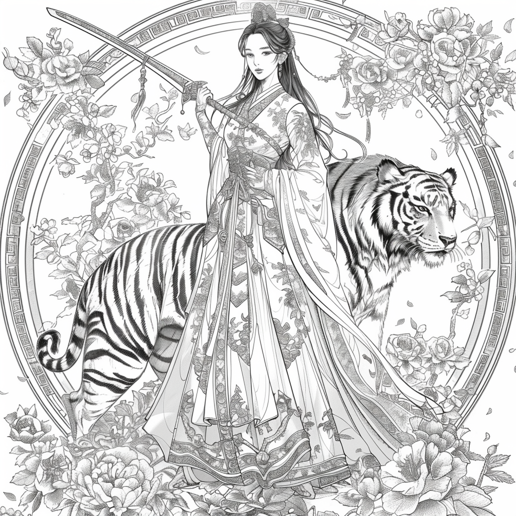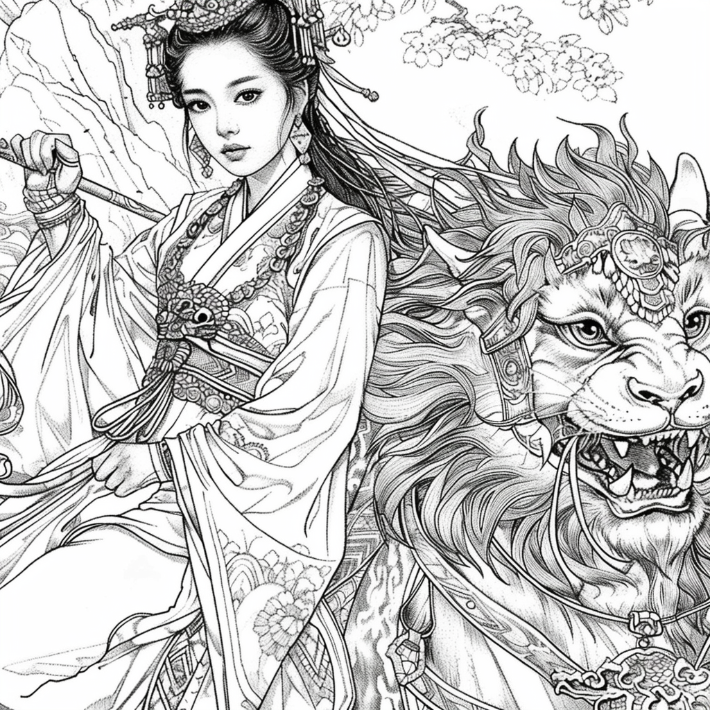 Crowned in golden finery and clothed in a radiant hanbok of turquoise, crimson, and amber, the empress stands as the heart of a heavenly kingdom. Her braided hair flows like ink strokes through a dreamy sky filled with floating maidens, cherry petals, and distant temples rising from the clouds. Surrounding her, a bloom of fantastical florals mirrors her divine presence—each petal an offering to her grace. She is the guardian of balance between earth and heavens, the embodiment of regal beauty, wisdom, and myth.