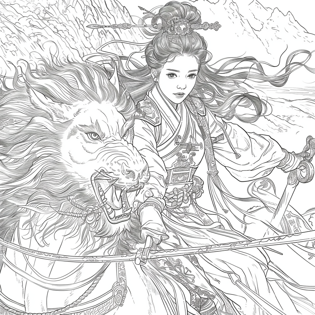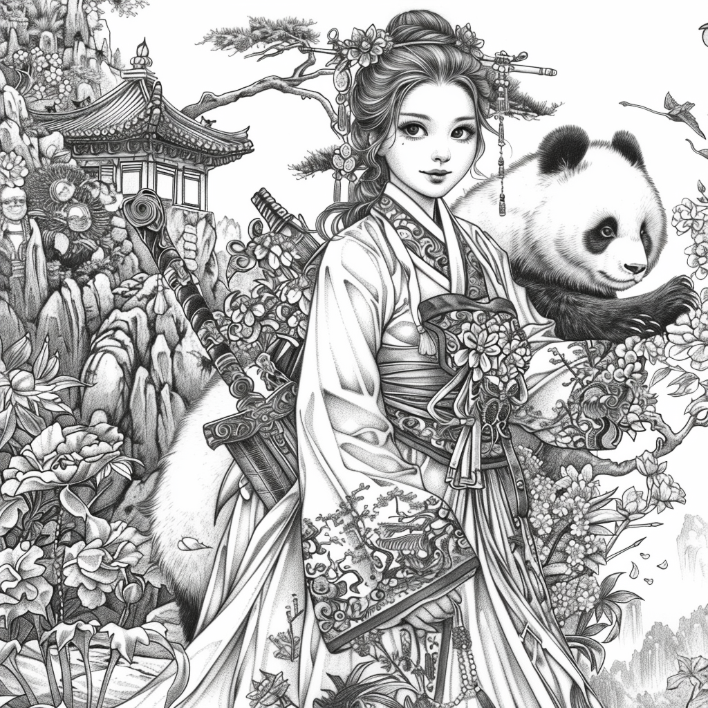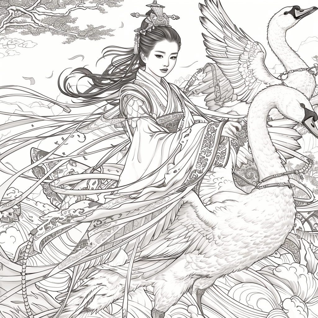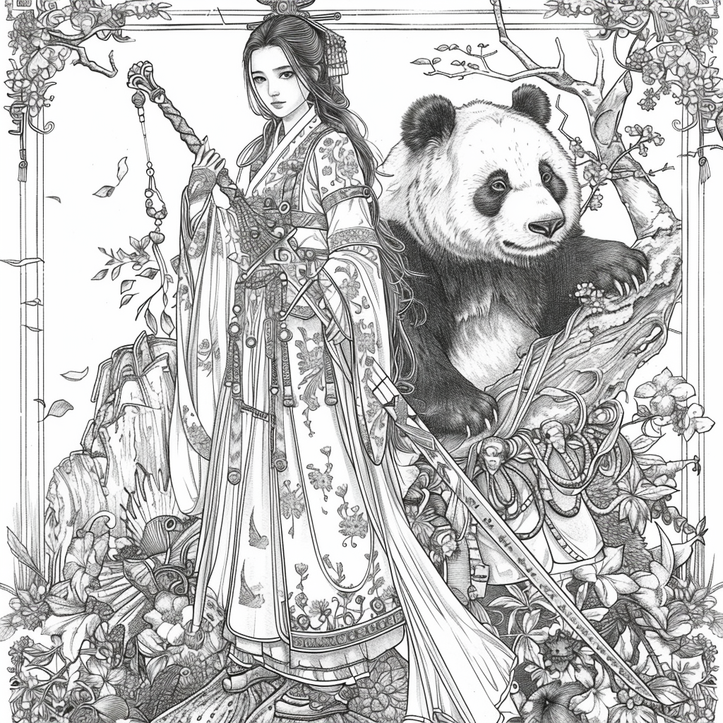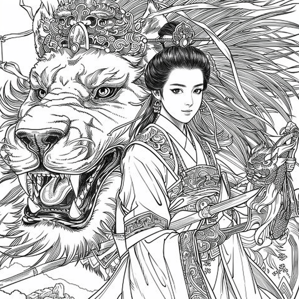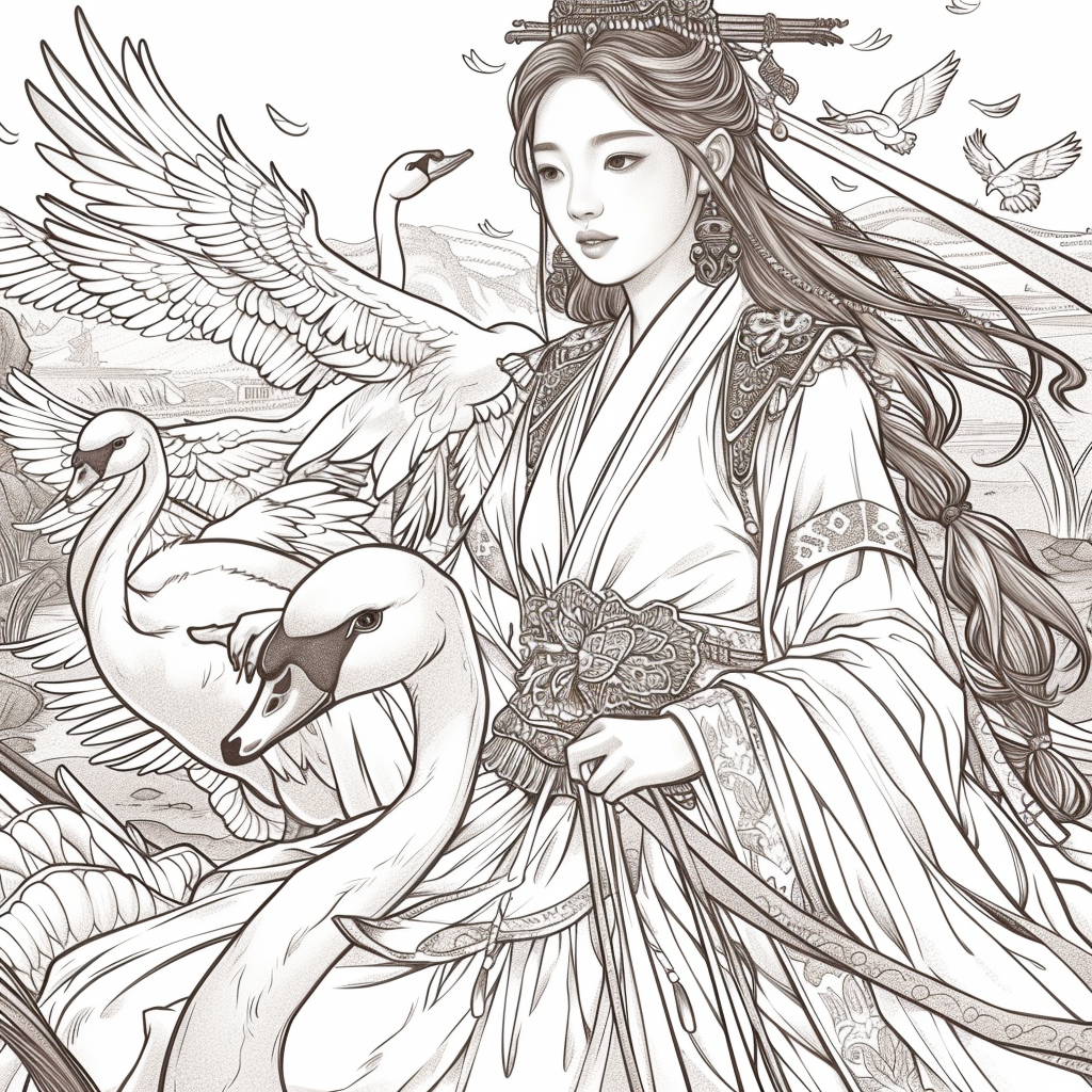 Crowned in golden finery and clothed in a radiant hanbok of turquoise, crimson, and amber, the empress stands as the heart of a heavenly kingdom. Her braided hair flows like ink strokes through a dreamy sky filled with floating maidens, cherry petals, and distant temples rising from the clouds. Surrounding her, a bloom of fantastical florals mirrors her divine presence—each petal an offering to her grace. She is the guardian of balance between earth and heavens, the embodiment of regal beauty, wisdom, and myth.