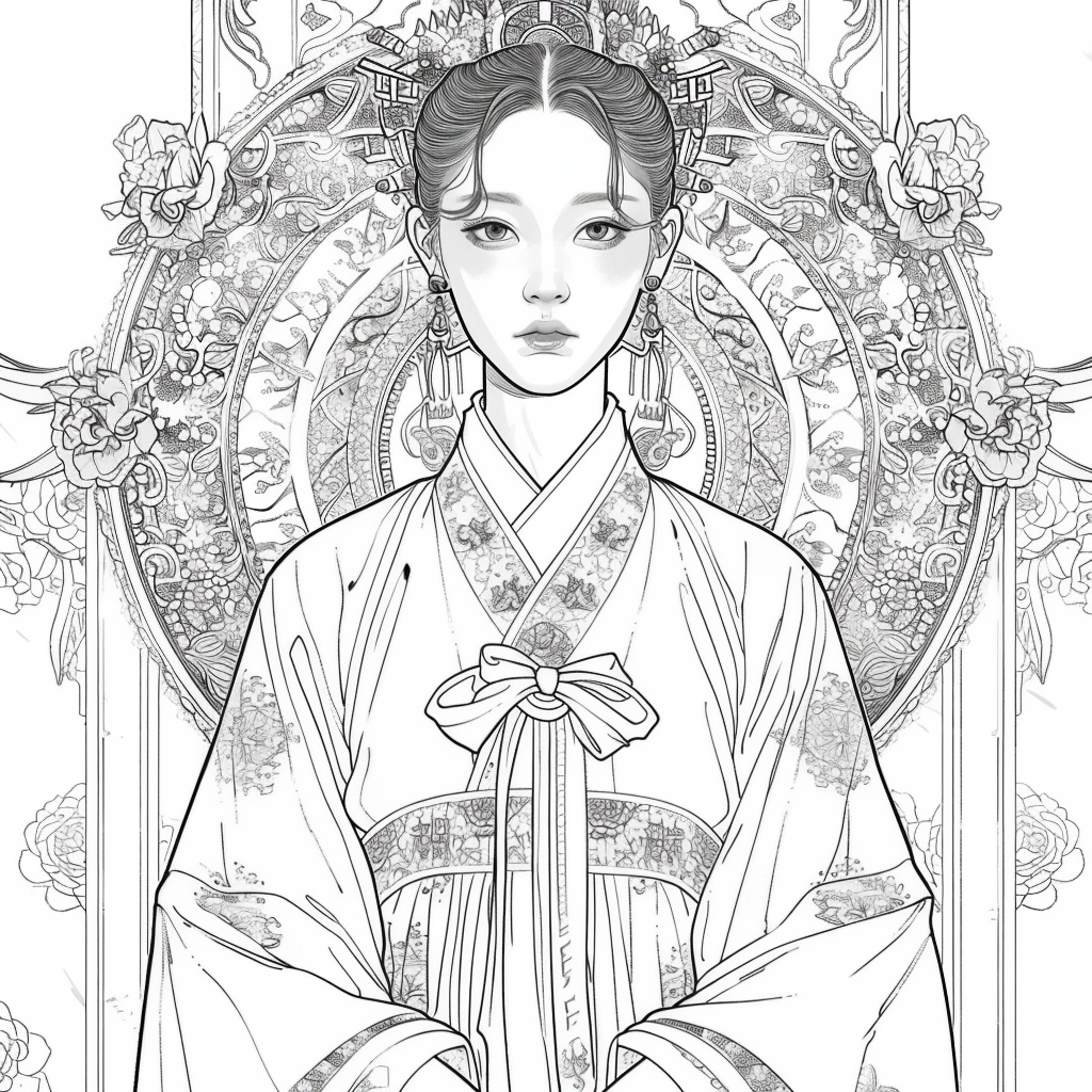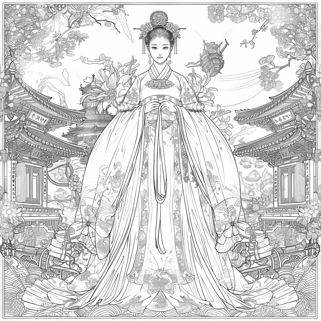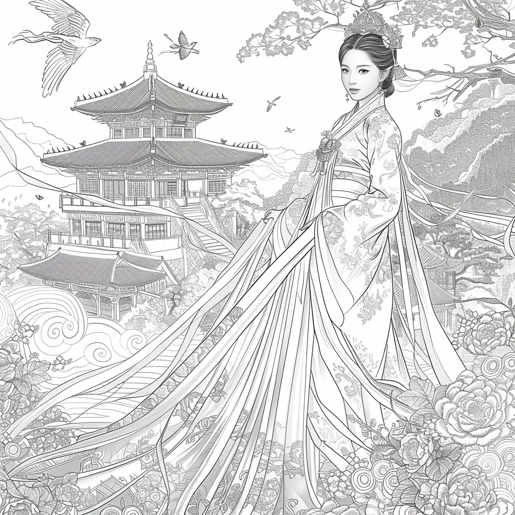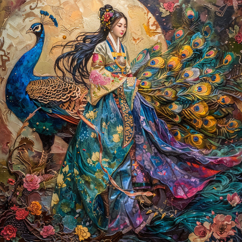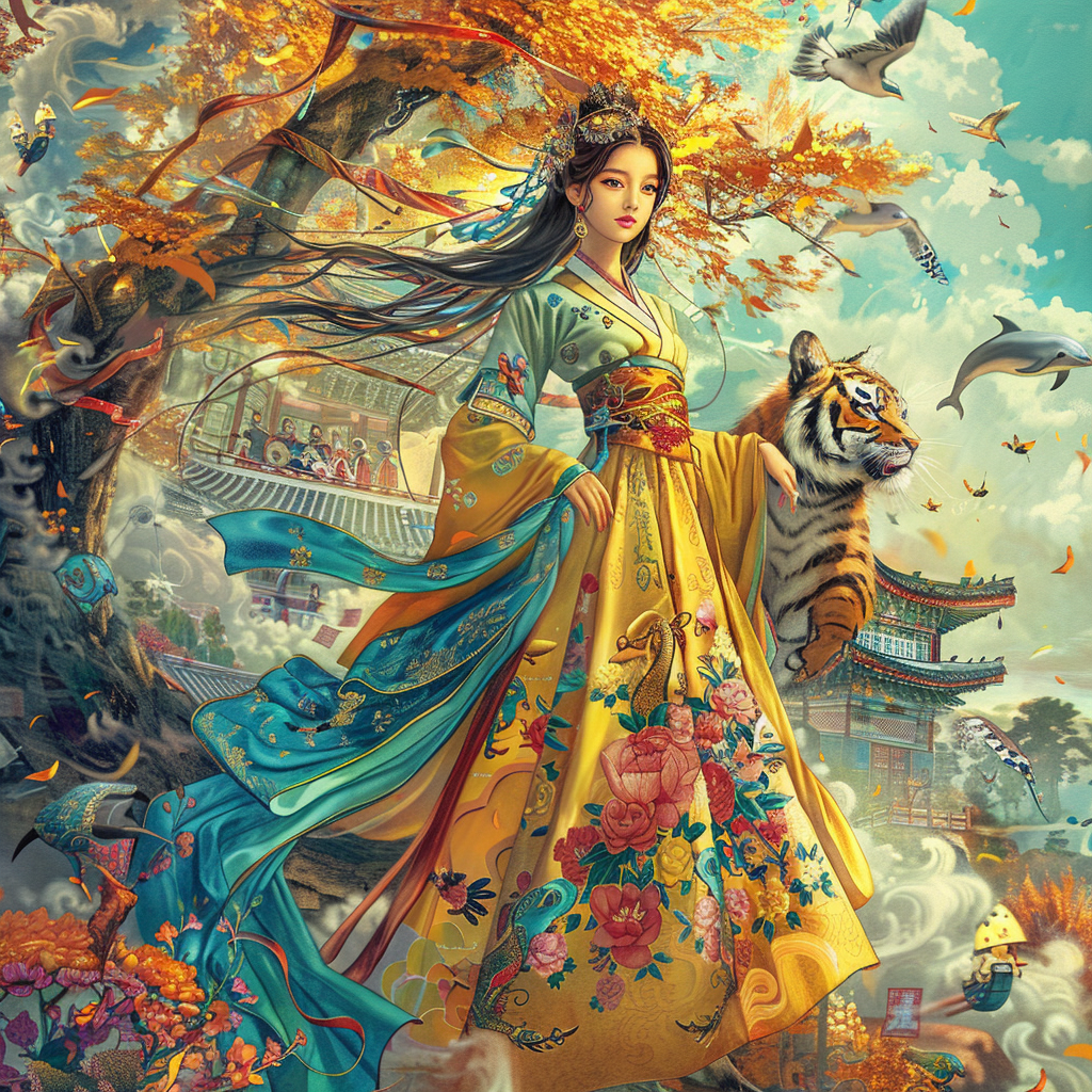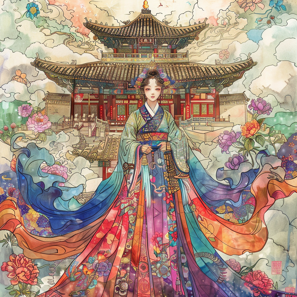 A radiant empress stands gracefully before a grand Joseon-era palace, her robe cascading in luminous waves of rainbow hues. The hanbok is richly adorned with intricate patterns of phoenixes, peonies, waves, and ancient symbols, blending natural forces with royal iconography. Behind her, the palace soars into dreamy clouds and blooming skies, evoking a timeless fantasy of cultural majesty. She embodies harmony, strength, and the spirit of Korea’s golden heritage, uniting architecture, tradition, and nature in one breathtaking tableau.