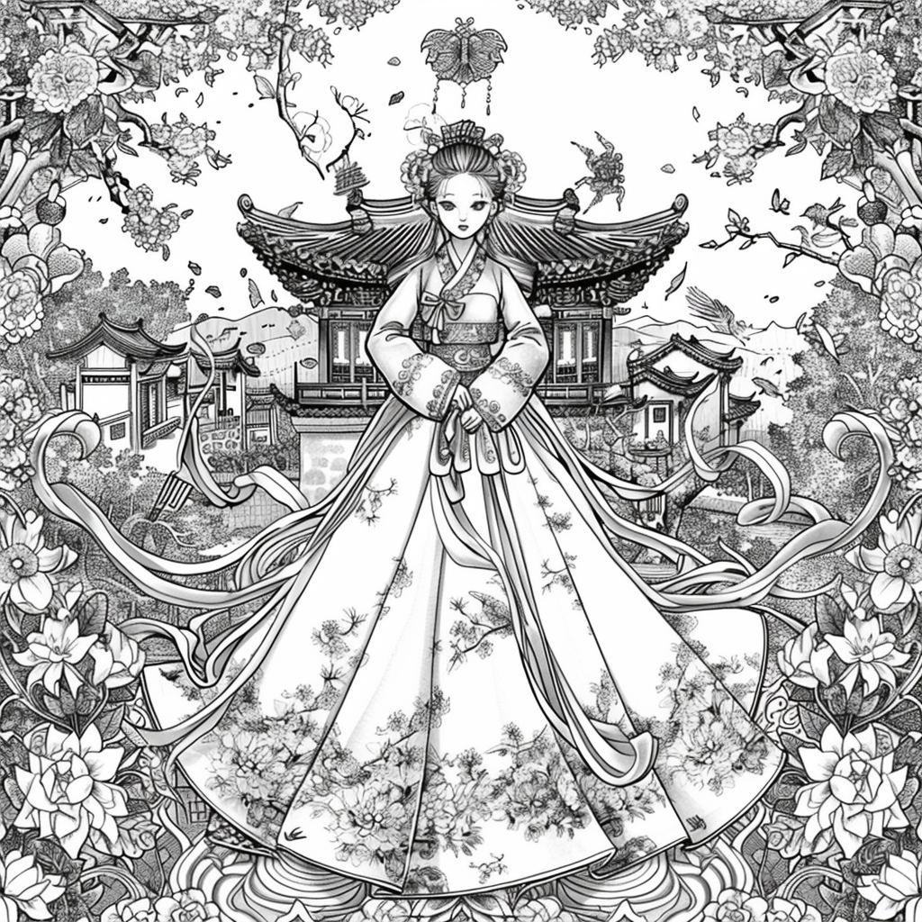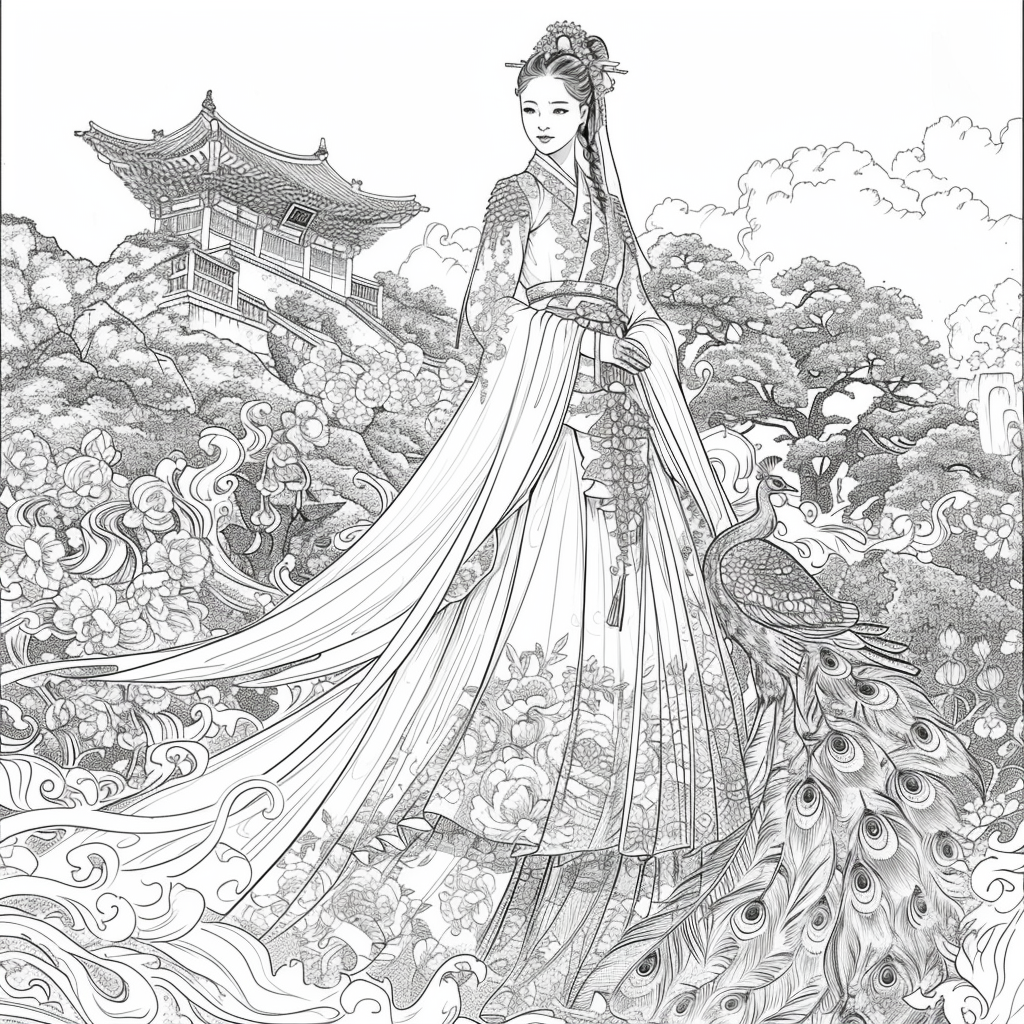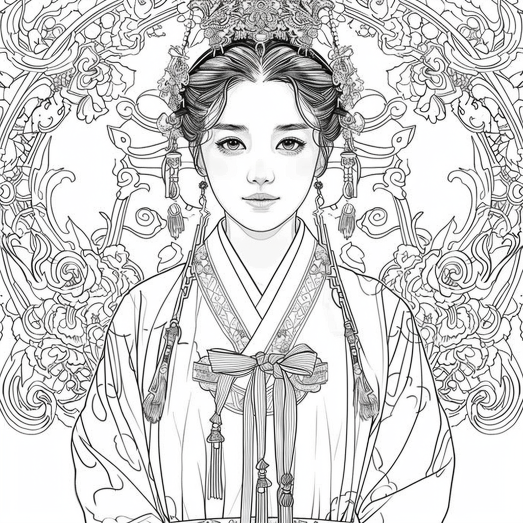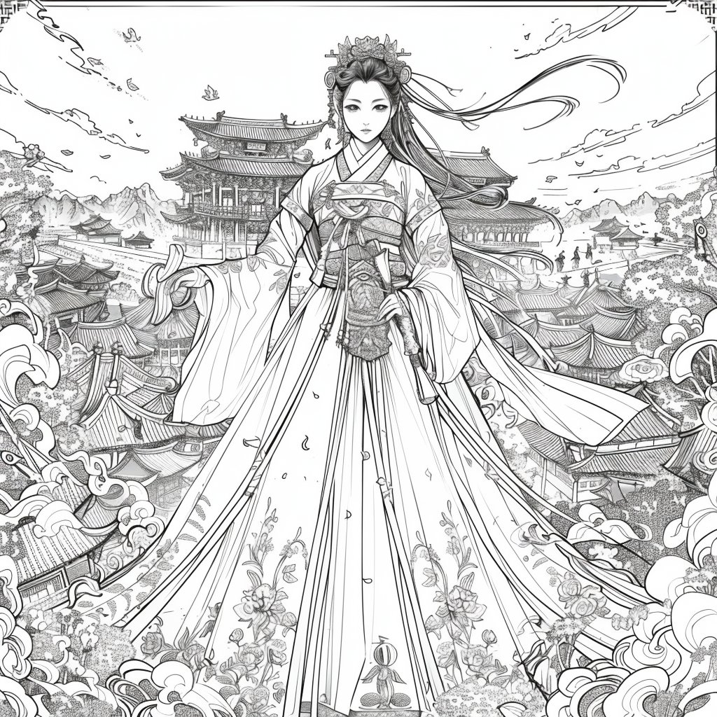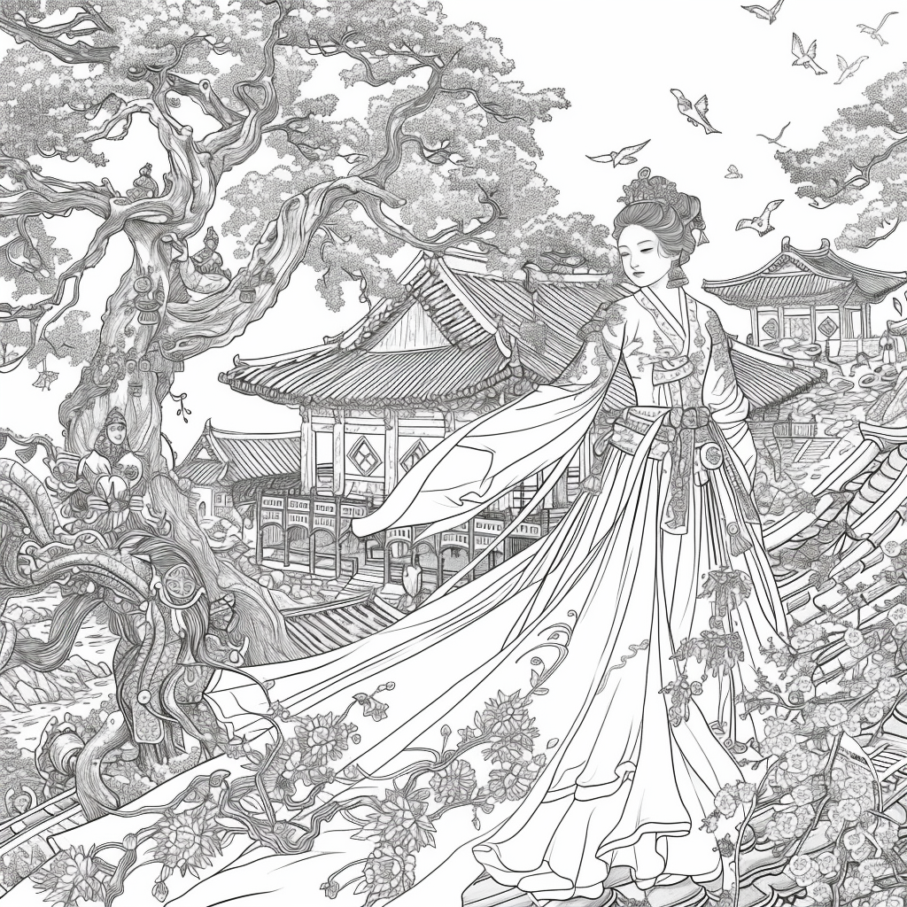 A radiant empress stands gracefully before a grand Joseon-era palace, her robe cascading in luminous waves of rainbow hues. The hanbok is richly adorned with intricate patterns of phoenixes, peonies, waves, and ancient symbols, blending natural forces with royal iconography. Behind her, the palace soars into dreamy clouds and blooming skies, evoking a timeless fantasy of cultural majesty. She embodies harmony, strength, and the spirit of Korea’s golden heritage, uniting architecture, tradition, and nature in one breathtaking tableau.