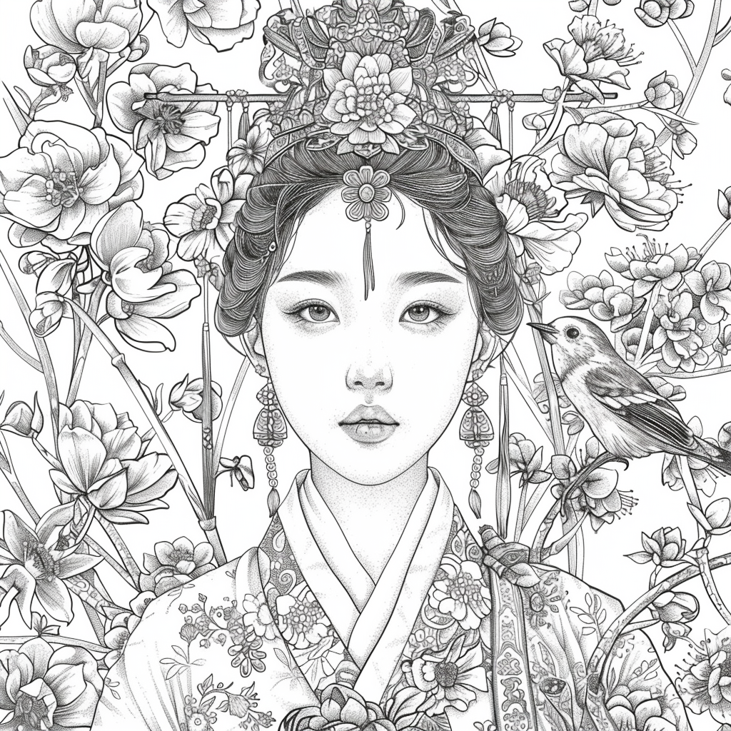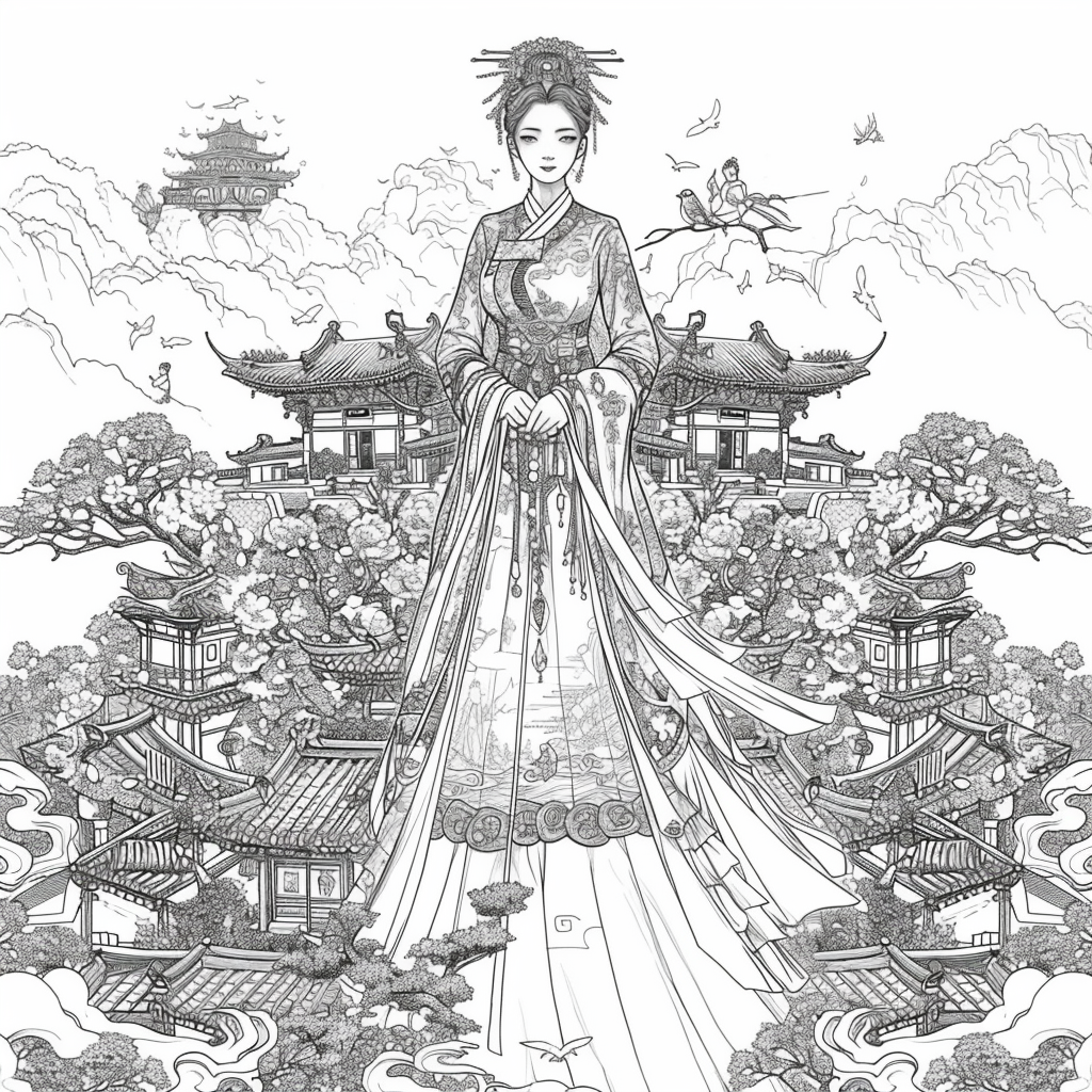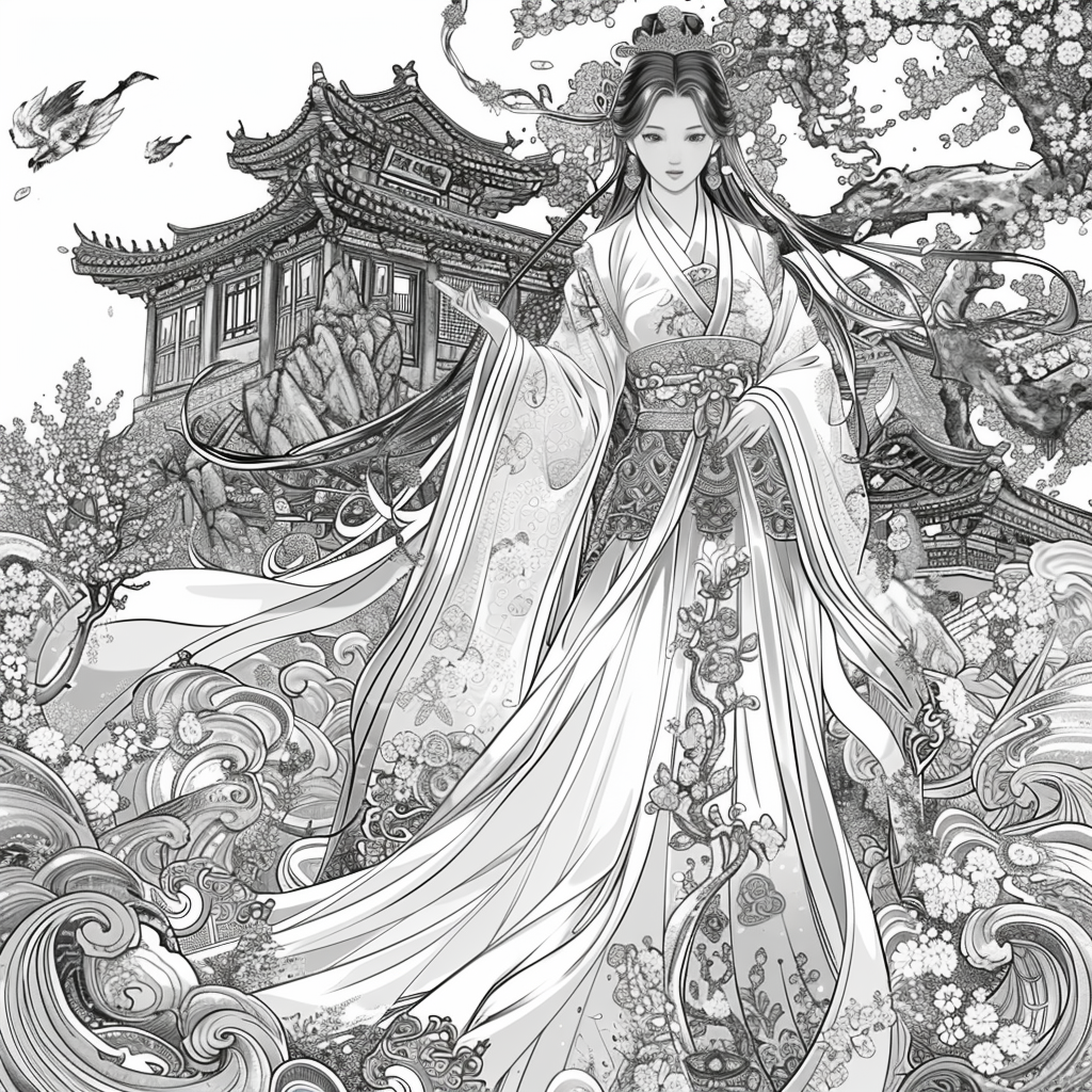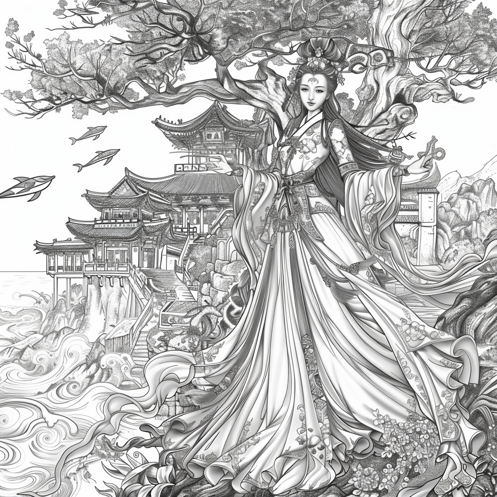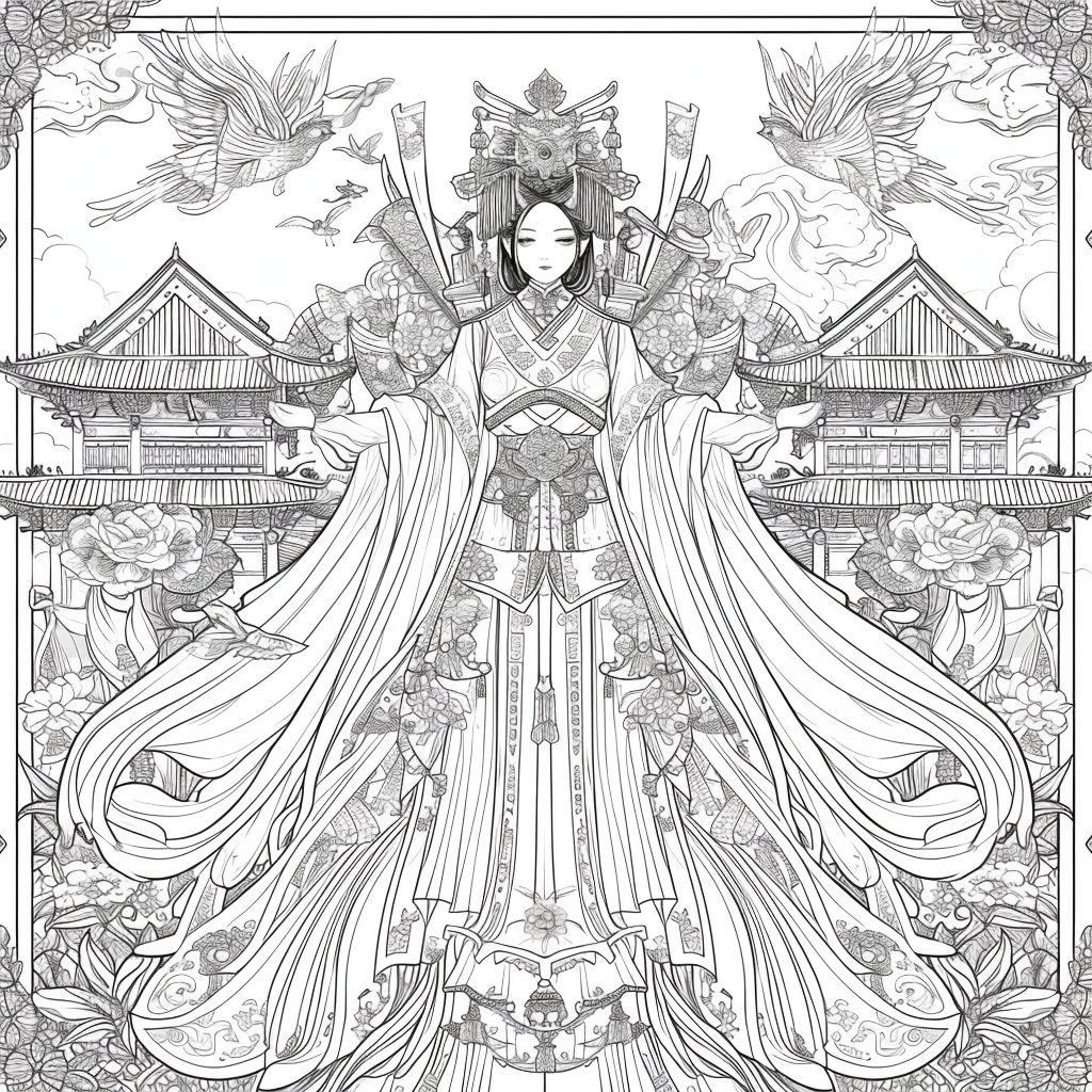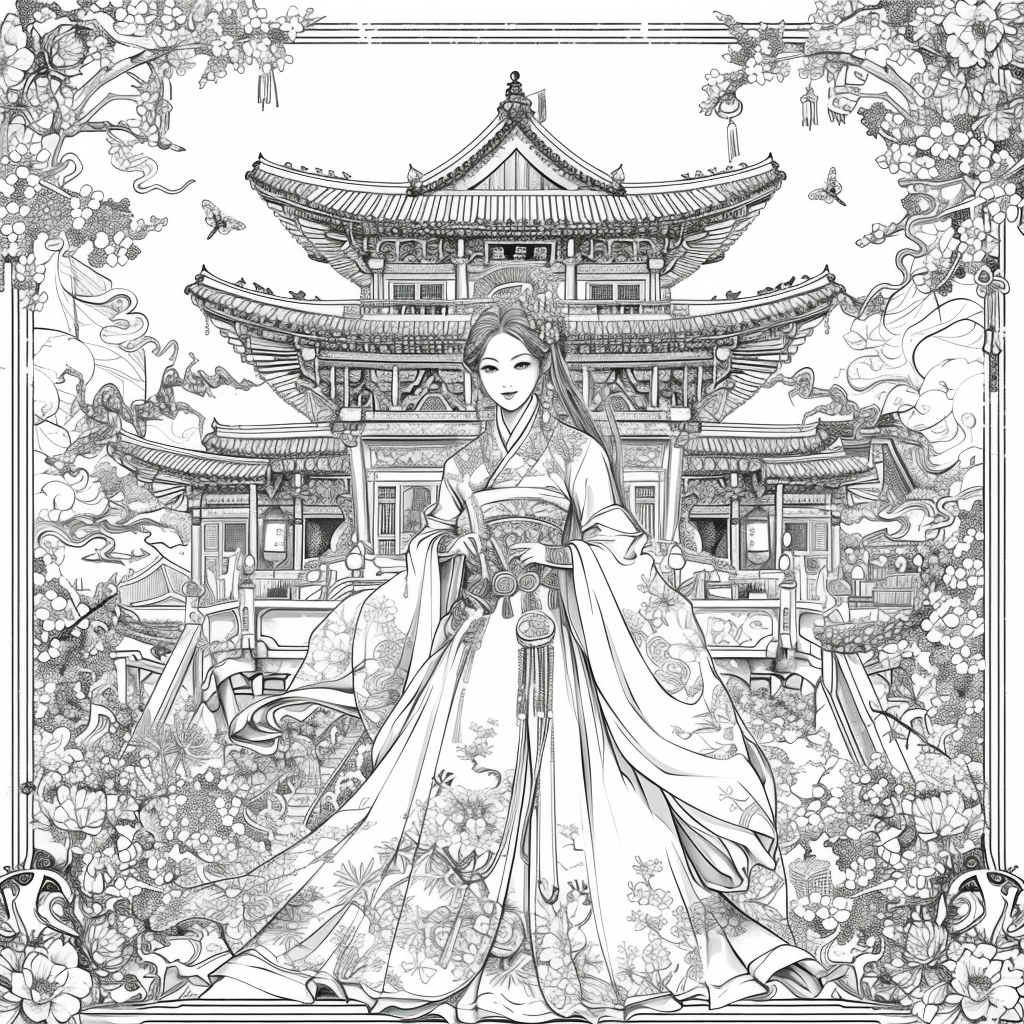 A radiant empress stands gracefully before a grand Joseon-era palace, her robe cascading in luminous waves of rainbow hues. The hanbok is richly adorned with intricate patterns of phoenixes, peonies, waves, and ancient symbols, blending natural forces with royal iconography. Behind her, the palace soars into dreamy clouds and blooming skies, evoking a timeless fantasy of cultural majesty. She embodies harmony, strength, and the spirit of Korea’s golden heritage, uniting architecture, tradition, and nature in one breathtaking tableau.