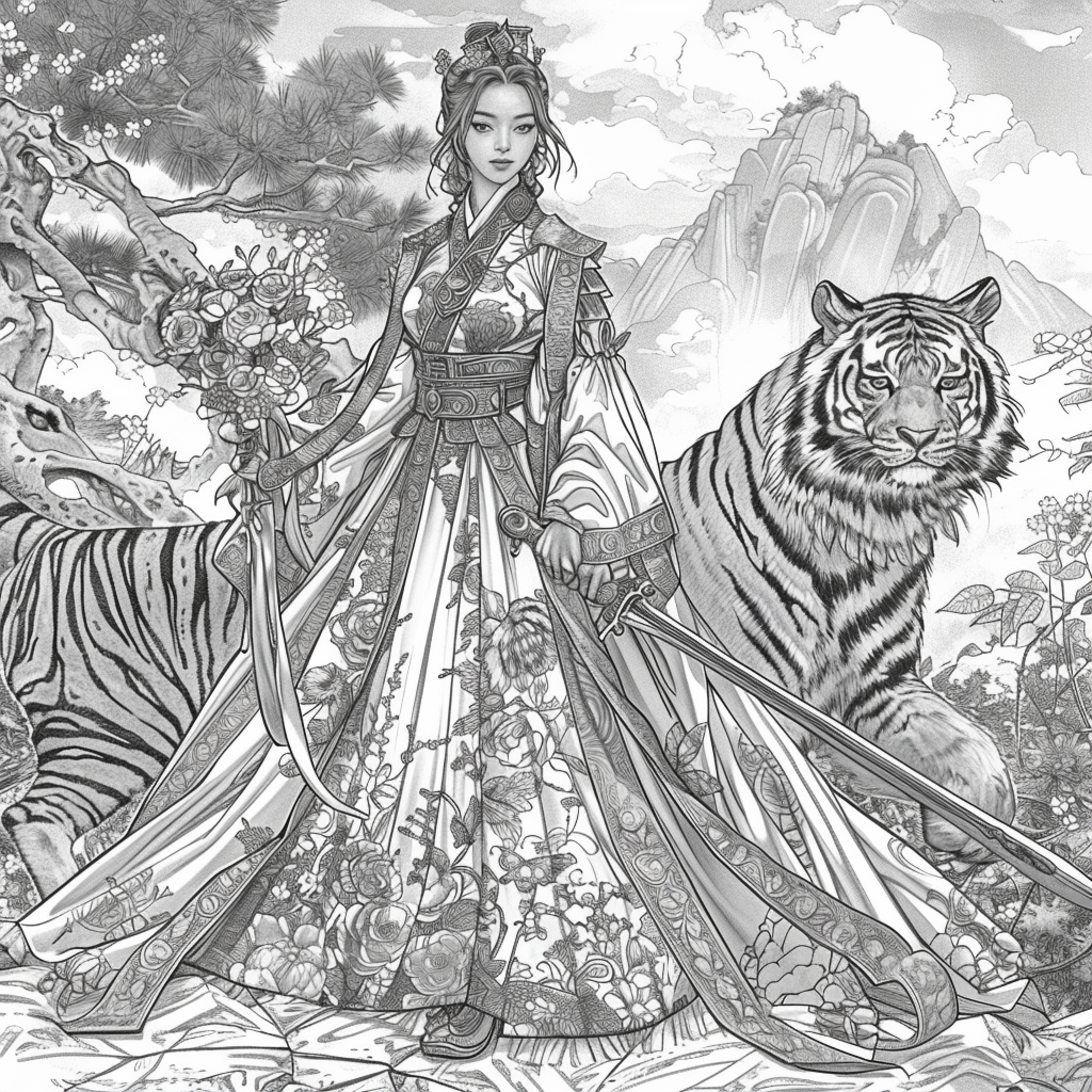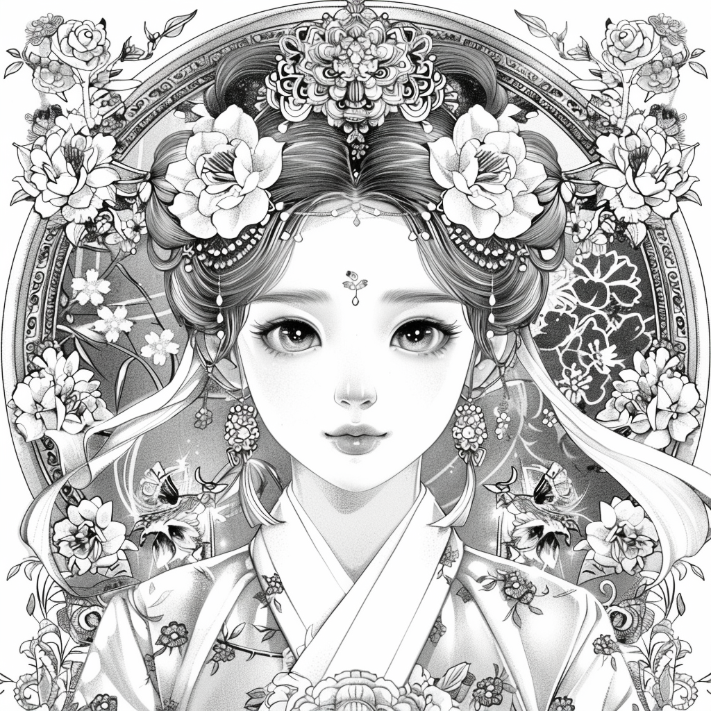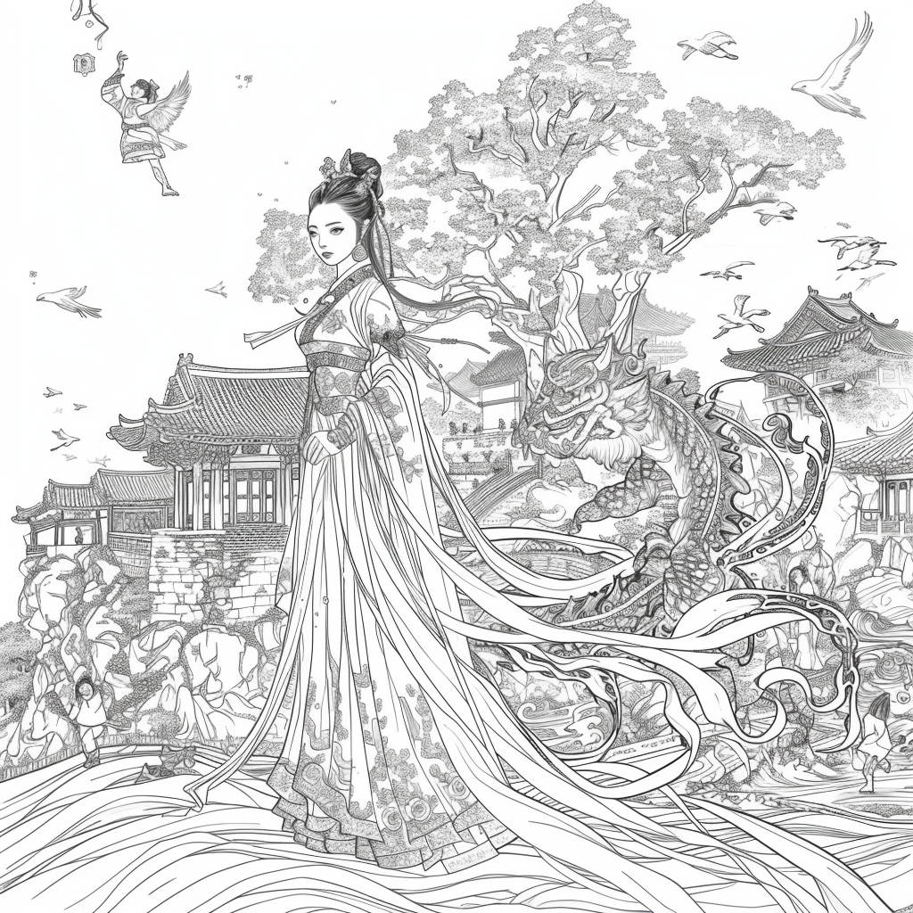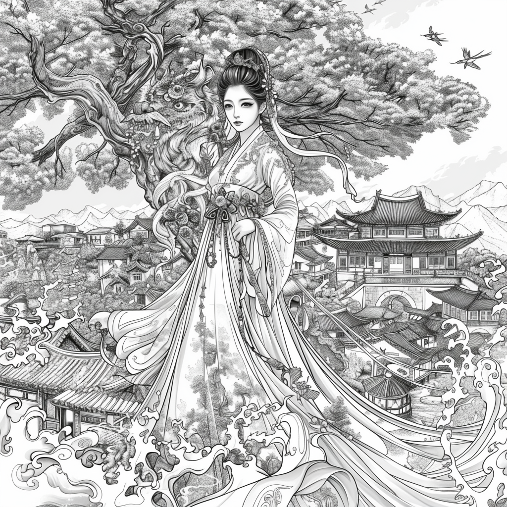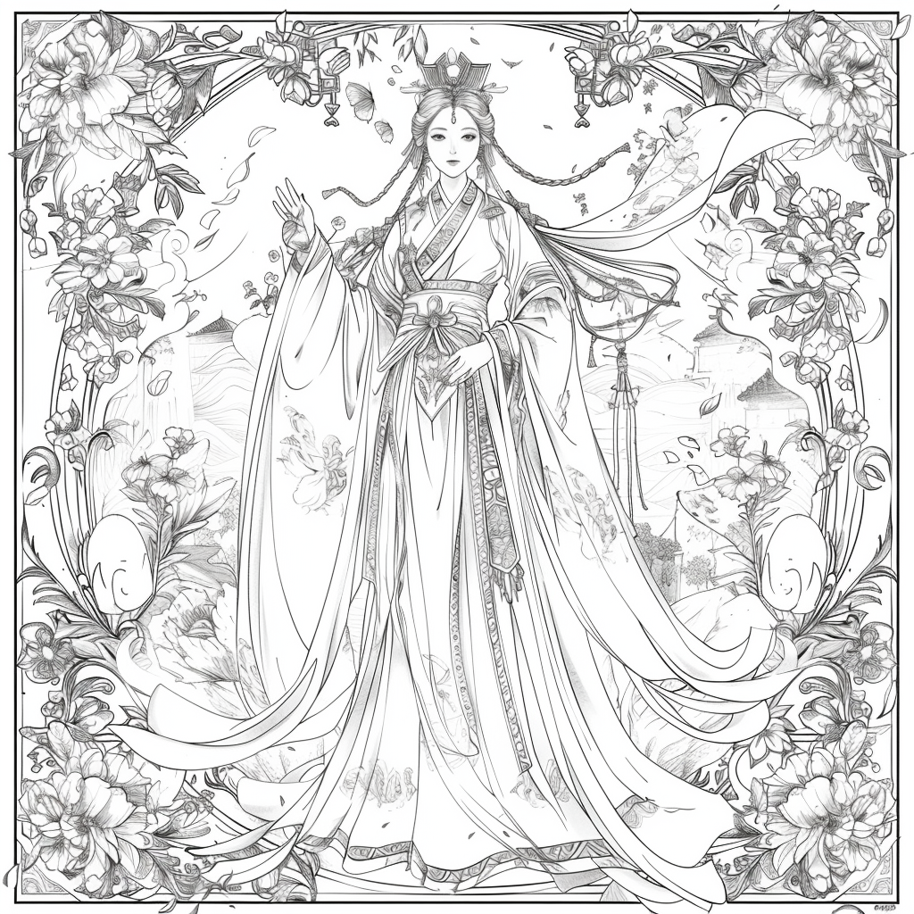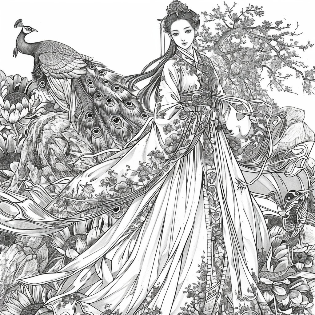 A radiant empress stands gracefully before a grand Joseon-era palace, her robe cascading in luminous waves of rainbow hues. The hanbok is richly adorned with intricate patterns of phoenixes, peonies, waves, and ancient symbols, blending natural forces with royal iconography. Behind her, the palace soars into dreamy clouds and blooming skies, evoking a timeless fantasy of cultural majesty. She embodies harmony, strength, and the spirit of Korea’s golden heritage, uniting architecture, tradition, and nature in one breathtaking tableau.