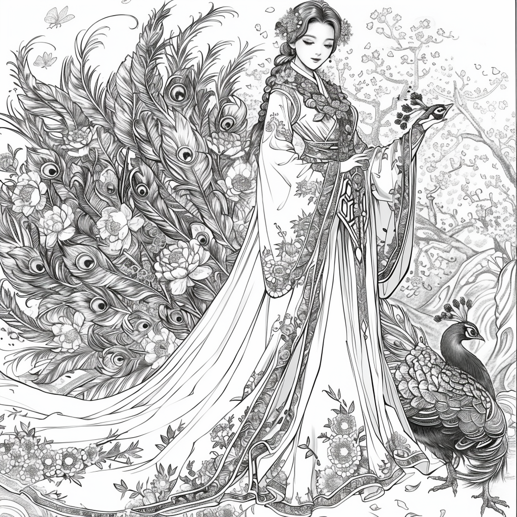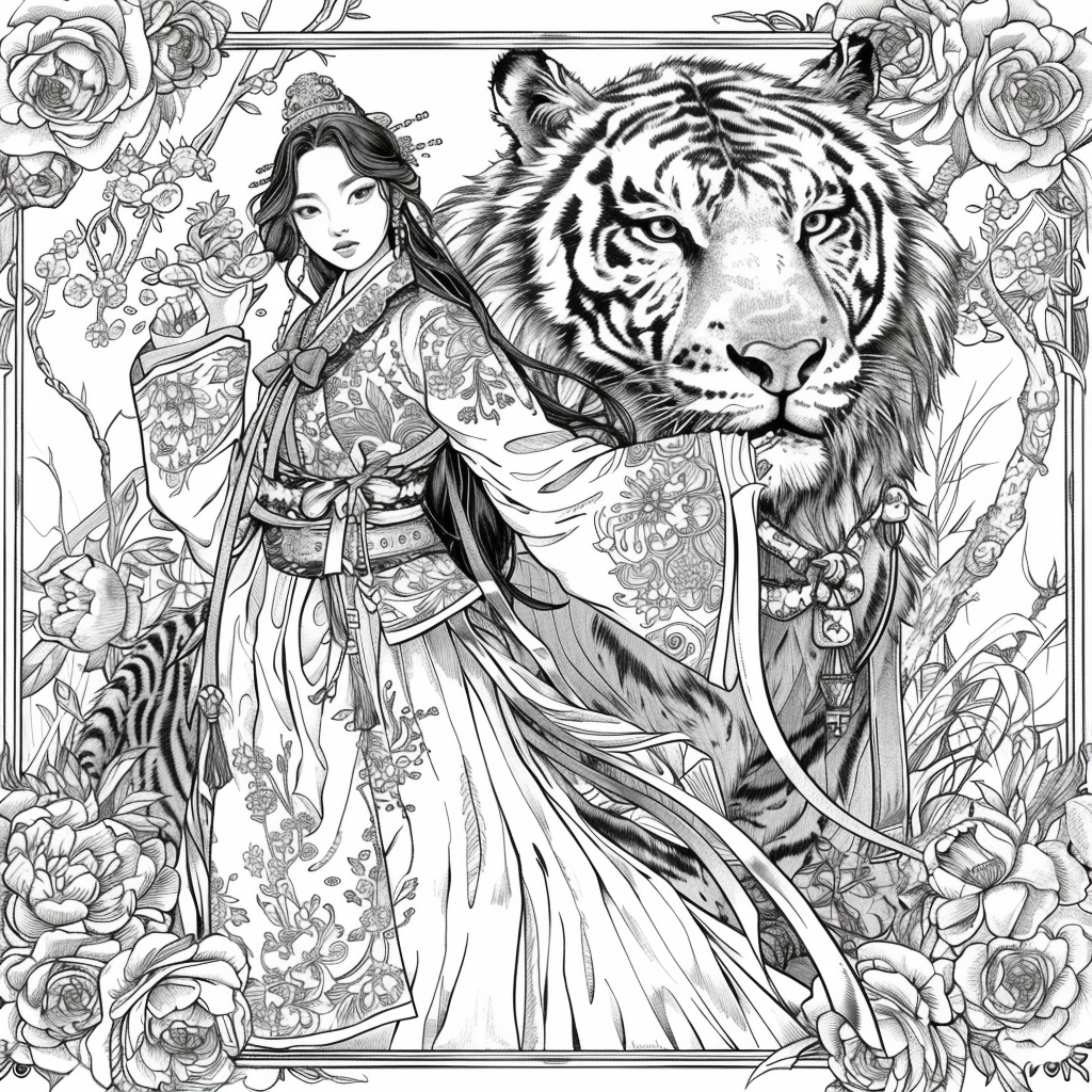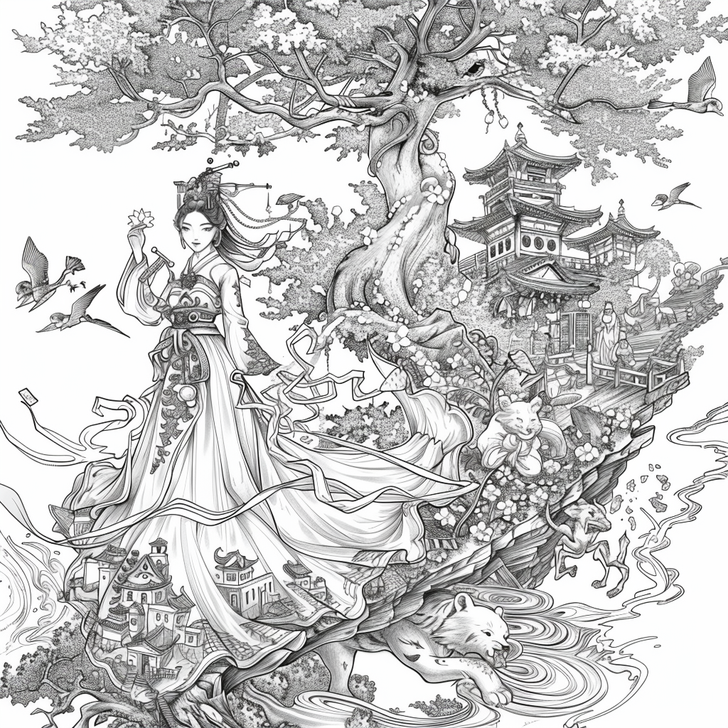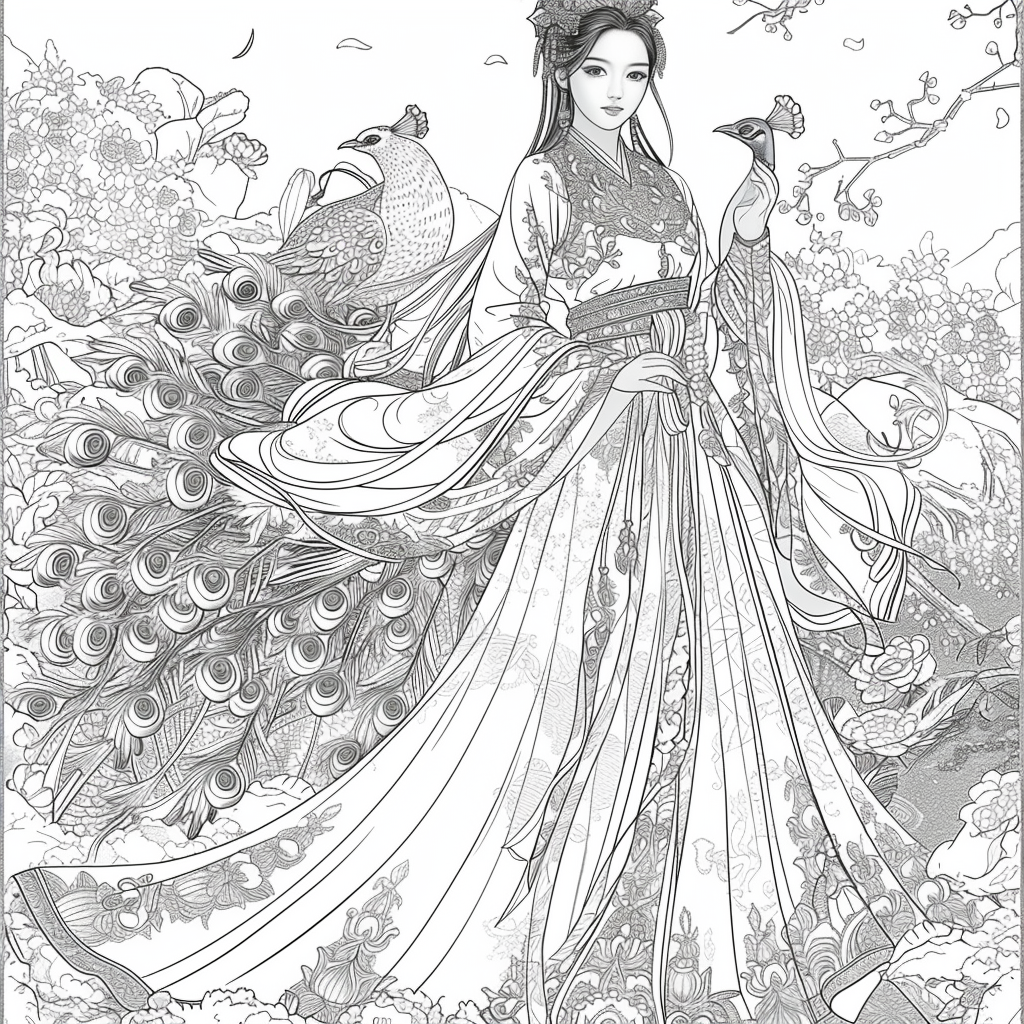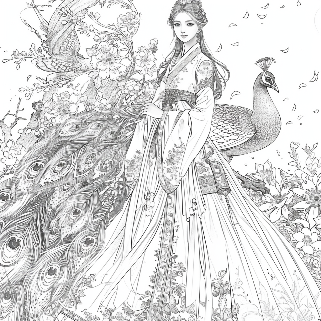 A radiant empress stands gracefully before a grand Joseon-era palace, her robe cascading in luminous waves of rainbow hues. The hanbok is richly adorned with intricate patterns of phoenixes, peonies, waves, and ancient symbols, blending natural forces with royal iconography. Behind her, the palace soars into dreamy clouds and blooming skies, evoking a timeless fantasy of cultural majesty. She embodies harmony, strength, and the spirit of Korea’s golden heritage, uniting architecture, tradition, and nature in one breathtaking tableau.