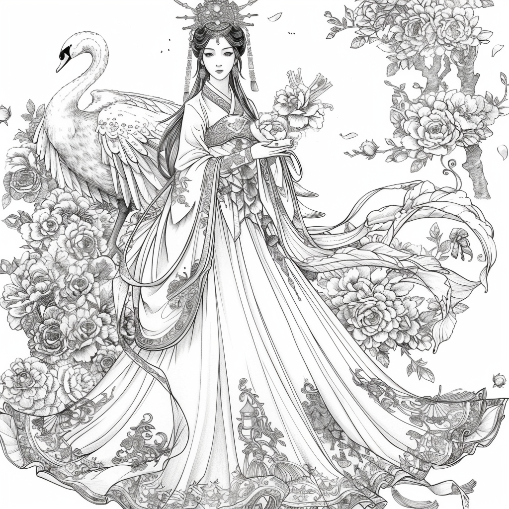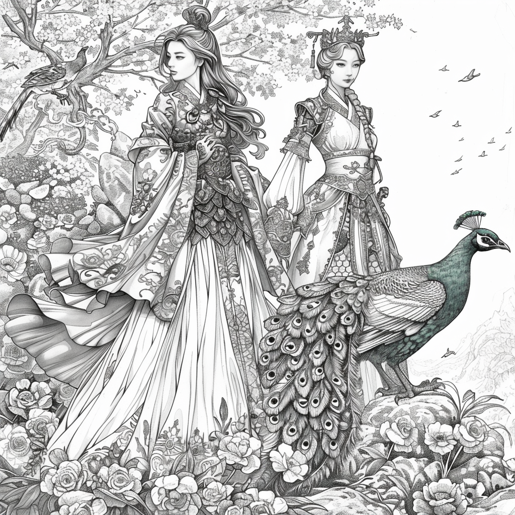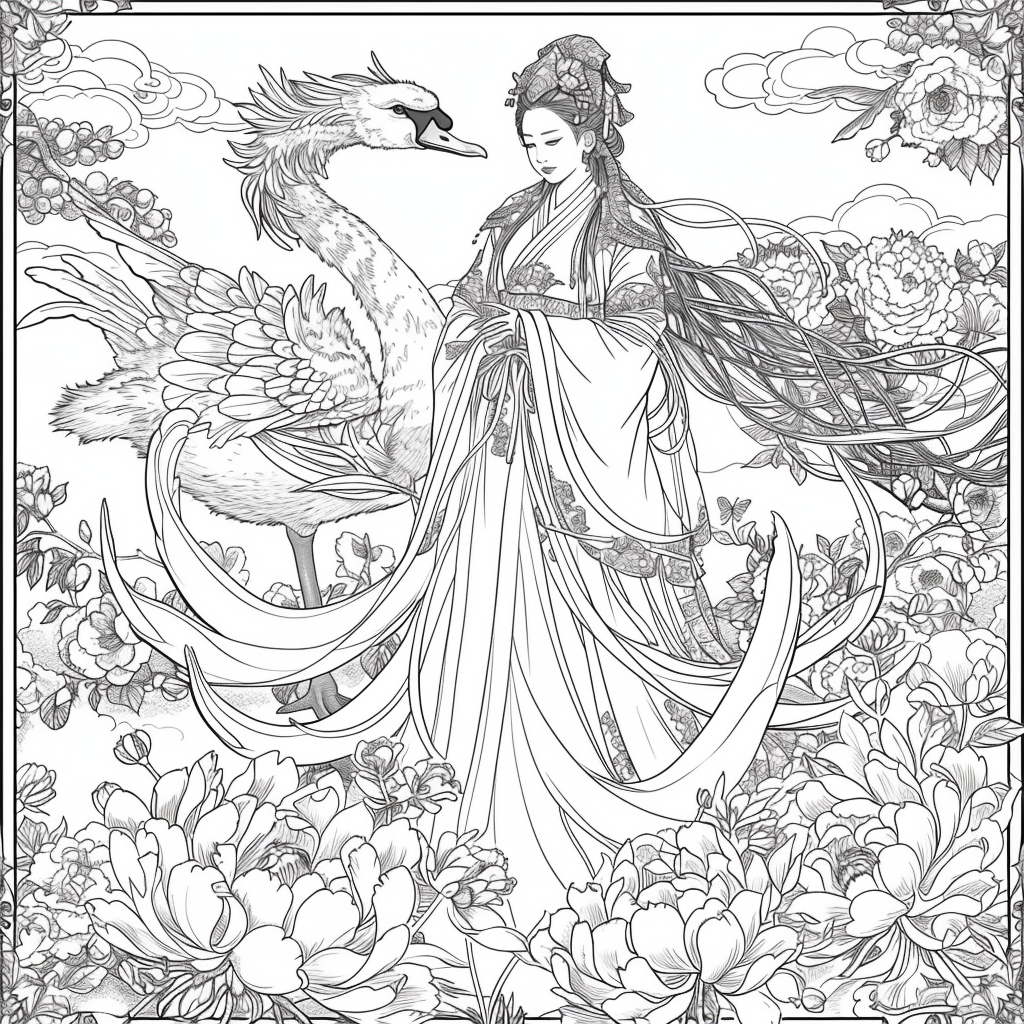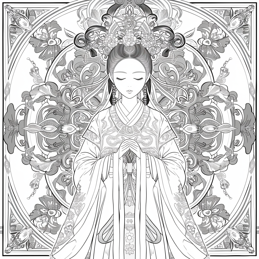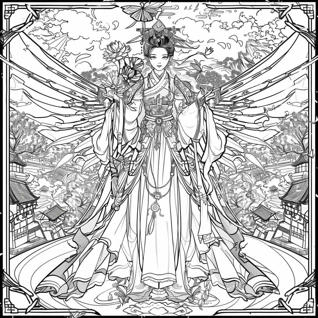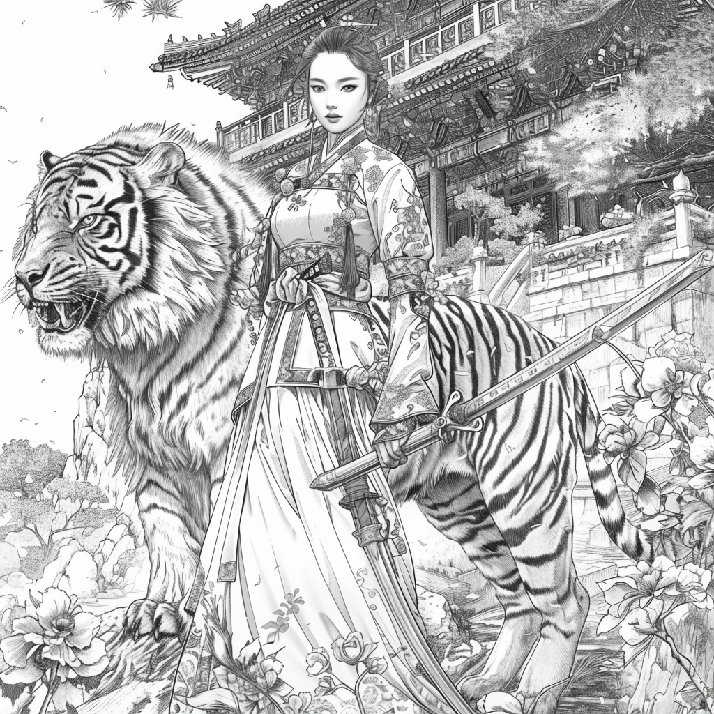 A radiant empress stands gracefully before a grand Joseon-era palace, her robe cascading in luminous waves of rainbow hues. The hanbok is richly adorned with intricate patterns of phoenixes, peonies, waves, and ancient symbols, blending natural forces with royal iconography. Behind her, the palace soars into dreamy clouds and blooming skies, evoking a timeless fantasy of cultural majesty. She embodies harmony, strength, and the spirit of Korea’s golden heritage, uniting architecture, tradition, and nature in one breathtaking tableau.