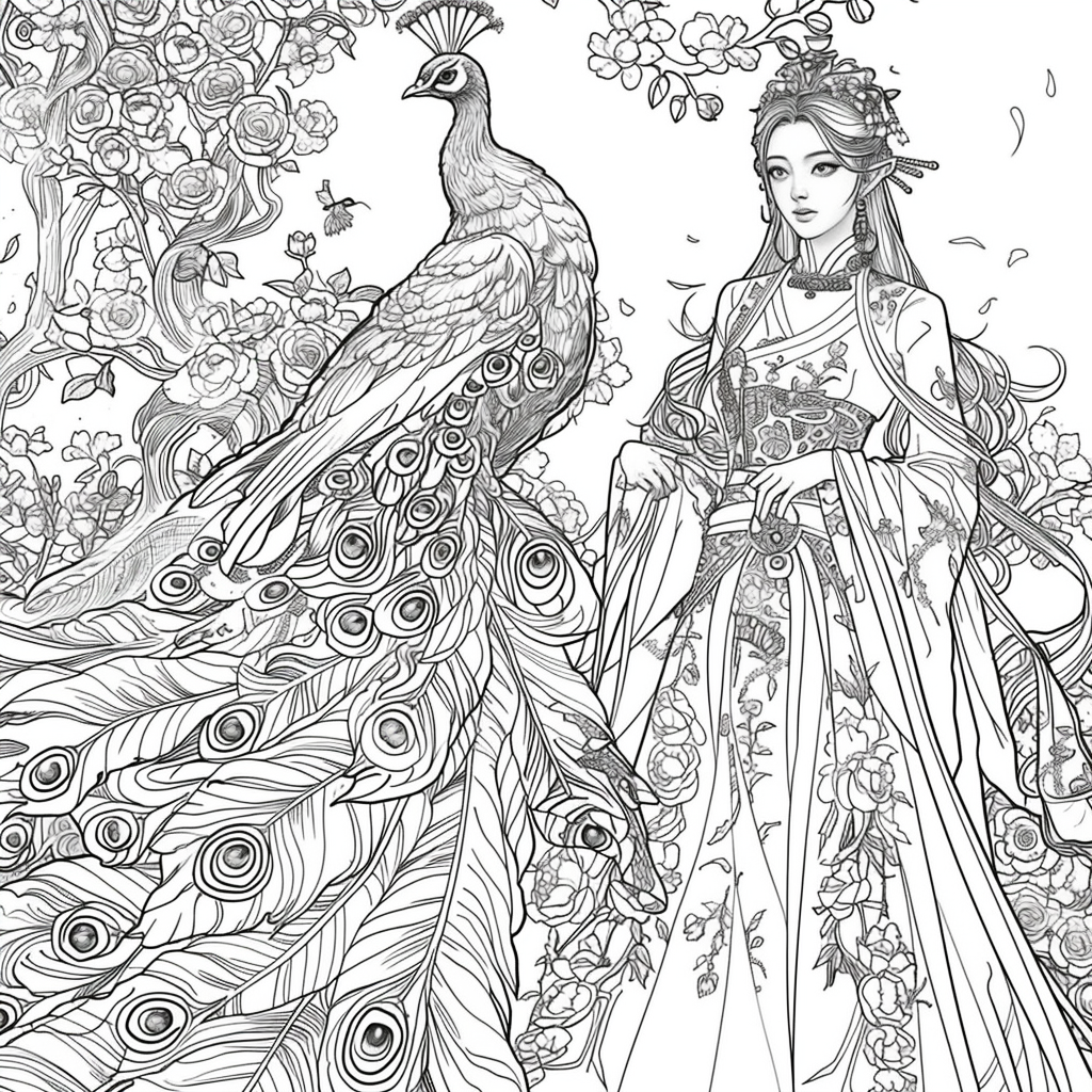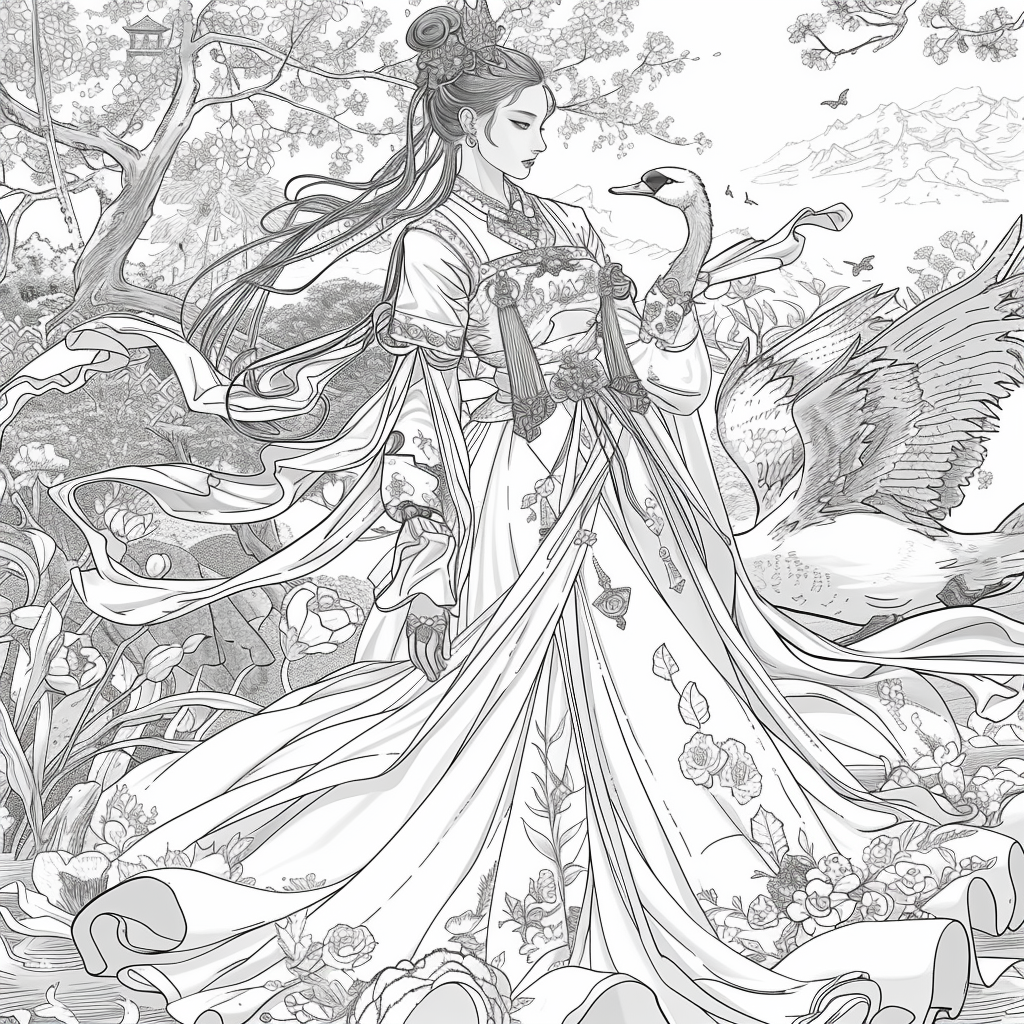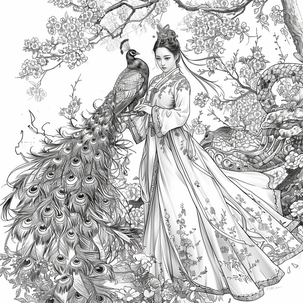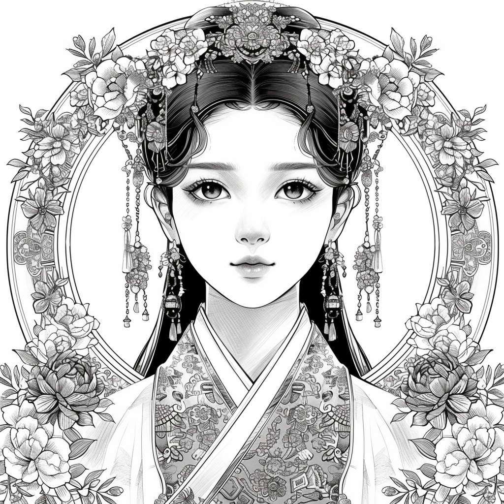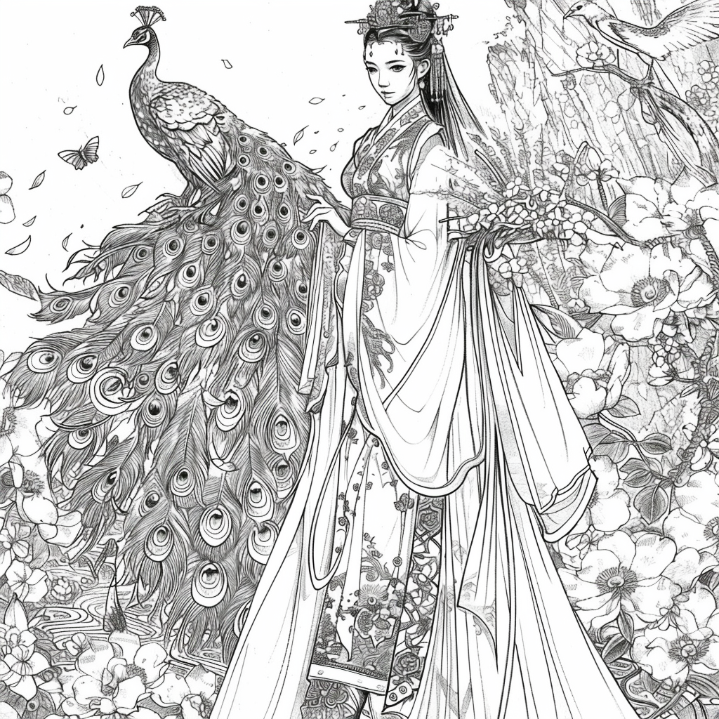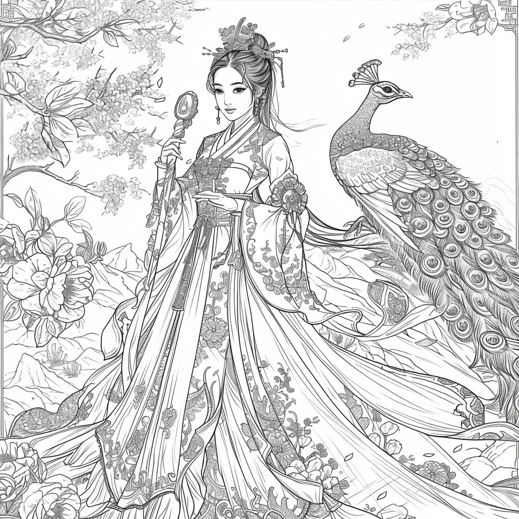 A radiant empress stands gracefully before a grand Joseon-era palace, her robe cascading in luminous waves of rainbow hues. The hanbok is richly adorned with intricate patterns of phoenixes, peonies, waves, and ancient symbols, blending natural forces with royal iconography. Behind her, the palace soars into dreamy clouds and blooming skies, evoking a timeless fantasy of cultural majesty. She embodies harmony, strength, and the spirit of Korea’s golden heritage, uniting architecture, tradition, and nature in one breathtaking tableau.