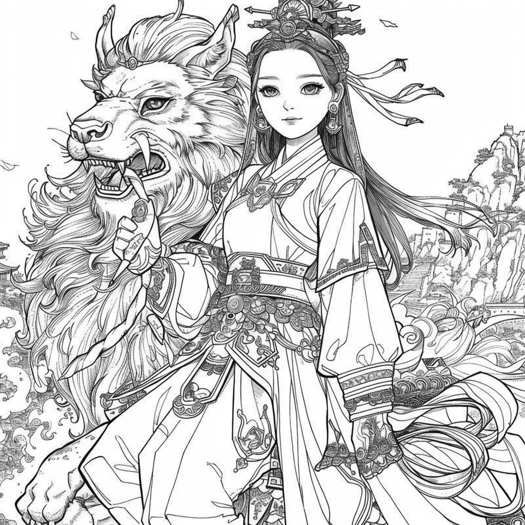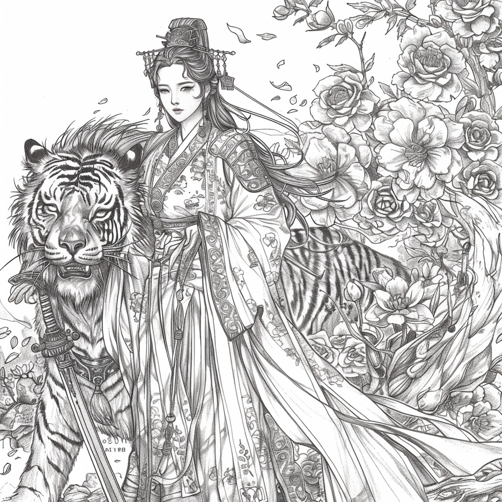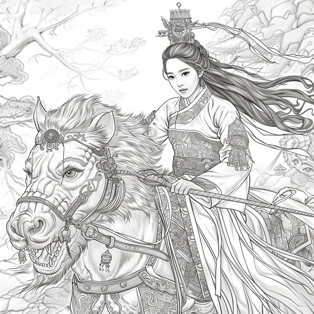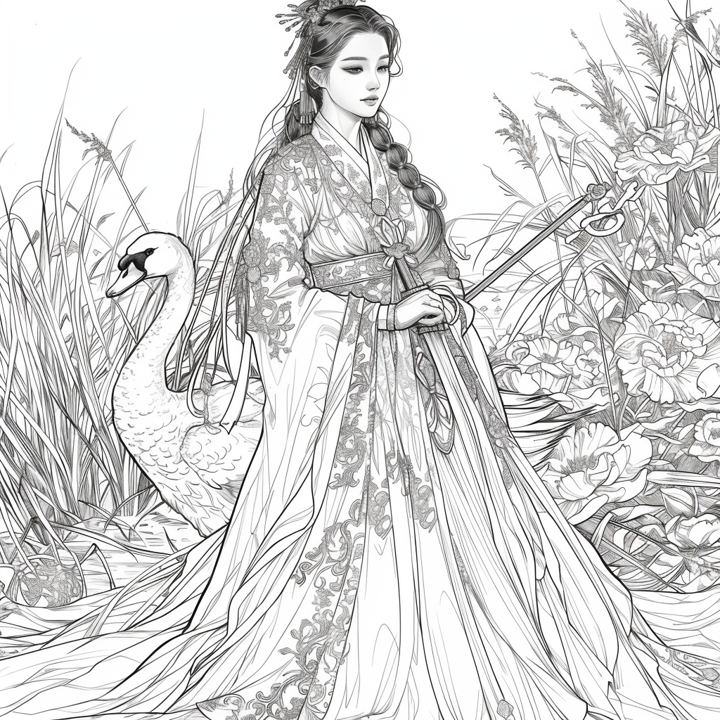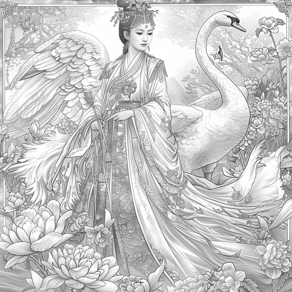 A radiant empress stands gracefully before a grand Joseon-era palace, her robe cascading in luminous waves of rainbow hues. The hanbok is richly adorned with intricate patterns of phoenixes, peonies, waves, and ancient symbols, blending natural forces with royal iconography. Behind her, the palace soars into dreamy clouds and blooming skies, evoking a timeless fantasy of cultural majesty. She embodies harmony, strength, and the spirit of Korea’s golden heritage, uniting architecture, tradition, and nature in one breathtaking tableau.