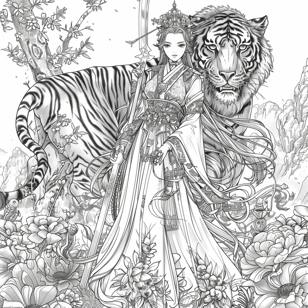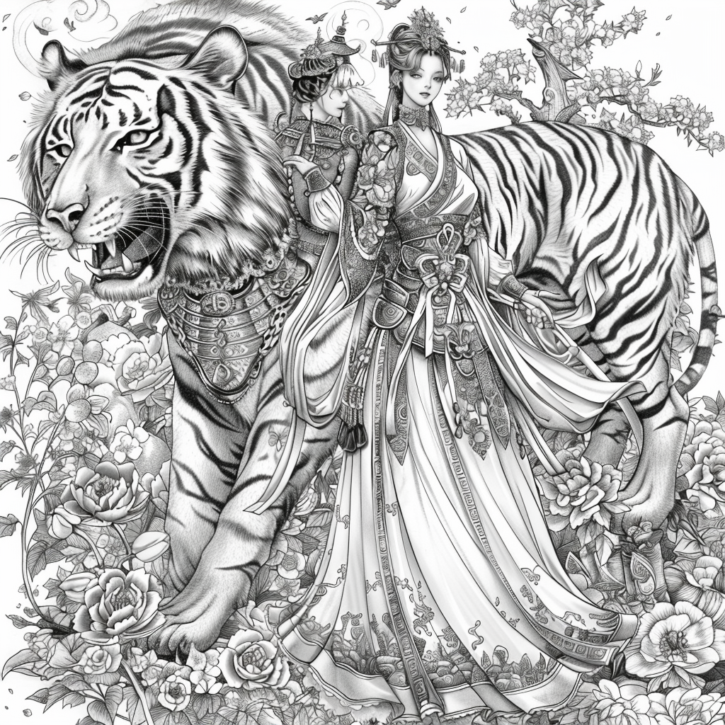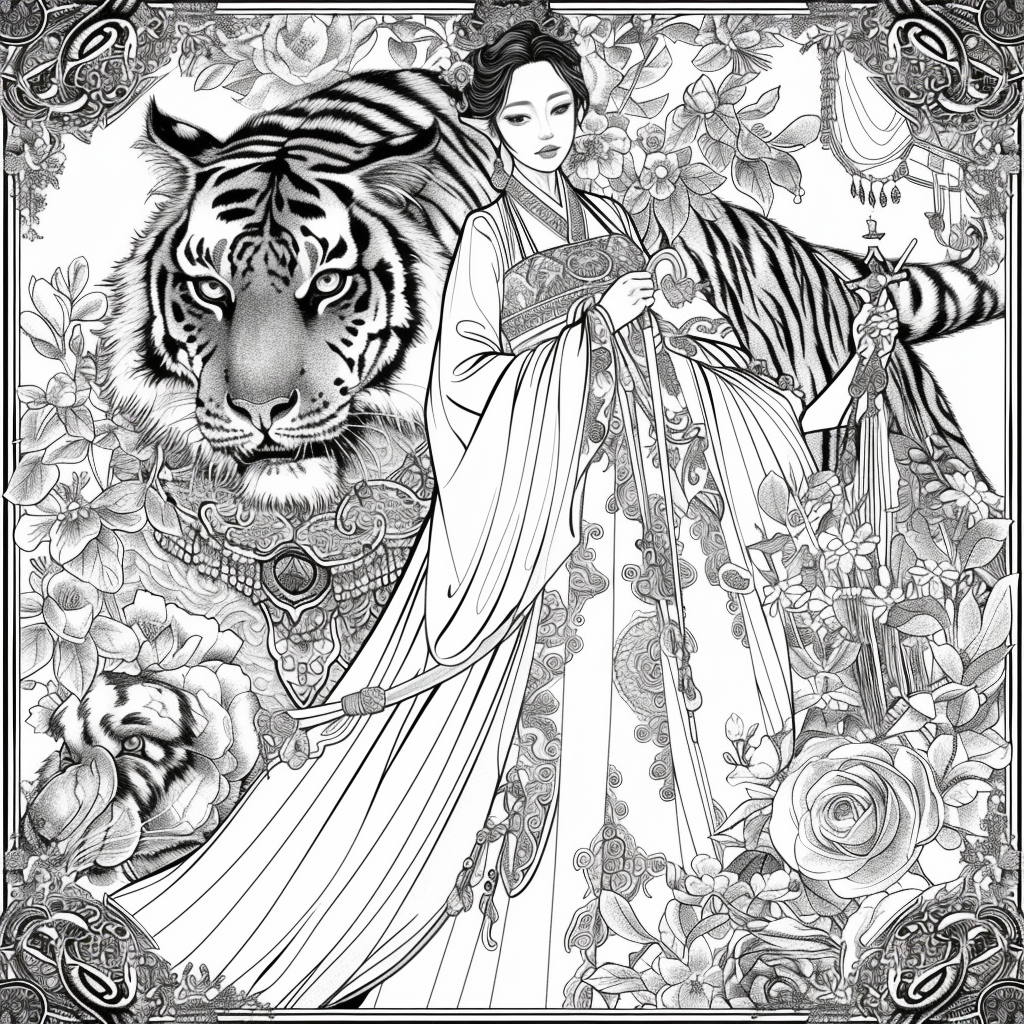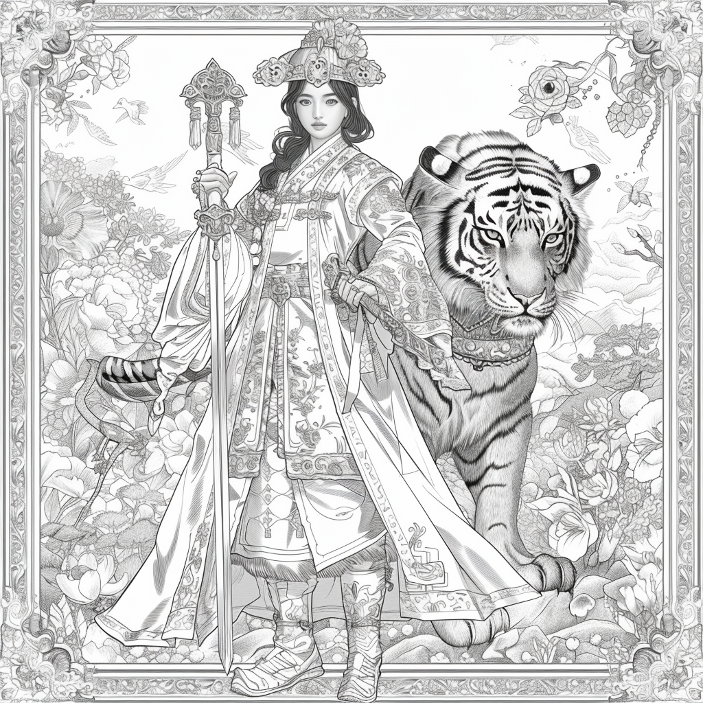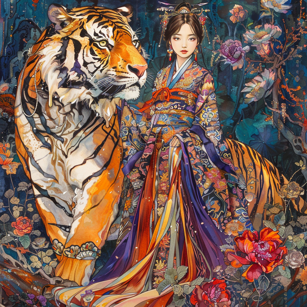 A noble empress stands in full regalia, her robe embroidered with intricate floral and celestial motifs in vibrant shades of blue, purple, and crimson. Beside her, a powerful tiger walks with unwavering presence, its glowing eyes and rippling stripes echoing both danger and protection. The background blooms with lush flowers under a deep twilight sky, where roses and peonies weave a tapestry of resilience and grace. The empress exudes poise and quiet strength, her bond with the tiger symbolizing courage, loyalty, and the harmony between humanity and the wild. This piece reflects a union of elegance and power, where beauty becomes inseparable from might.