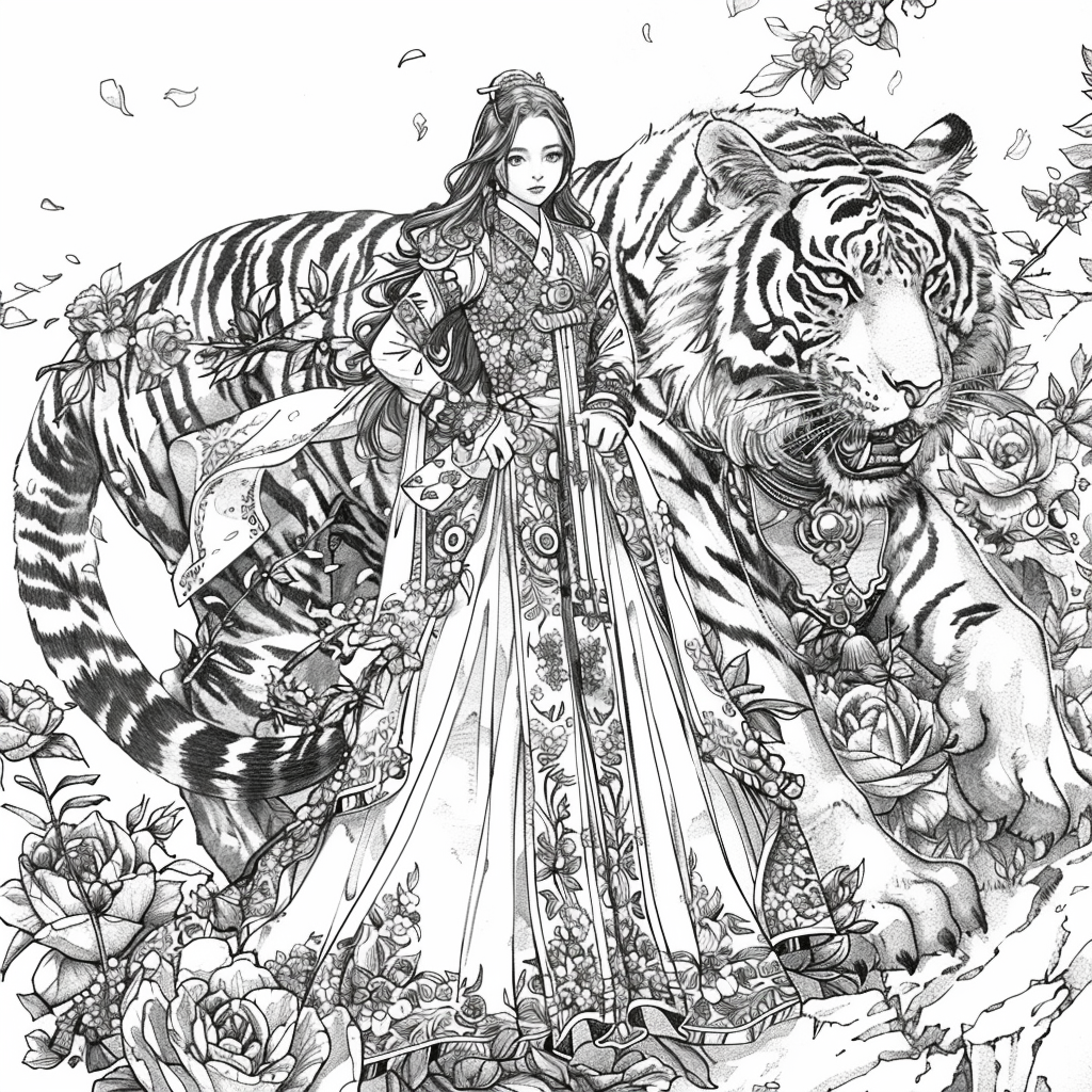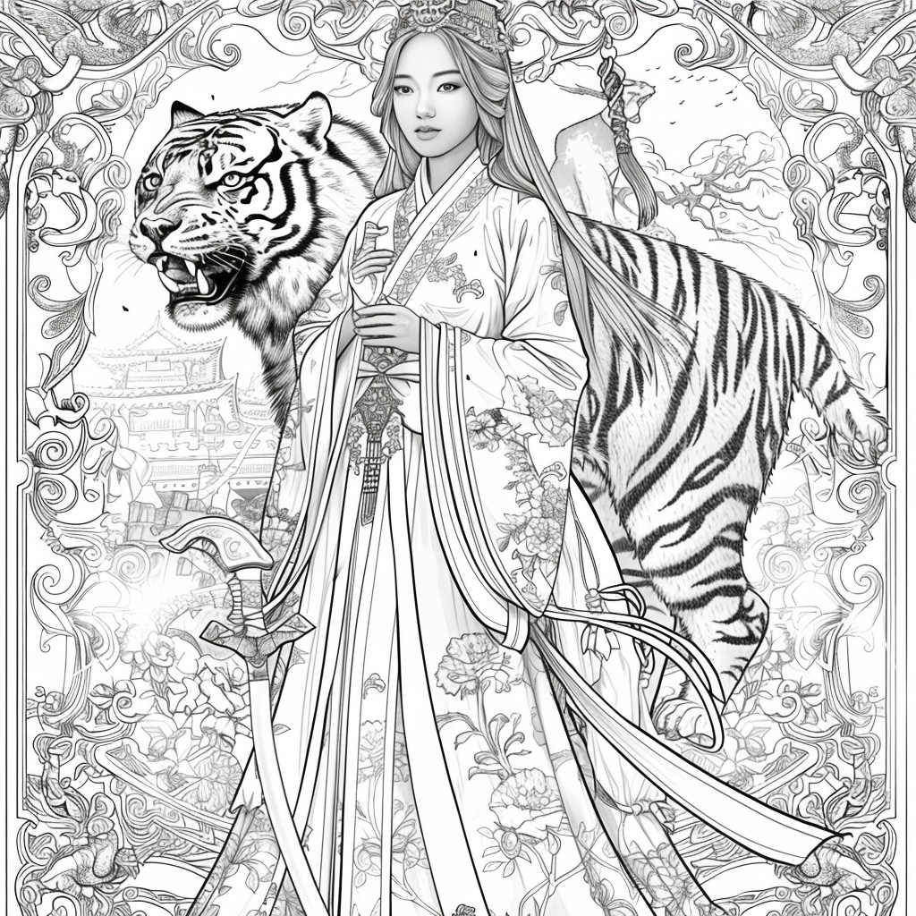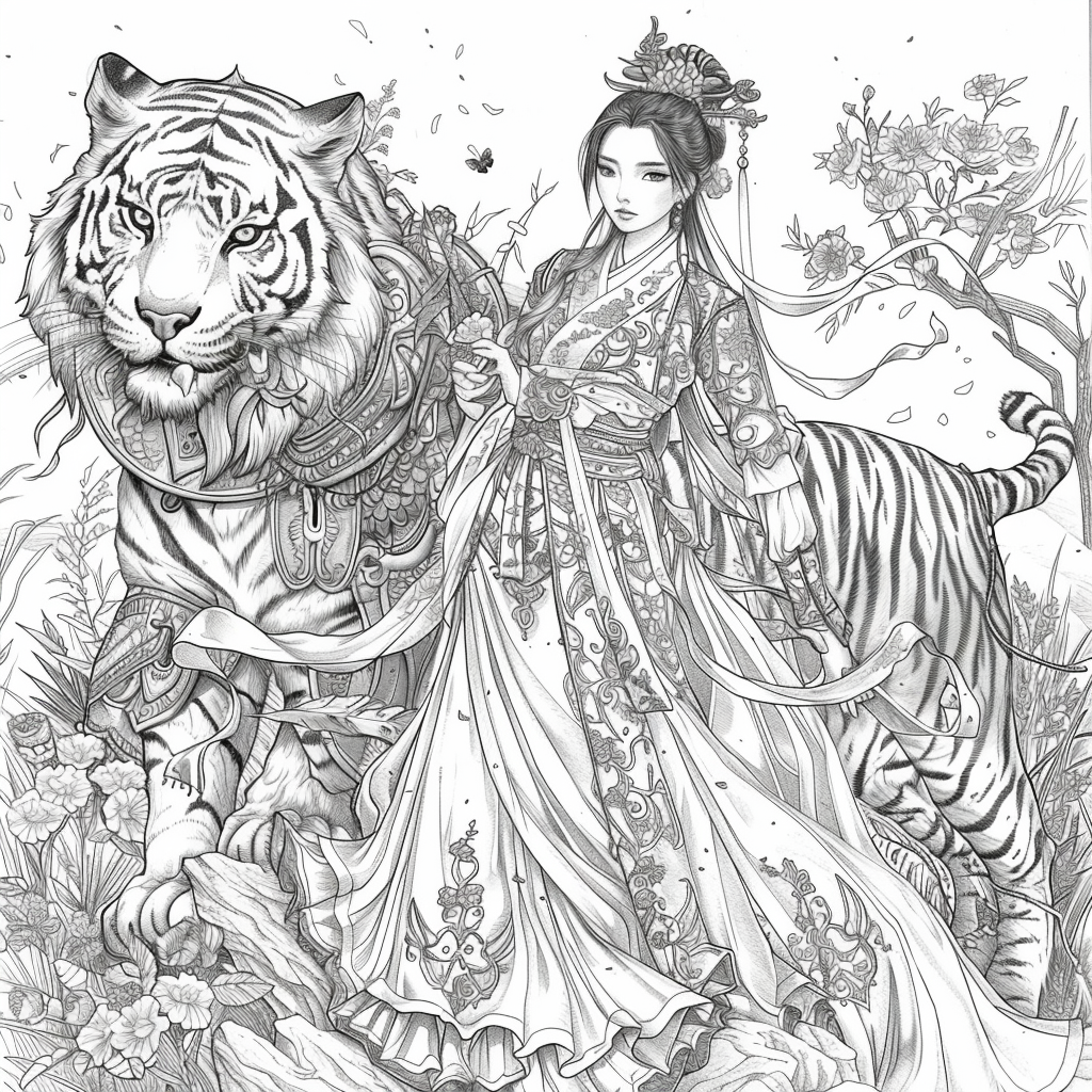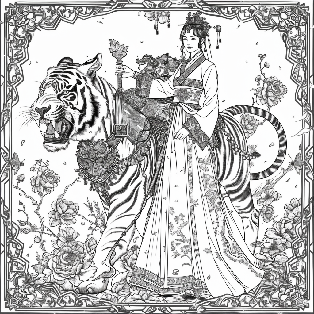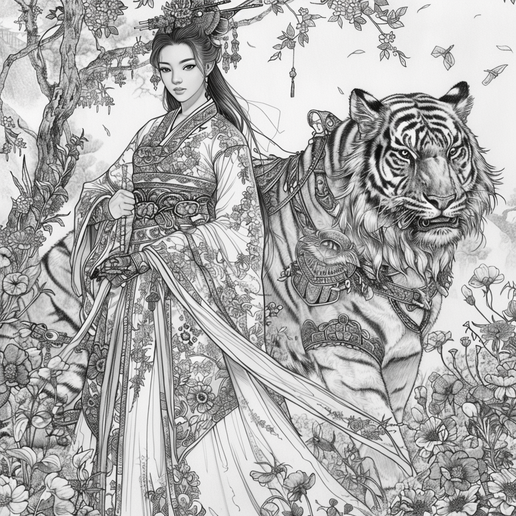 A noble empress stands in full regalia, her robe embroidered with intricate floral and celestial motifs in vibrant shades of blue, purple, and crimson. Beside her, a powerful tiger walks with unwavering presence, its glowing eyes and rippling stripes echoing both danger and protection. The background blooms with lush flowers under a deep twilight sky, where roses and peonies weave a tapestry of resilience and grace. The empress exudes poise and quiet strength, her bond with the tiger symbolizing courage, loyalty, and the harmony between humanity and the wild. This piece reflects a union of elegance and power, where beauty becomes inseparable from might.