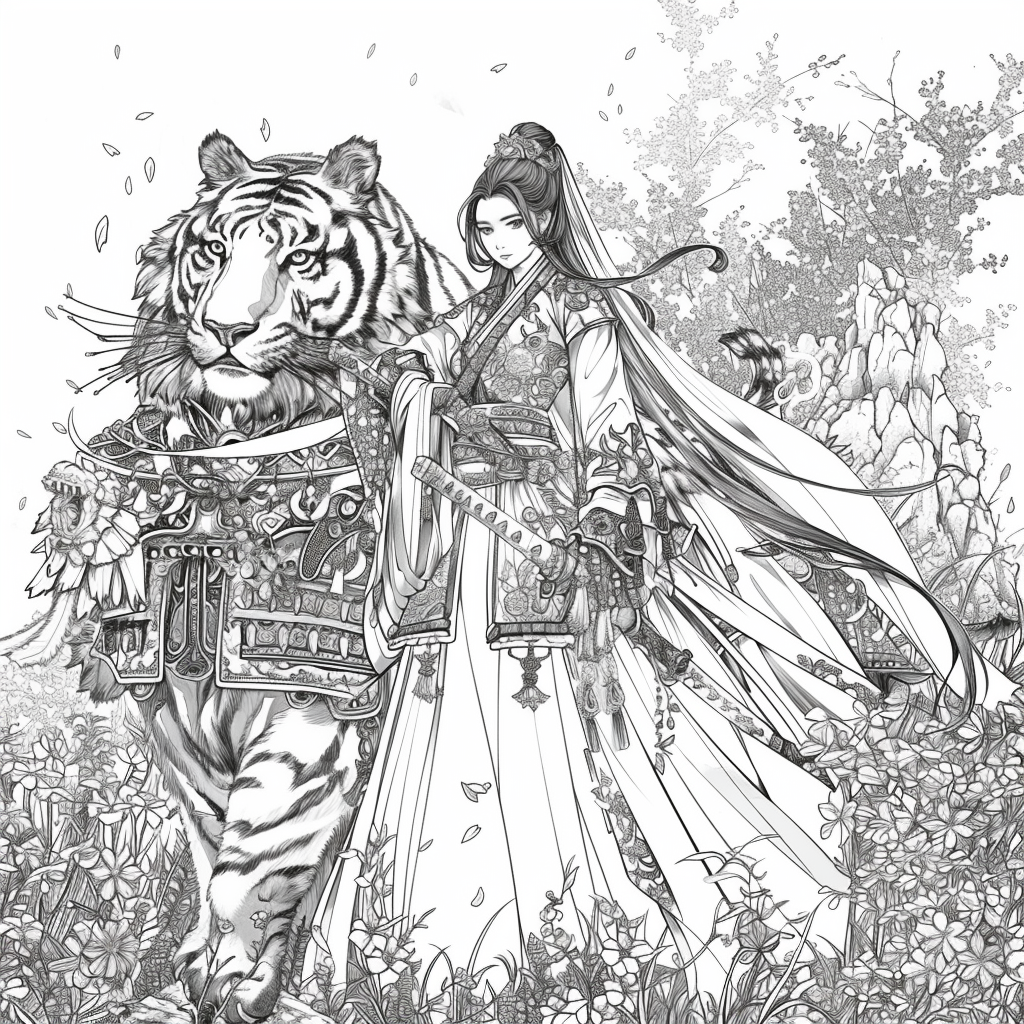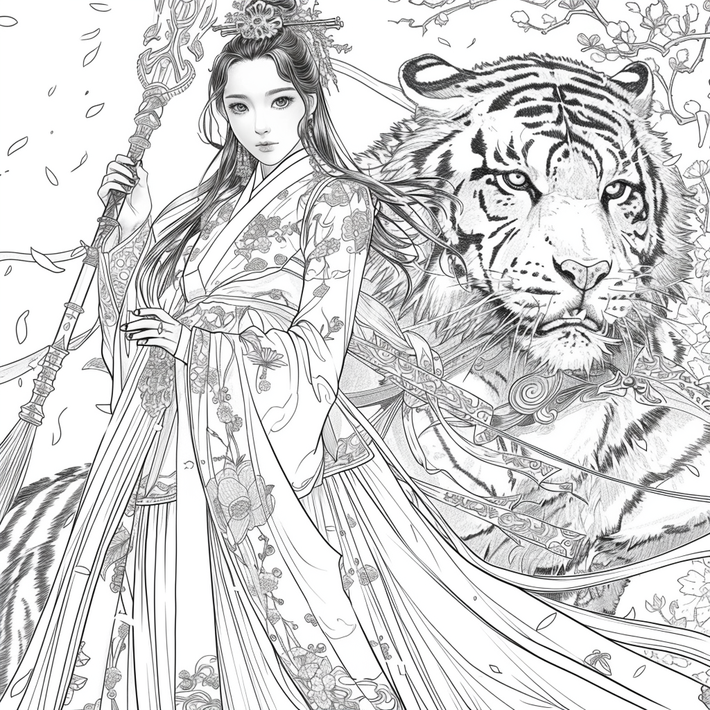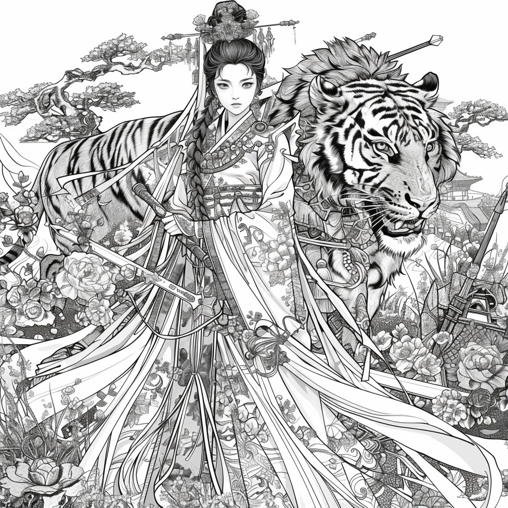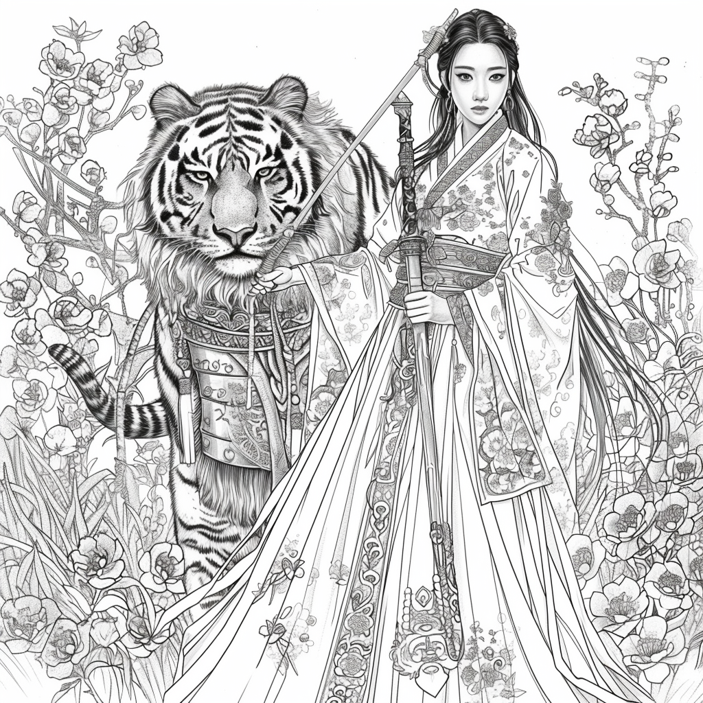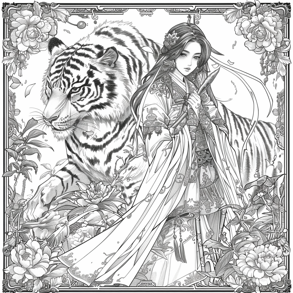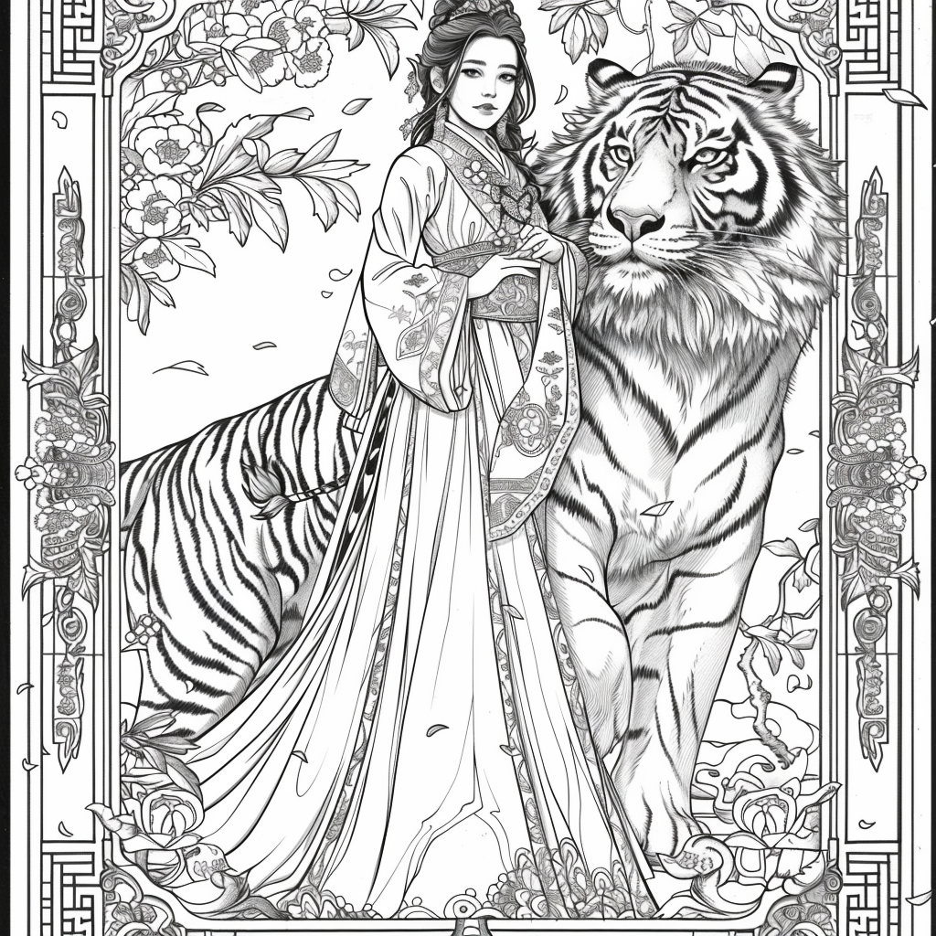 A noble empress stands in full regalia, her robe embroidered with intricate floral and celestial motifs in vibrant shades of blue, purple, and crimson. Beside her, a powerful tiger walks with unwavering presence, its glowing eyes and rippling stripes echoing both danger and protection. The background blooms with lush flowers under a deep twilight sky, where roses and peonies weave a tapestry of resilience and grace. The empress exudes poise and quiet strength, her bond with the tiger symbolizing courage, loyalty, and the harmony between humanity and the wild. This piece reflects a union of elegance and power, where beauty becomes inseparable from might.
