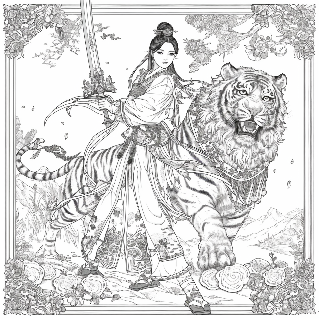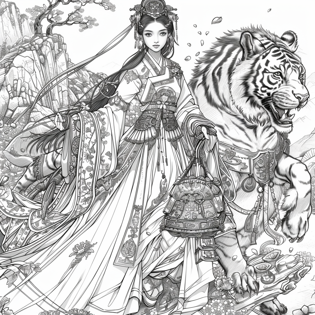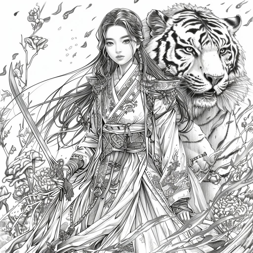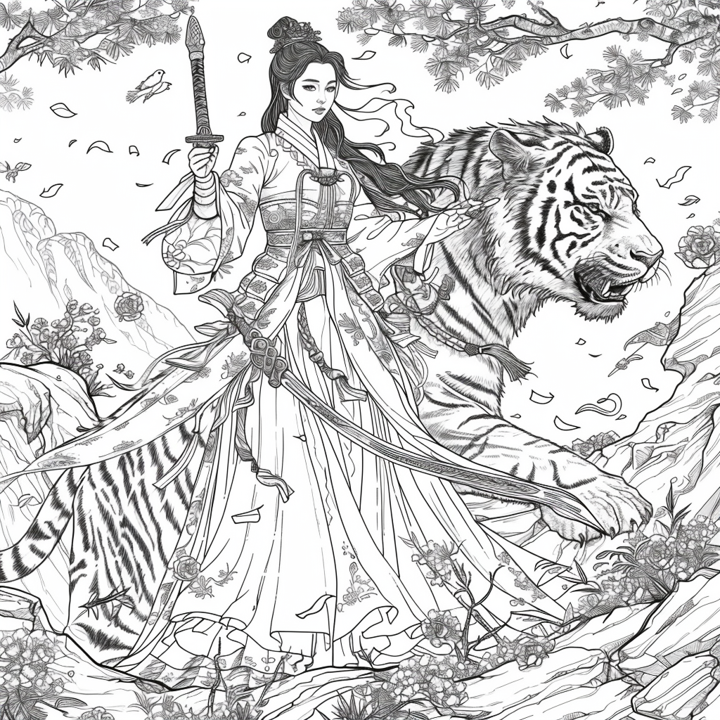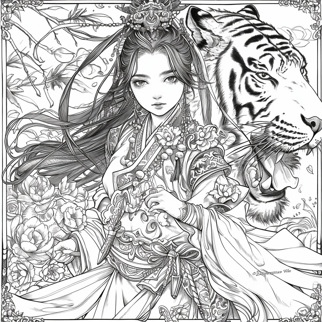 A noble empress stands in full regalia, her robe embroidered with intricate floral and celestial motifs in vibrant shades of blue, purple, and crimson. Beside her, a powerful tiger walks with unwavering presence, its glowing eyes and rippling stripes echoing both danger and protection. The background blooms with lush flowers under a deep twilight sky, where roses and peonies weave a tapestry of resilience and grace. The empress exudes poise and quiet strength, her bond with the tiger symbolizing courage, loyalty, and the harmony between humanity and the wild. This piece reflects a union of elegance and power, where beauty becomes inseparable from might.