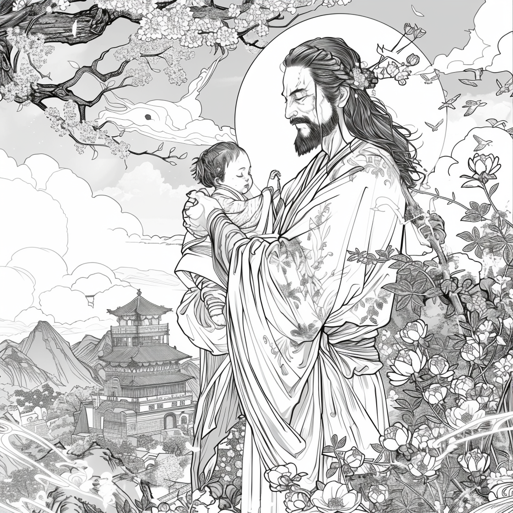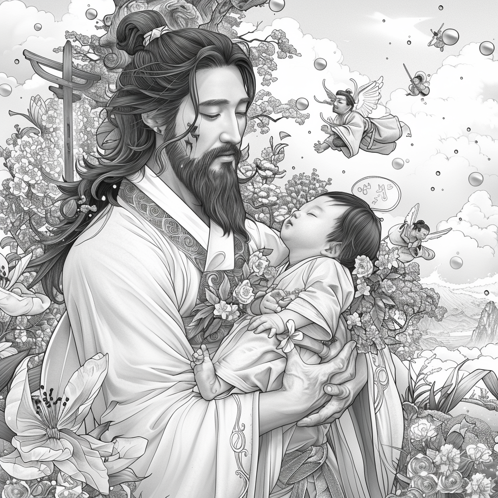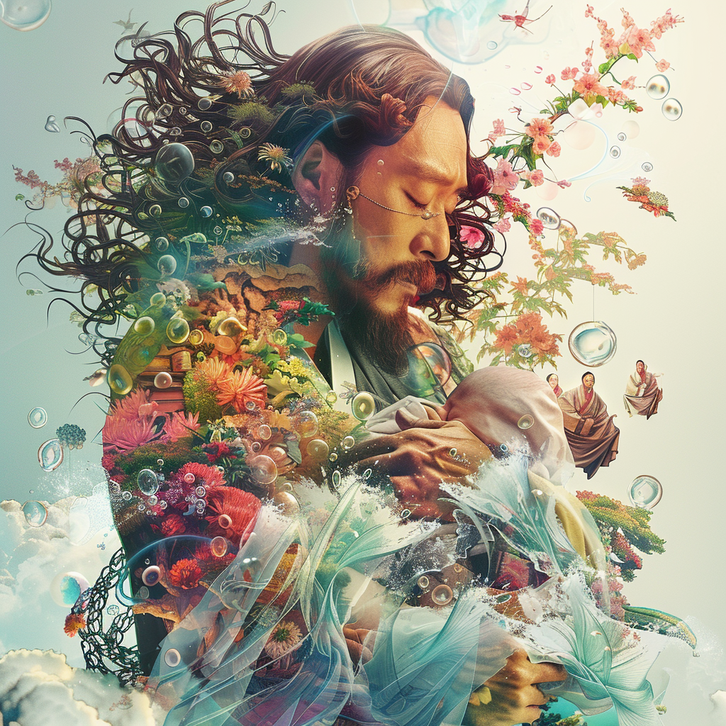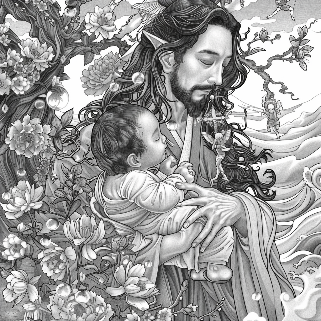 A breathtaking fusion of divine serenity and earthly beauty, this artwork captures the tender moment of Jesus cradling a newborn in His arms. Flowing locks dance in the wind, merging with a cascade of blossoms, lush gardens, and celestial bubbles, symbolizing life’s purity and abundance. Soft petals, drifting clouds, and gentle ripples weave together heaven and earth, while the warm glow on His face radiates unshakable compassion and grace. In this sacred embrace, the innocence of a child meets the infinite love of the Shepherd, embodying peace, hope, and the eternal gift of life.