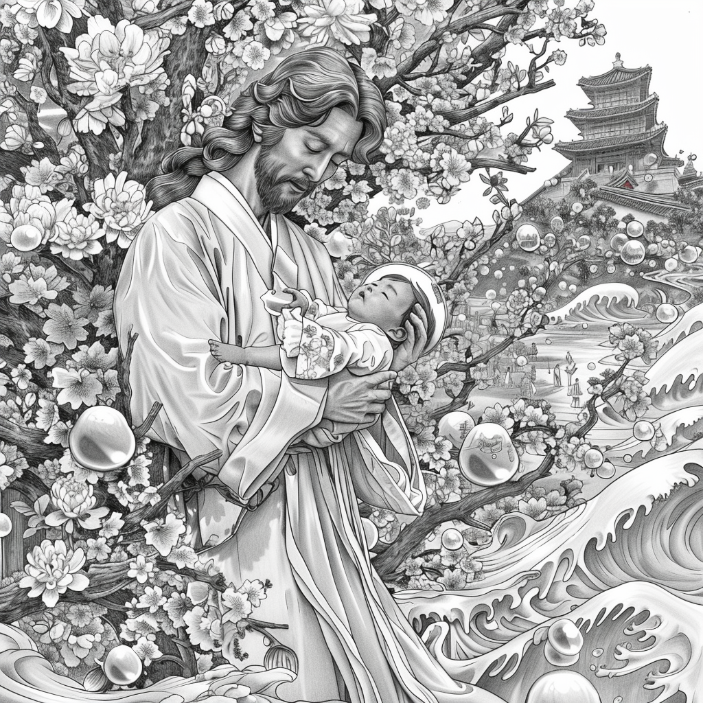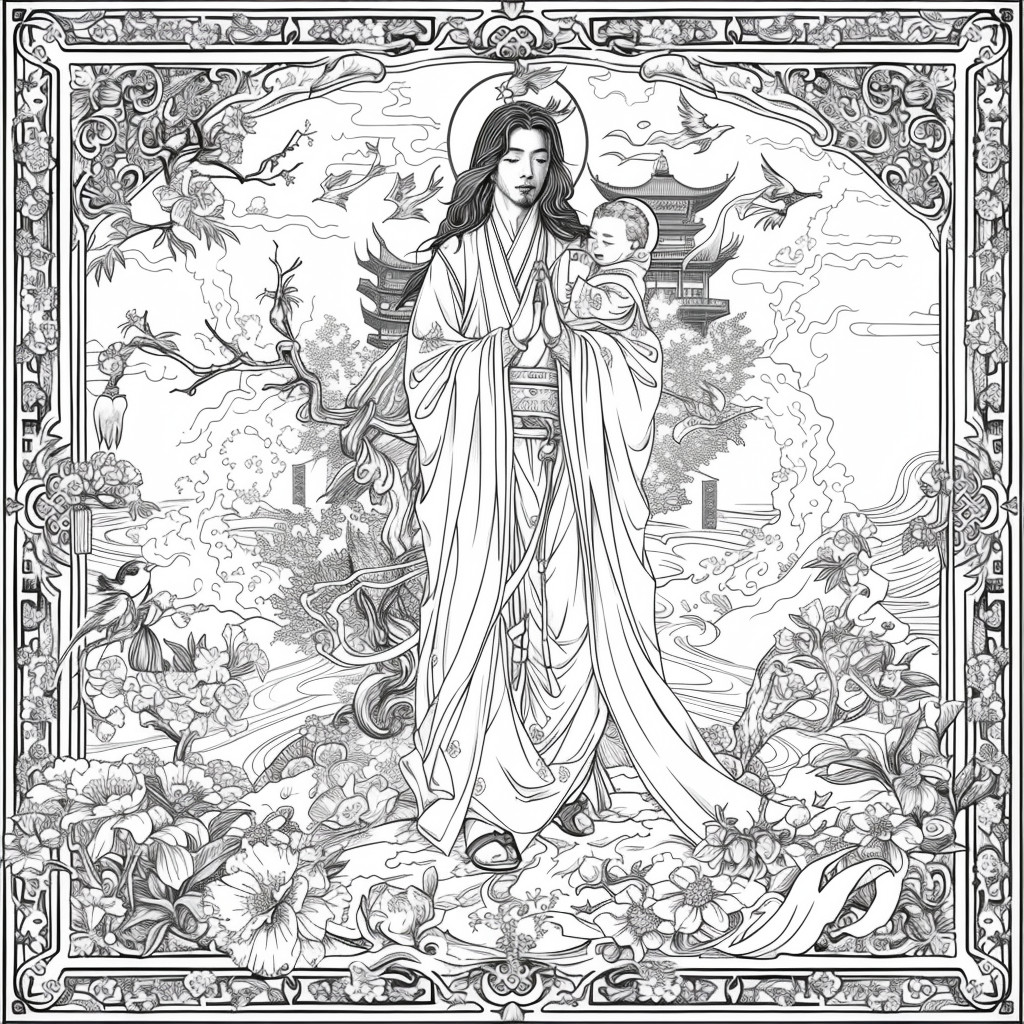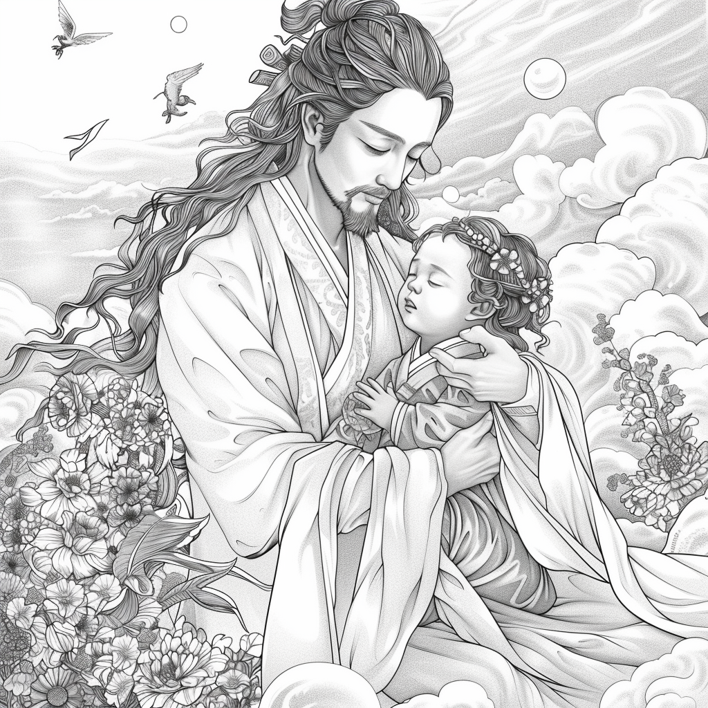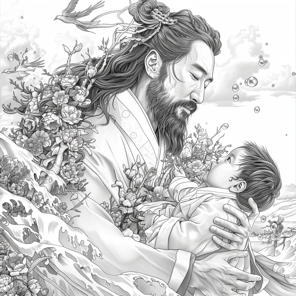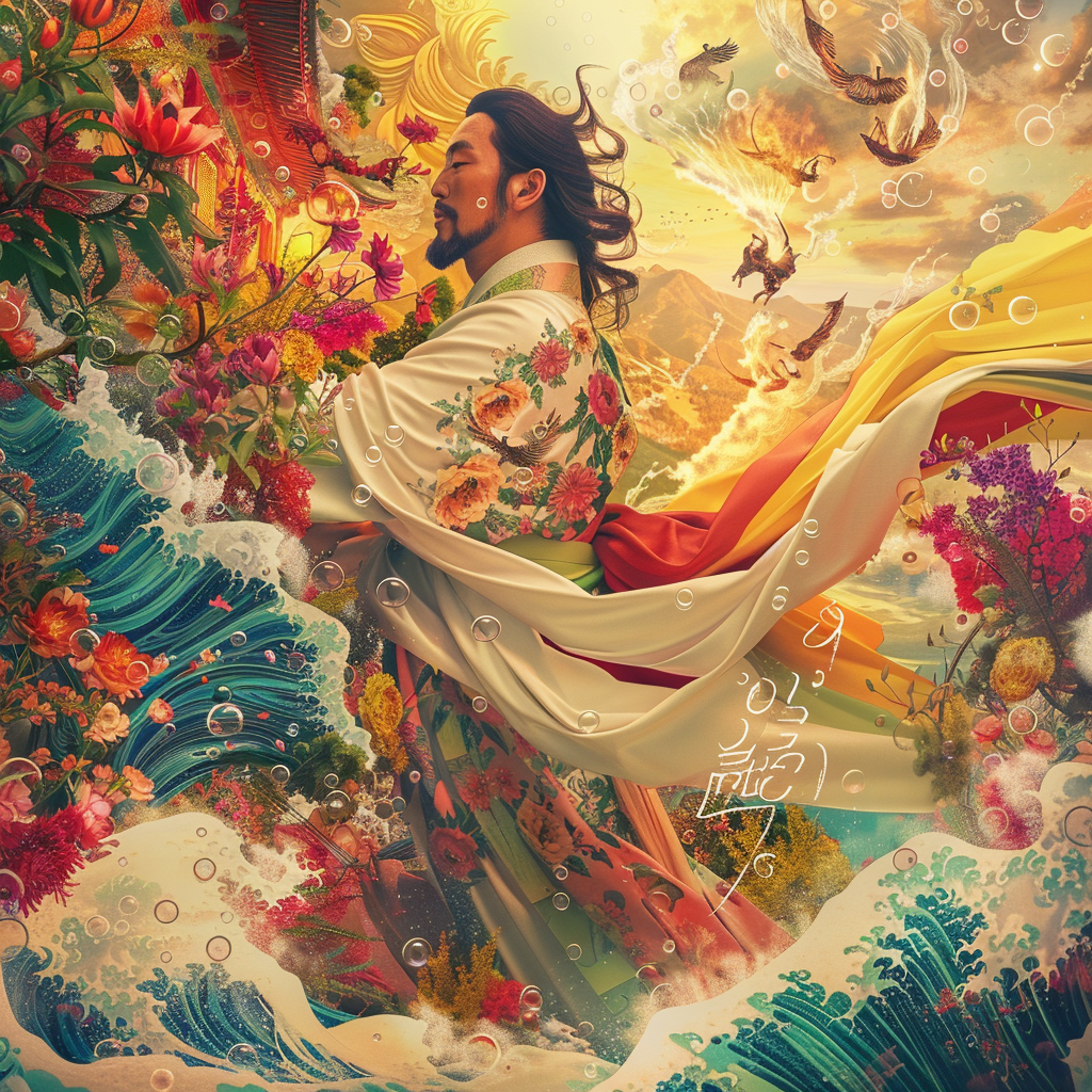 In a symphony of color and motion, a serene figure stands at the meeting point of ocean waves and golden skies, his eyes closed in deep prayer. Draped in flowing robes embroidered with blossoms, his garments catch the wind, trailing vibrant ribbons that blend into the radiant sunset. On one side, emerald waves crash with foaming vigor, cradling bursts of flowers; on the other, fiery clouds swirl with soaring eagles and dragons, heralding strength and divine presence. Between sea and sky, nature and spirit, this moment captures the unshakable peace of a soul anchored in faith yet lifted toward eternity.