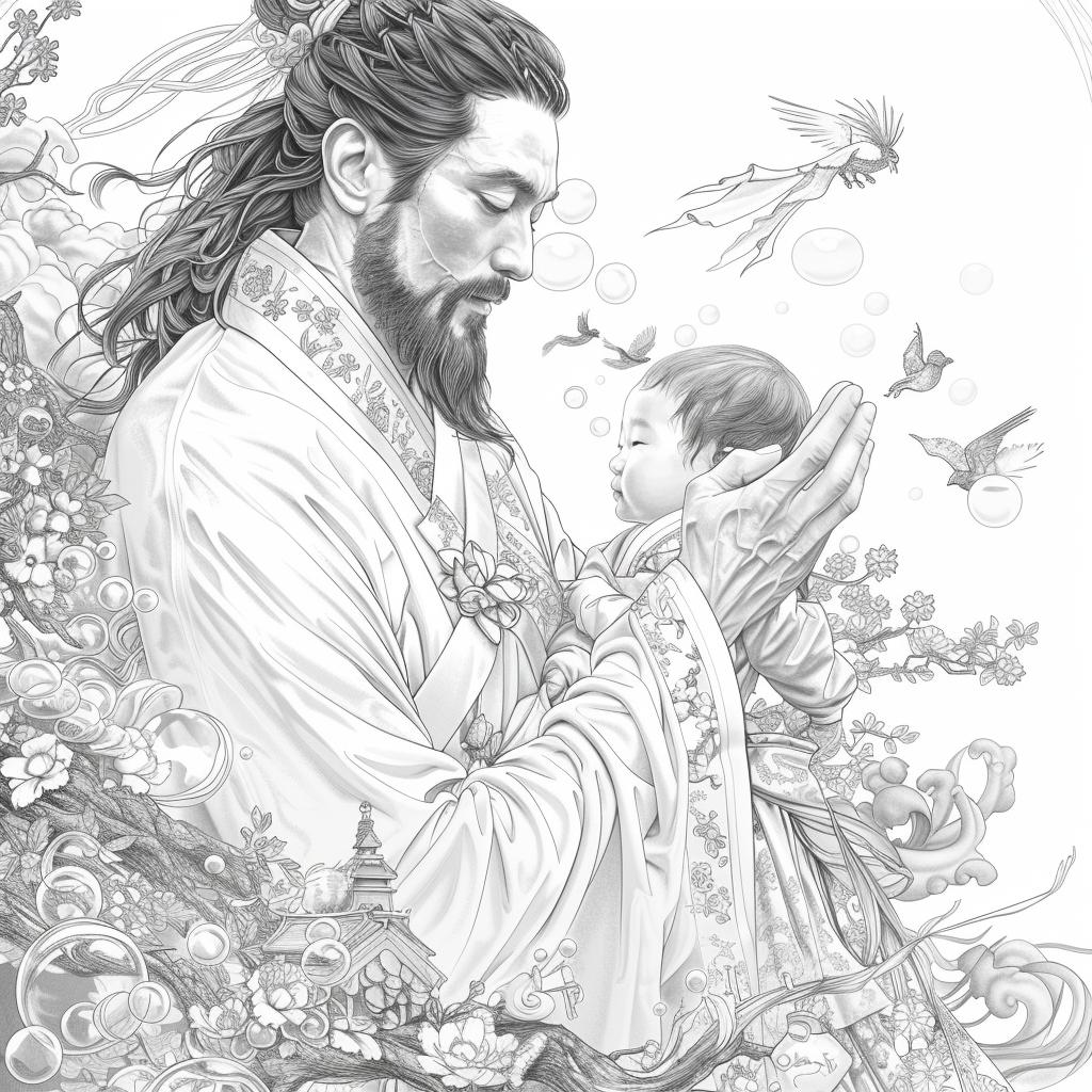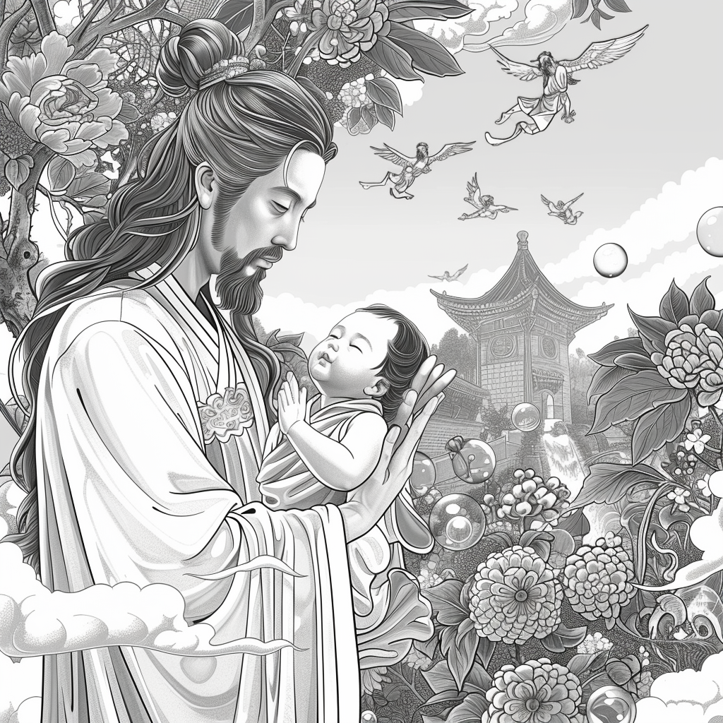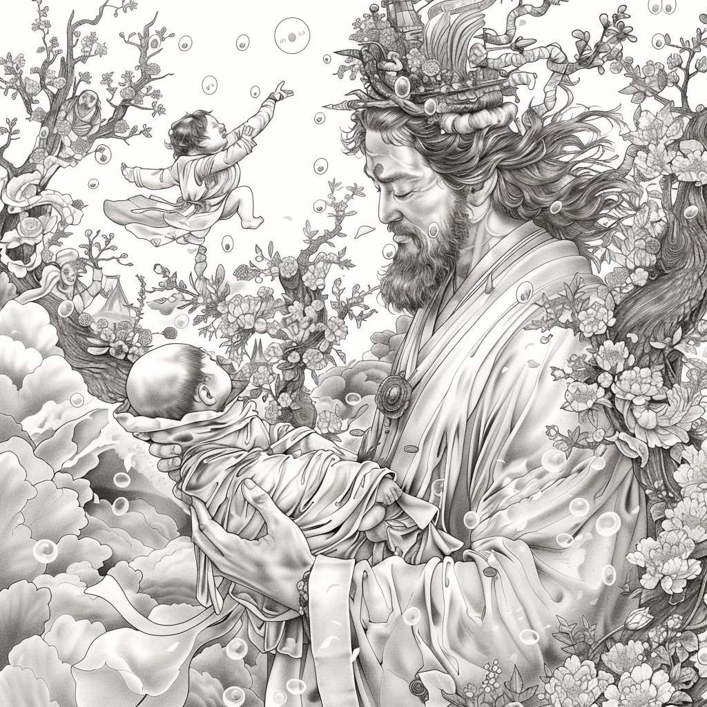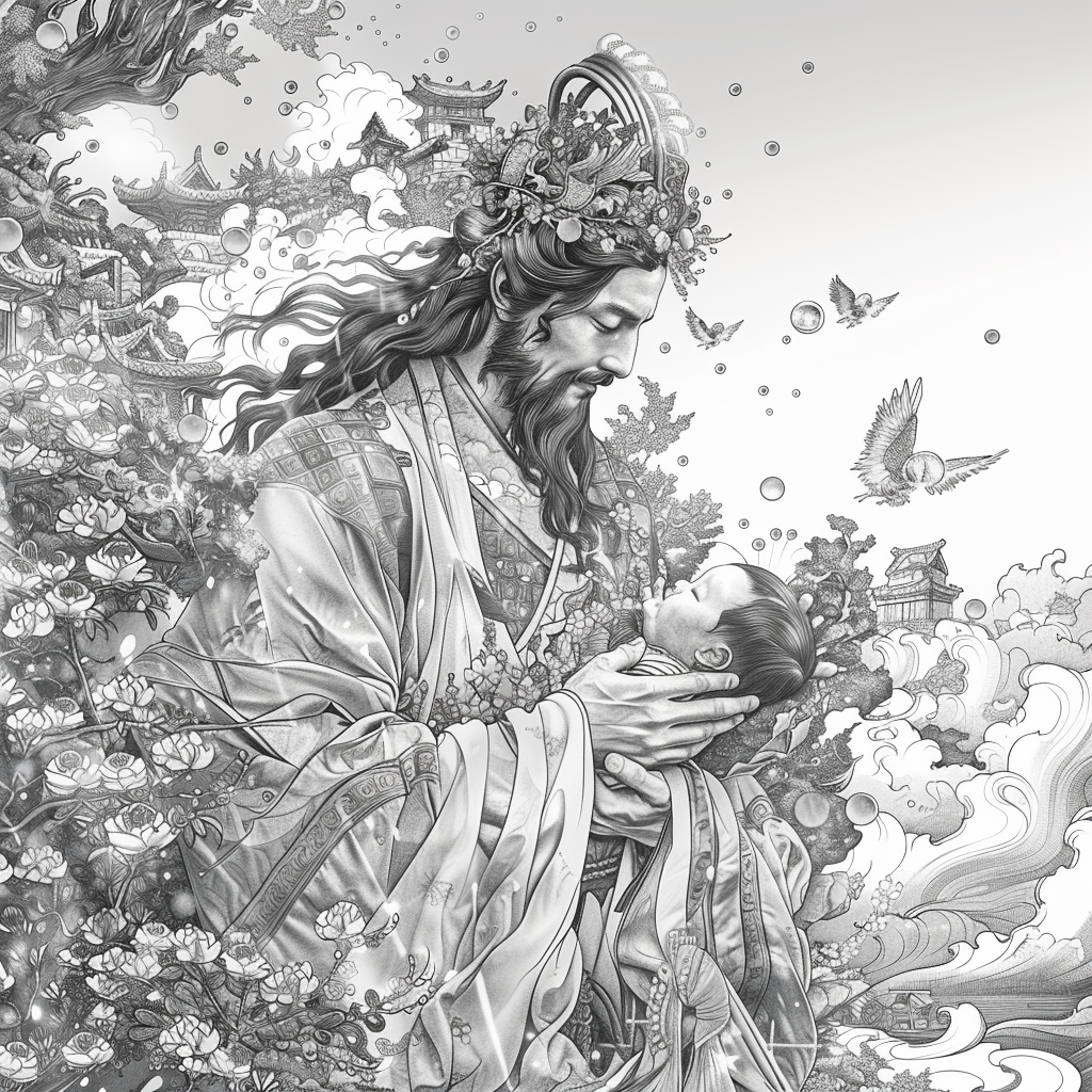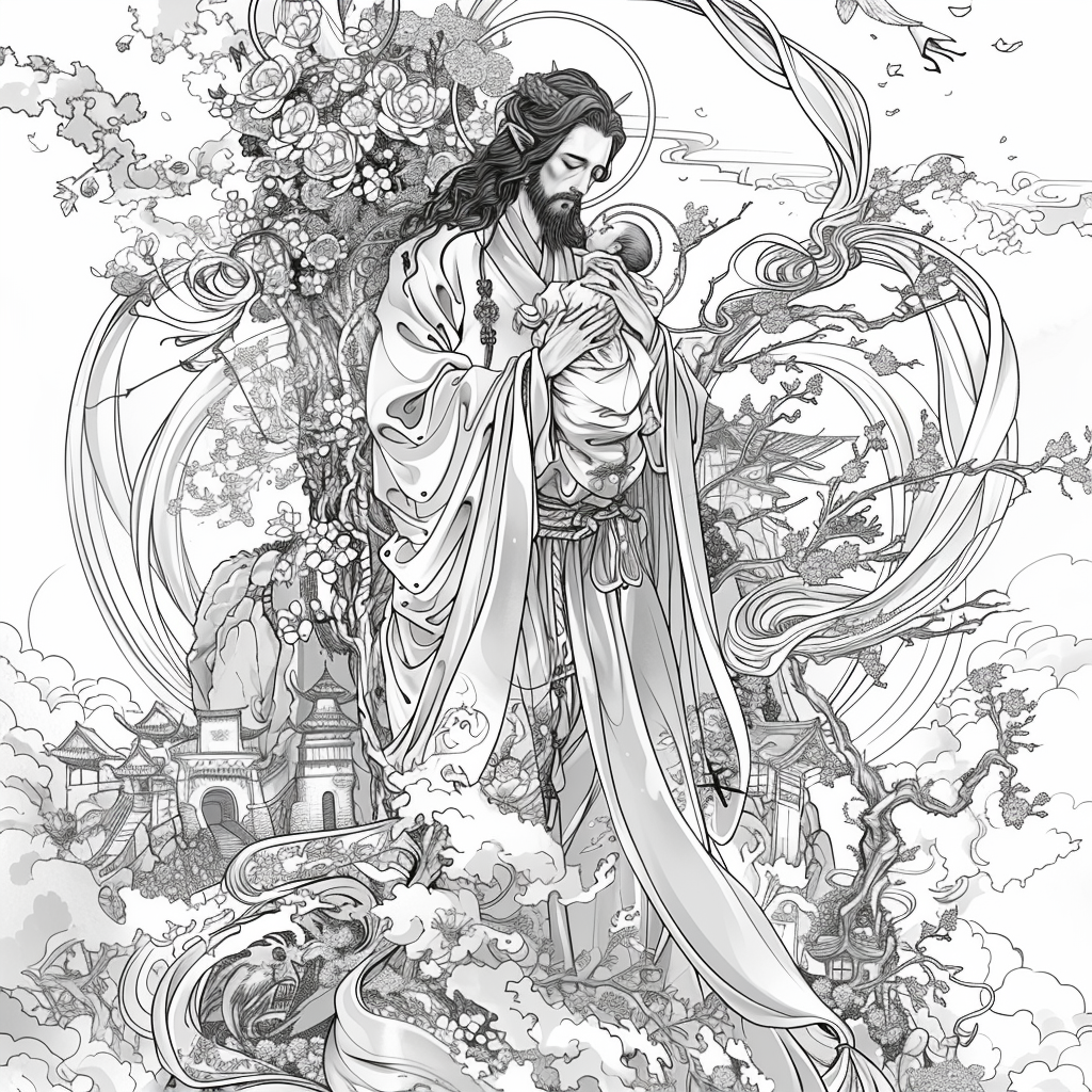 In a symphony of color and motion, a serene figure stands at the meeting point of ocean waves and golden skies, his eyes closed in deep prayer. Draped in flowing robes embroidered with blossoms, his garments catch the wind, trailing vibrant ribbons that blend into the radiant sunset. On one side, emerald waves crash with foaming vigor, cradling bursts of flowers; on the other, fiery clouds swirl with soaring eagles and dragons, heralding strength and divine presence. Between sea and sky, nature and spirit, this moment captures the unshakable peace of a soul anchored in faith yet lifted toward eternity.