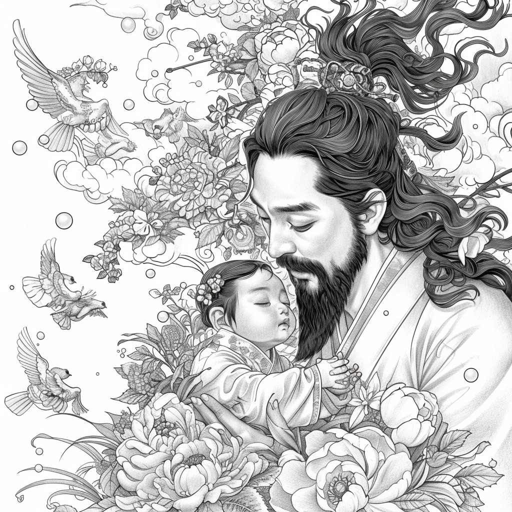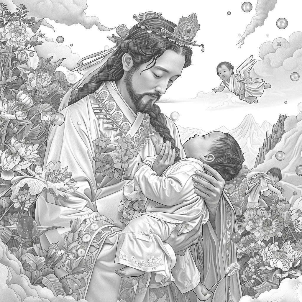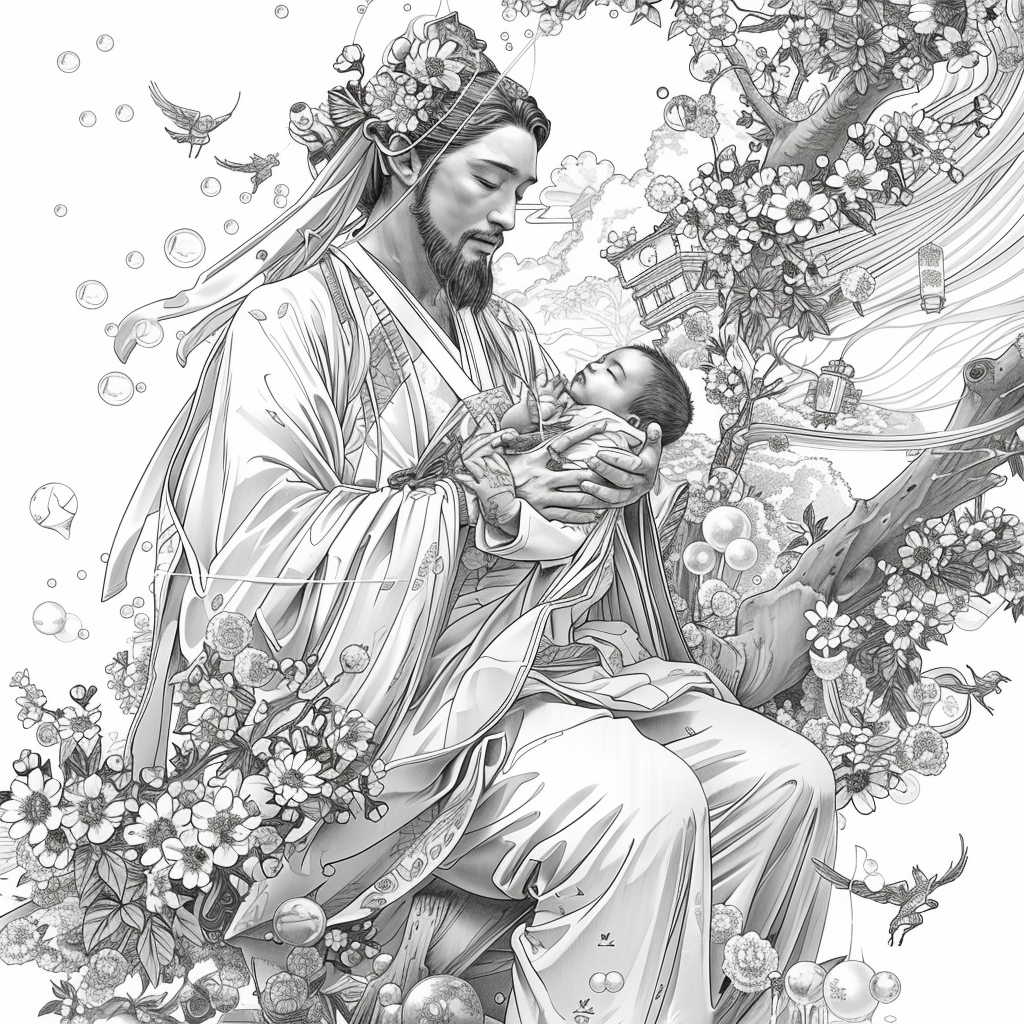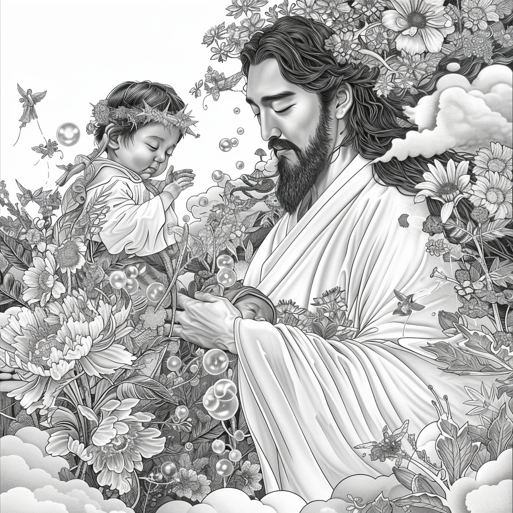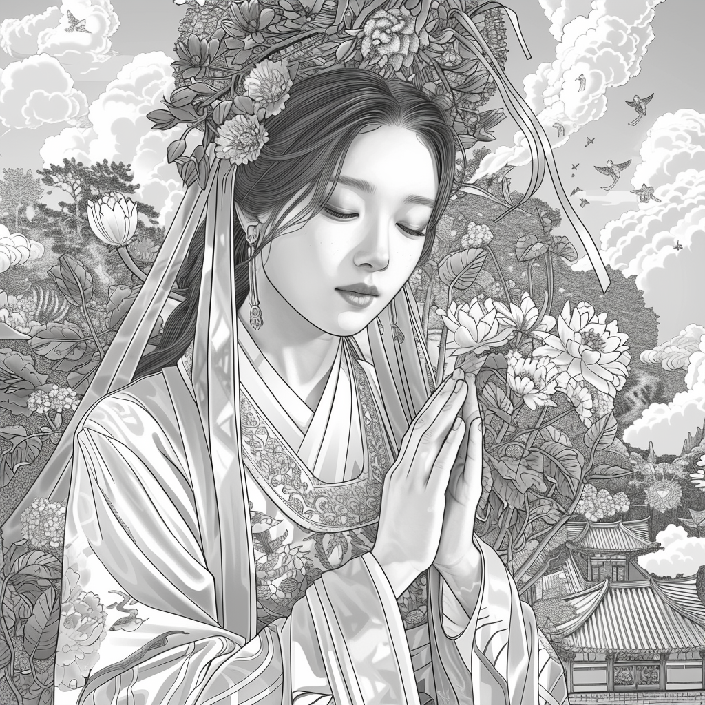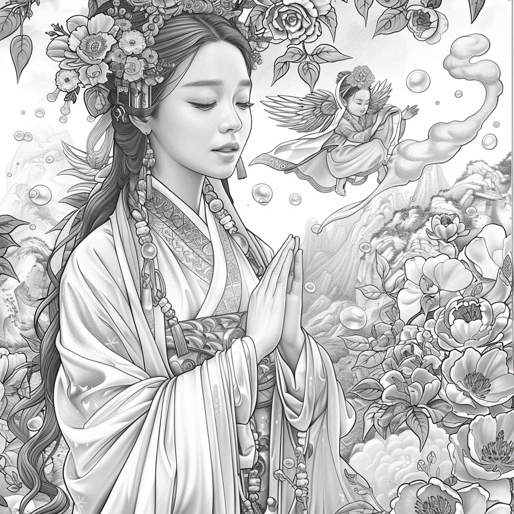 In a symphony of color and motion, a serene figure stands at the meeting point of ocean waves and golden skies, his eyes closed in deep prayer. Draped in flowing robes embroidered with blossoms, his garments catch the wind, trailing vibrant ribbons that blend into the radiant sunset. On one side, emerald waves crash with foaming vigor, cradling bursts of flowers; on the other, fiery clouds swirl with soaring eagles and dragons, heralding strength and divine presence. Between sea and sky, nature and spirit, this moment captures the unshakable peace of a soul anchored in faith yet lifted toward eternity.