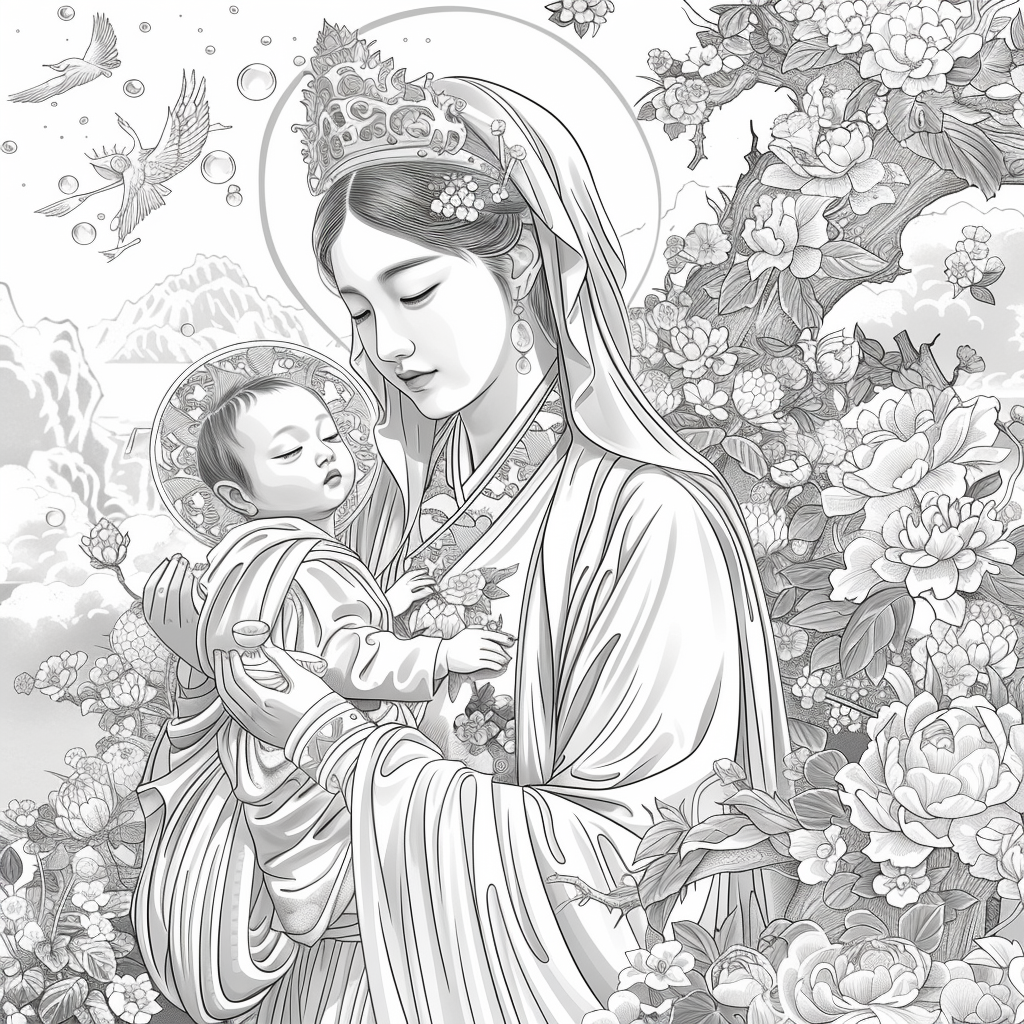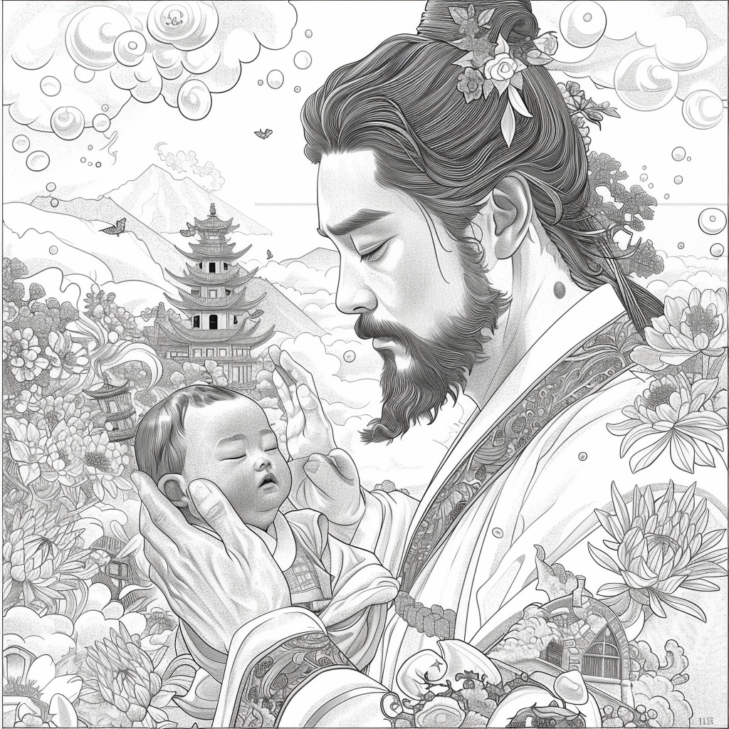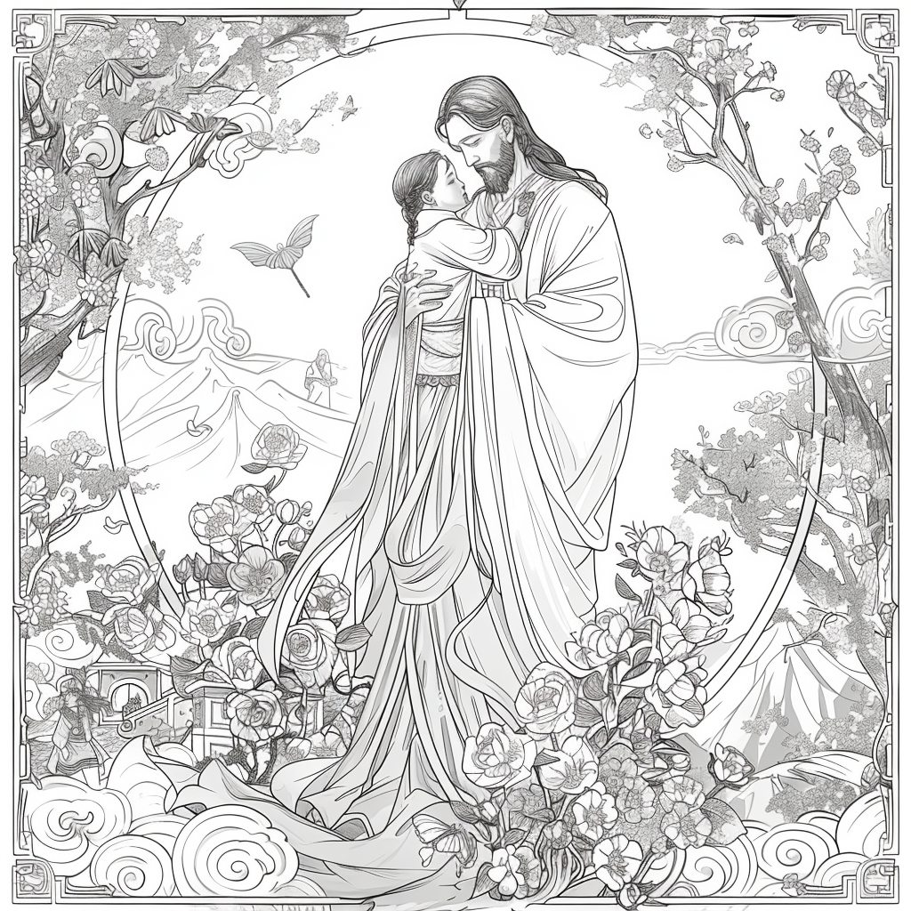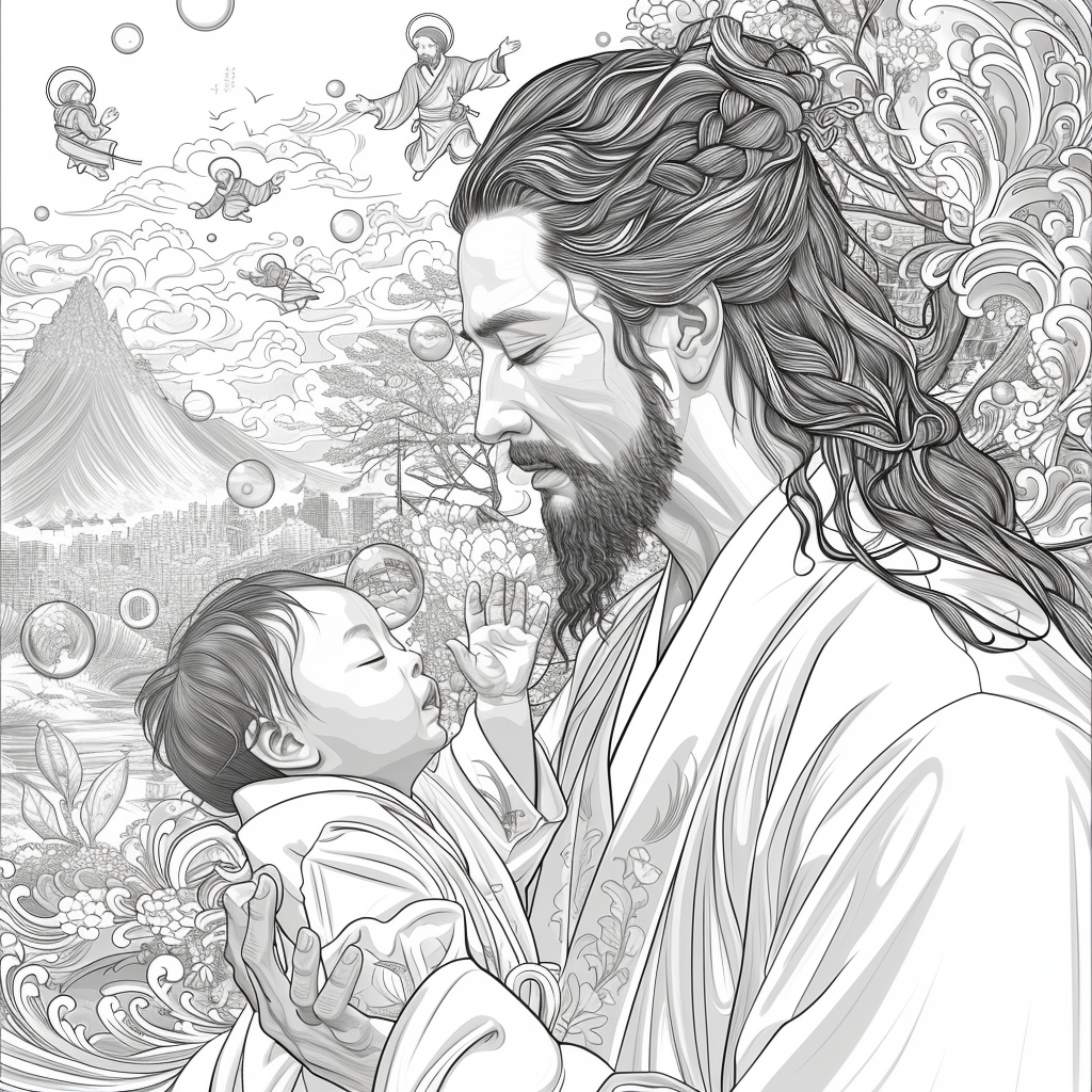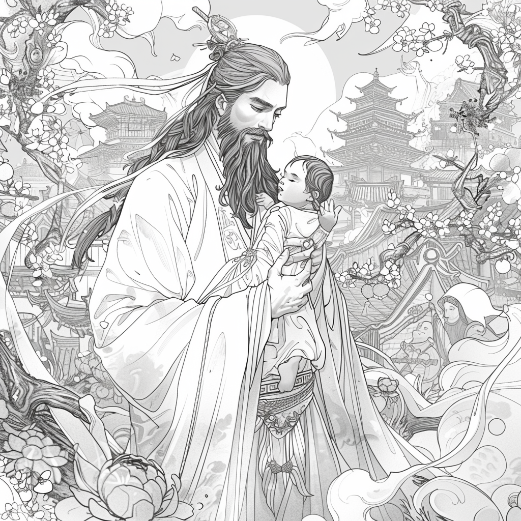 In a symphony of color and motion, a serene figure stands at the meeting point of ocean waves and golden skies, his eyes closed in deep prayer. Draped in flowing robes embroidered with blossoms, his garments catch the wind, trailing vibrant ribbons that blend into the radiant sunset. On one side, emerald waves crash with foaming vigor, cradling bursts of flowers; on the other, fiery clouds swirl with soaring eagles and dragons, heralding strength and divine presence. Between sea and sky, nature and spirit, this moment captures the unshakable peace of a soul anchored in faith yet lifted toward eternity.