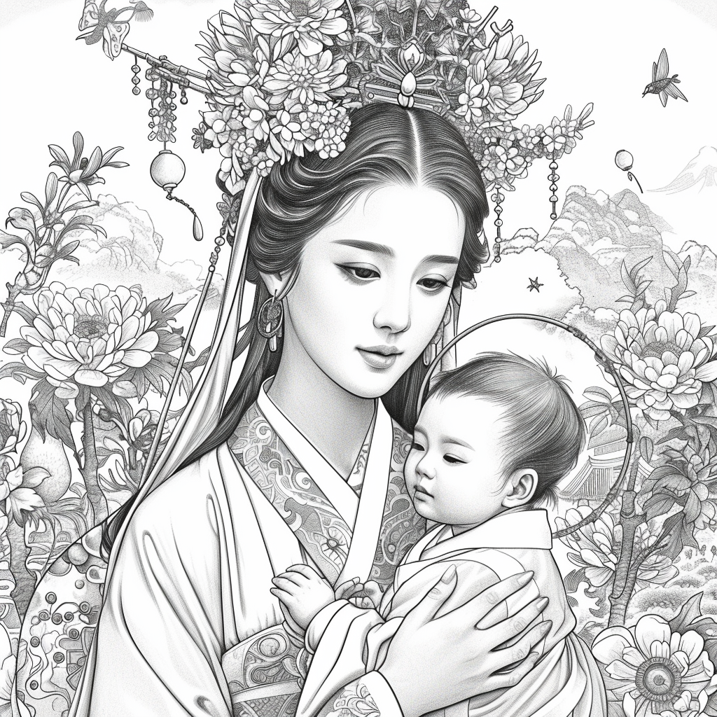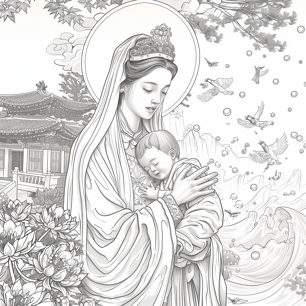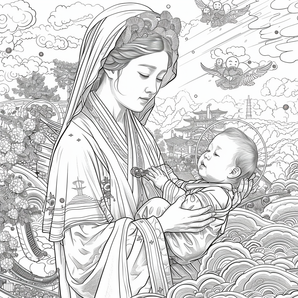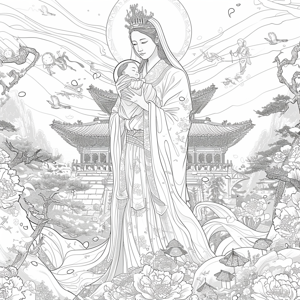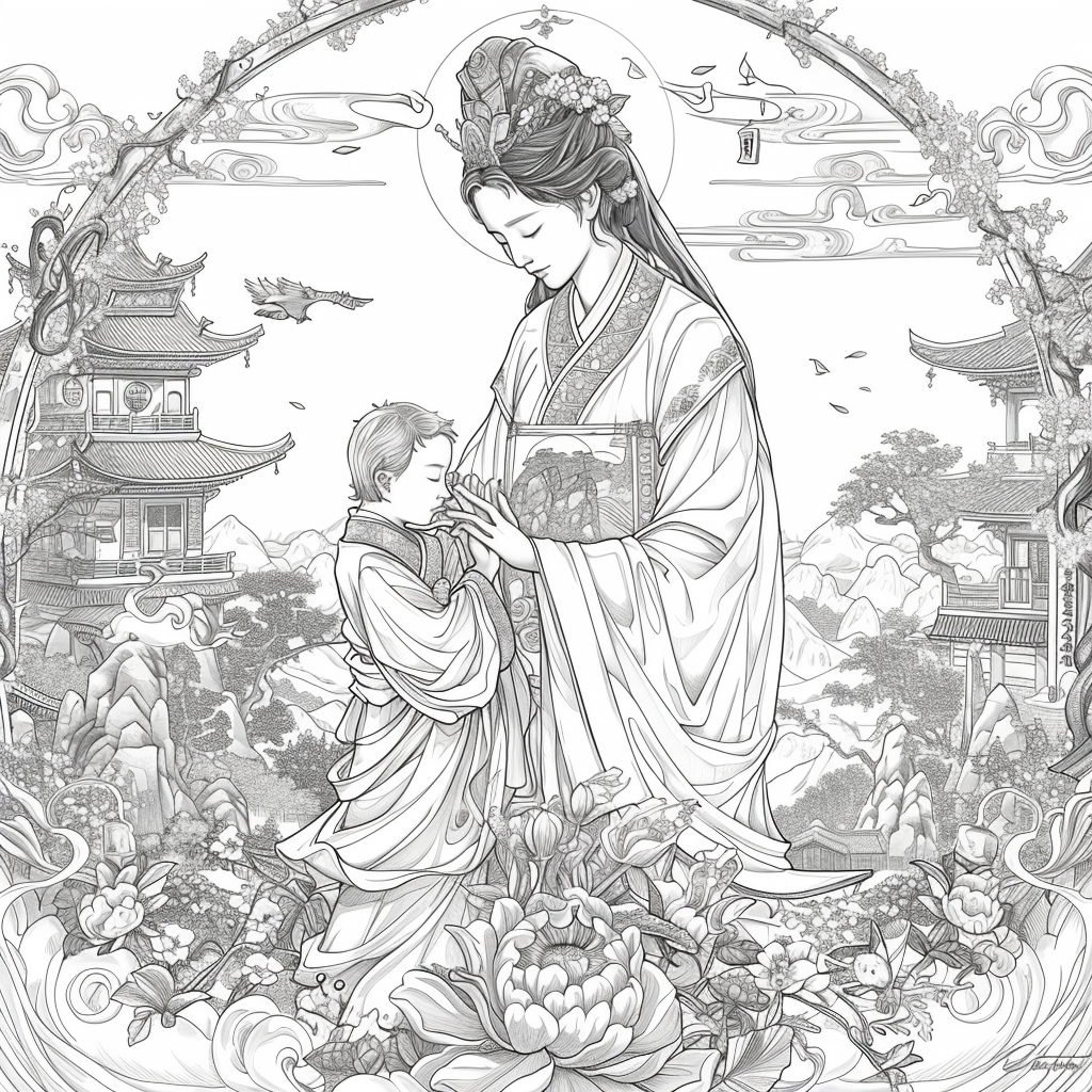 In a symphony of color and motion, a serene figure stands at the meeting point of ocean waves and golden skies, his eyes closed in deep prayer. Draped in flowing robes embroidered with blossoms, his garments catch the wind, trailing vibrant ribbons that blend into the radiant sunset. On one side, emerald waves crash with foaming vigor, cradling bursts of flowers; on the other, fiery clouds swirl with soaring eagles and dragons, heralding strength and divine presence. Between sea and sky, nature and spirit, this moment captures the unshakable peace of a soul anchored in faith yet lifted toward eternity.