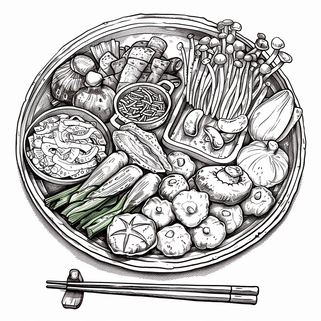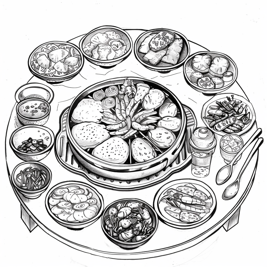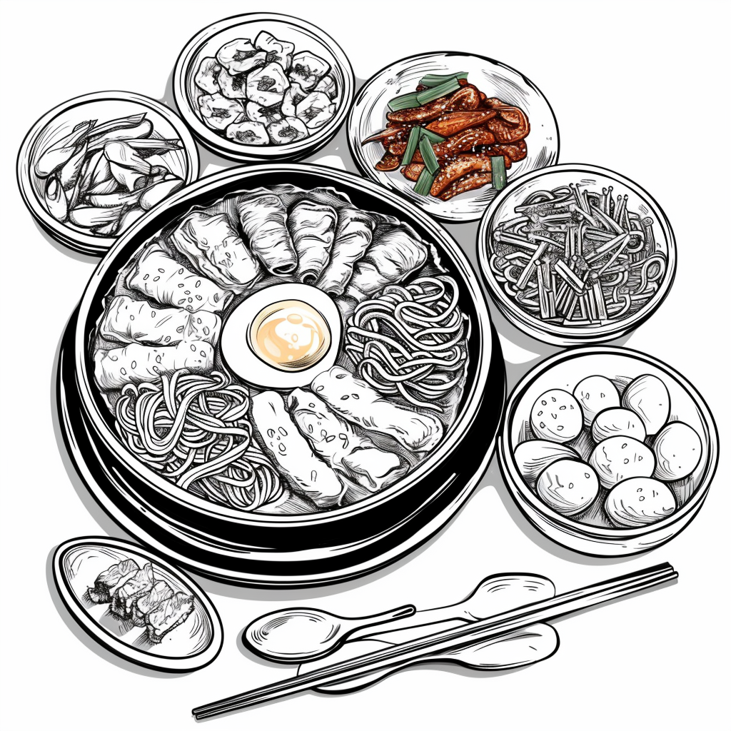 Set in a traditional bapsang (Korean meal table setting), this vibrant composition celebrates not only the diversity of Korean flavors but also the beauty of mindful eating and cultural richness. The wooden tray, chopsticks, and spoon enhance the rustic authenticity, while the painterly strokes bring the meal to life with every brush of color.