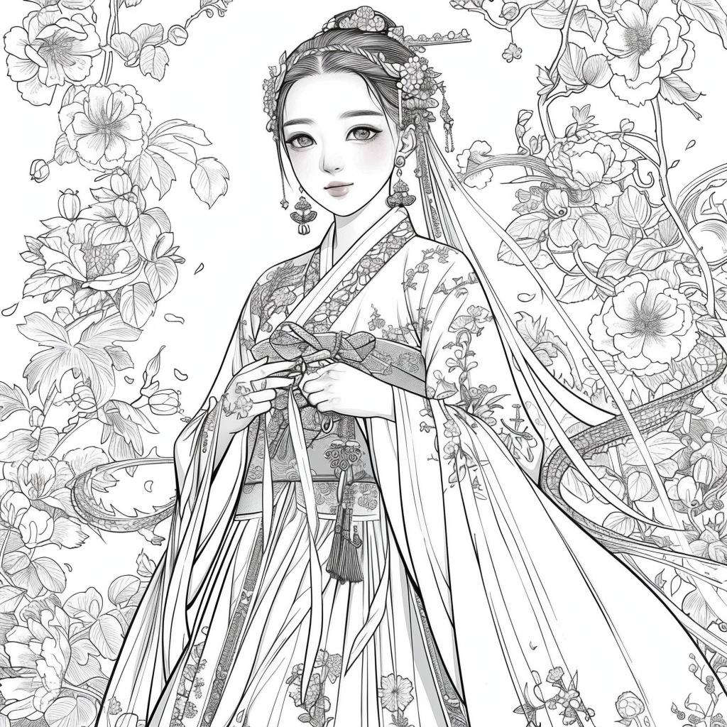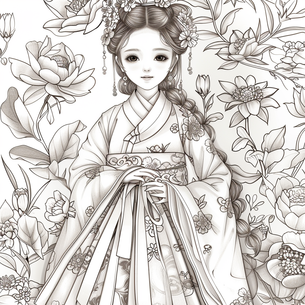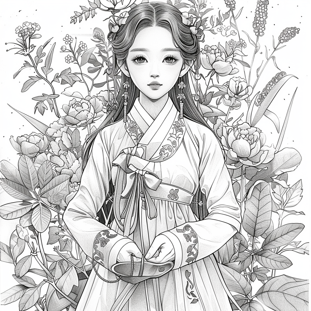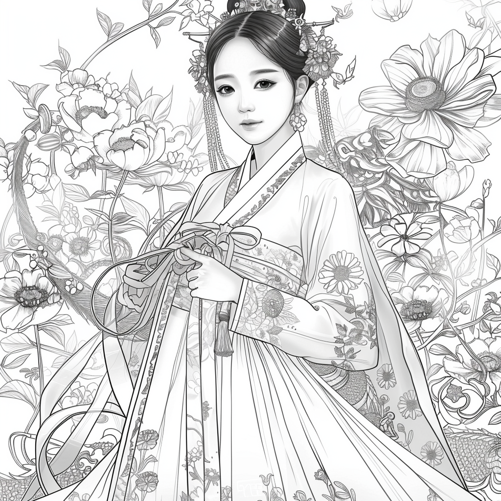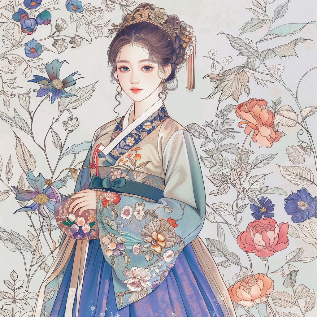 A radiant young woman dressed in a lavishly embroidered hanbok stands amidst a garden of softly illustrated blossoms. Her garments shimmer in pastel tones of sky blue, cream, and sapphire, decorated with intricate floral patterns that echo the delicate petals around her. A golden hairpiece and elegant accessories highlight her royal poise, while her gentle gaze evokes timeless charm. She represents both the elegance of Korean tradition and the spirit of nature’s renewal.