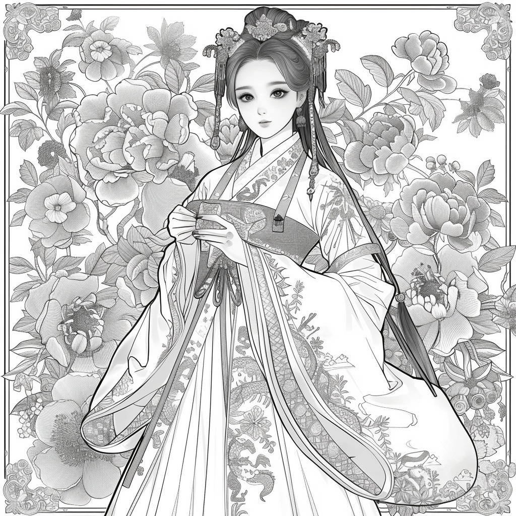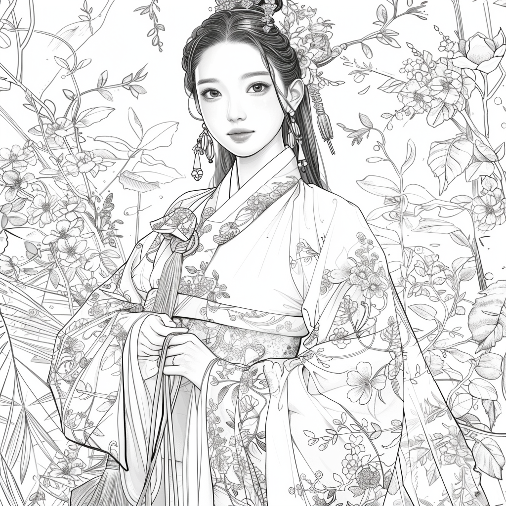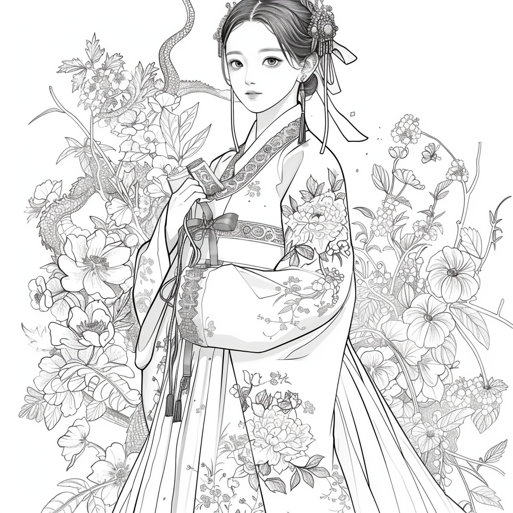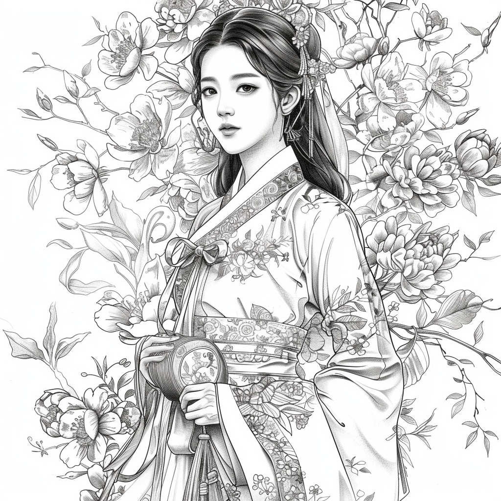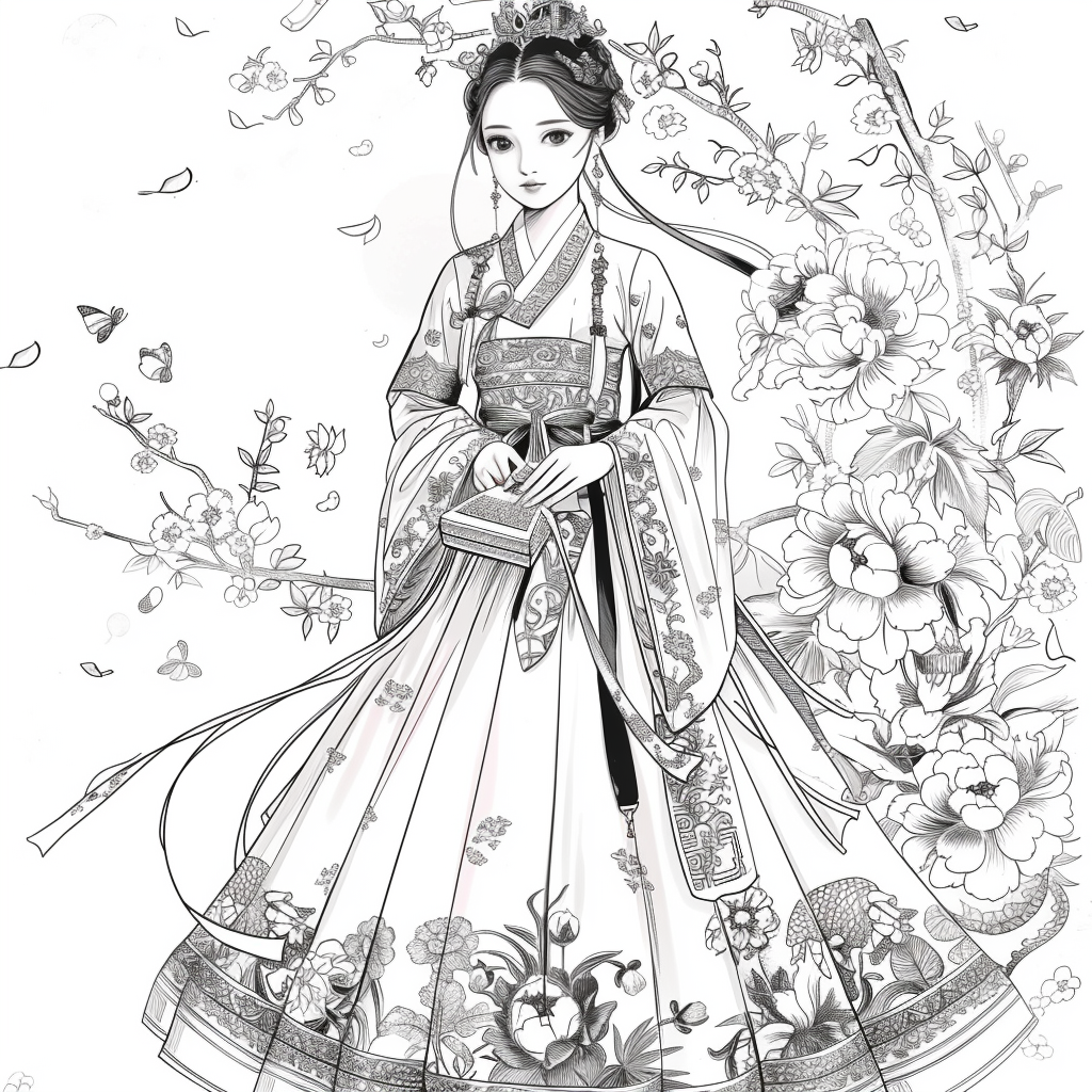 A radiant young woman dressed in a lavishly embroidered hanbok stands amidst a garden of softly illustrated blossoms. Her garments shimmer in pastel tones of sky blue, cream, and sapphire, decorated with intricate floral patterns that echo the delicate petals around her. A golden hairpiece and elegant accessories highlight her royal poise, while her gentle gaze evokes timeless charm. She represents both the elegance of Korean tradition and the spirit of nature’s renewal.