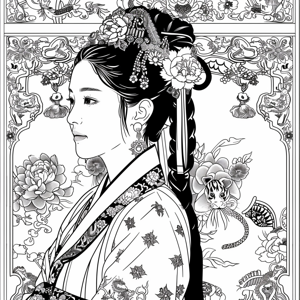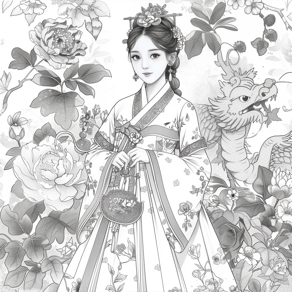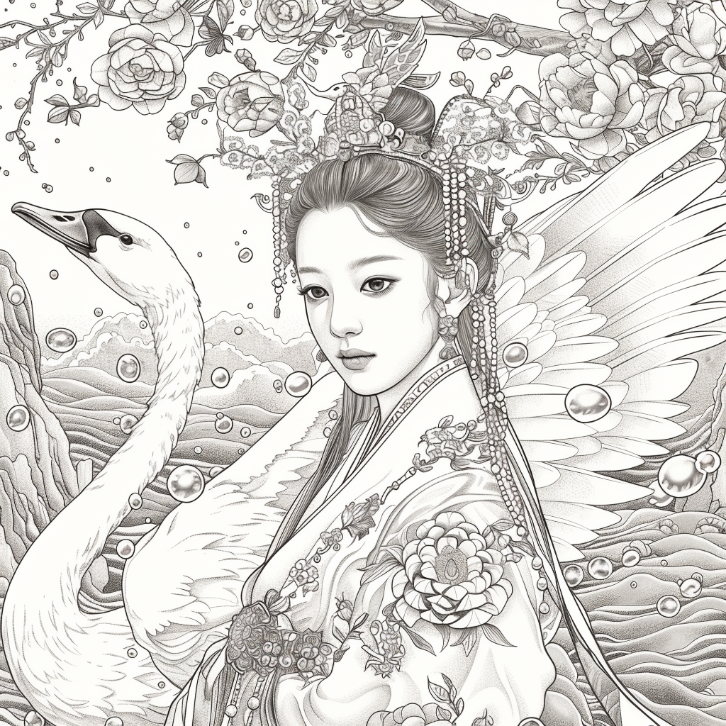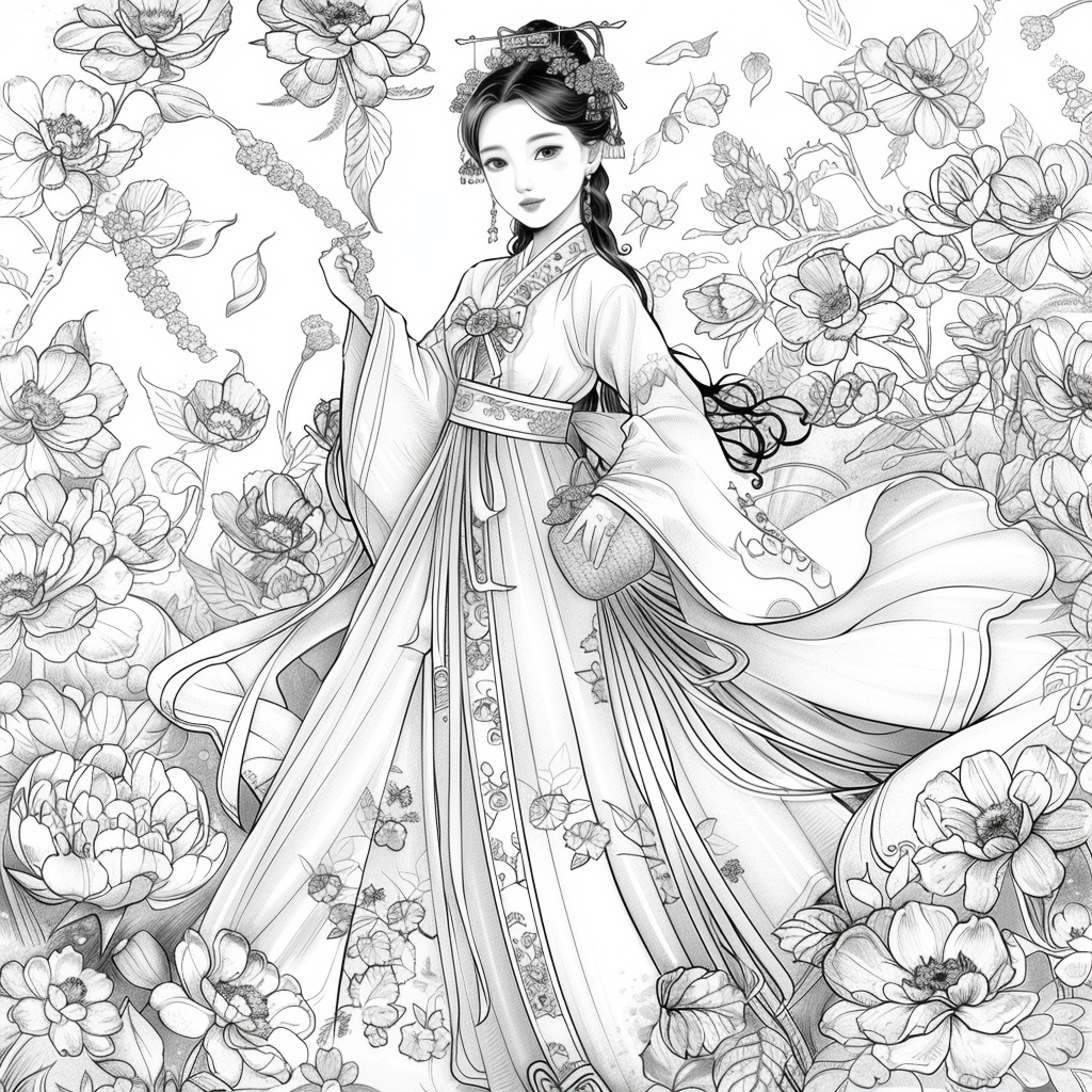 A radiant young woman dressed in a lavishly embroidered hanbok stands amidst a garden of softly illustrated blossoms. Her garments shimmer in pastel tones of sky blue, cream, and sapphire, decorated with intricate floral patterns that echo the delicate petals around her. A golden hairpiece and elegant accessories highlight her royal poise, while her gentle gaze evokes timeless charm. She represents both the elegance of Korean tradition and the spirit of nature’s renewal.