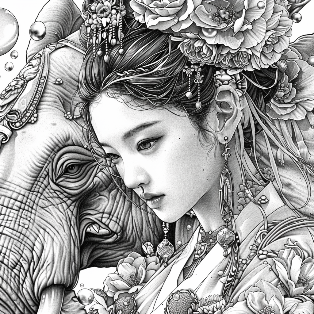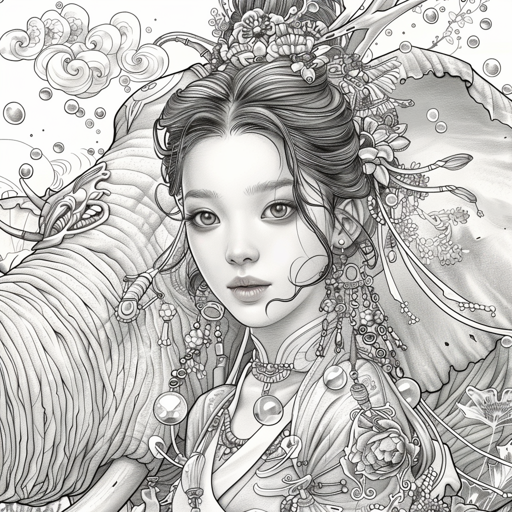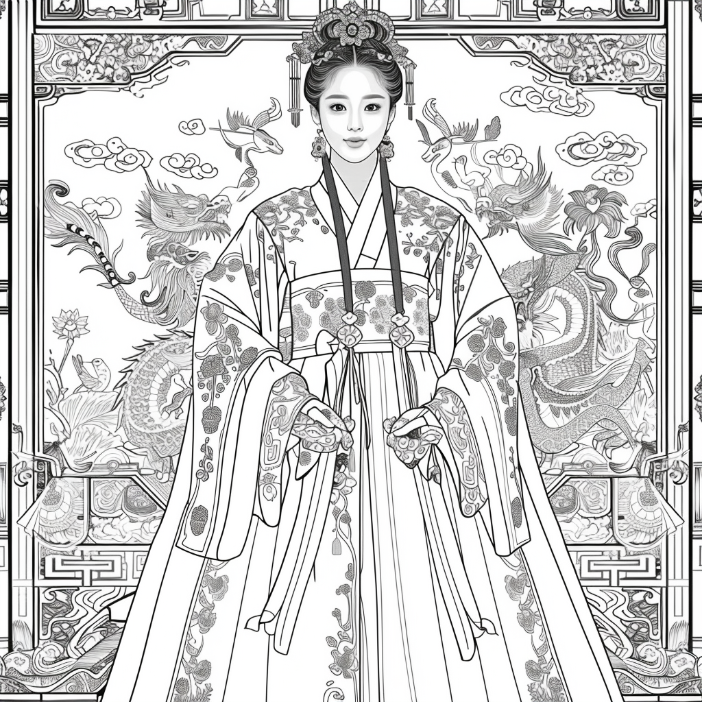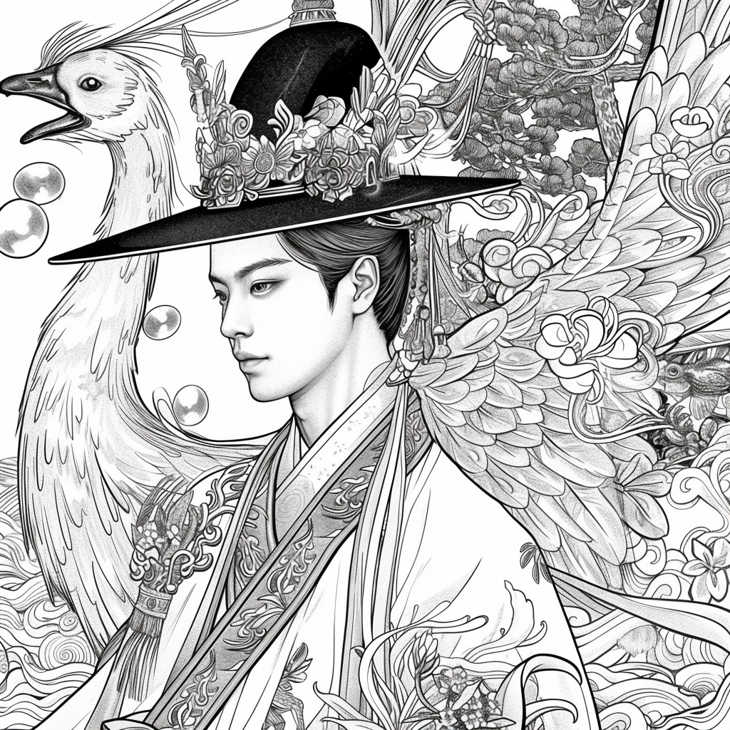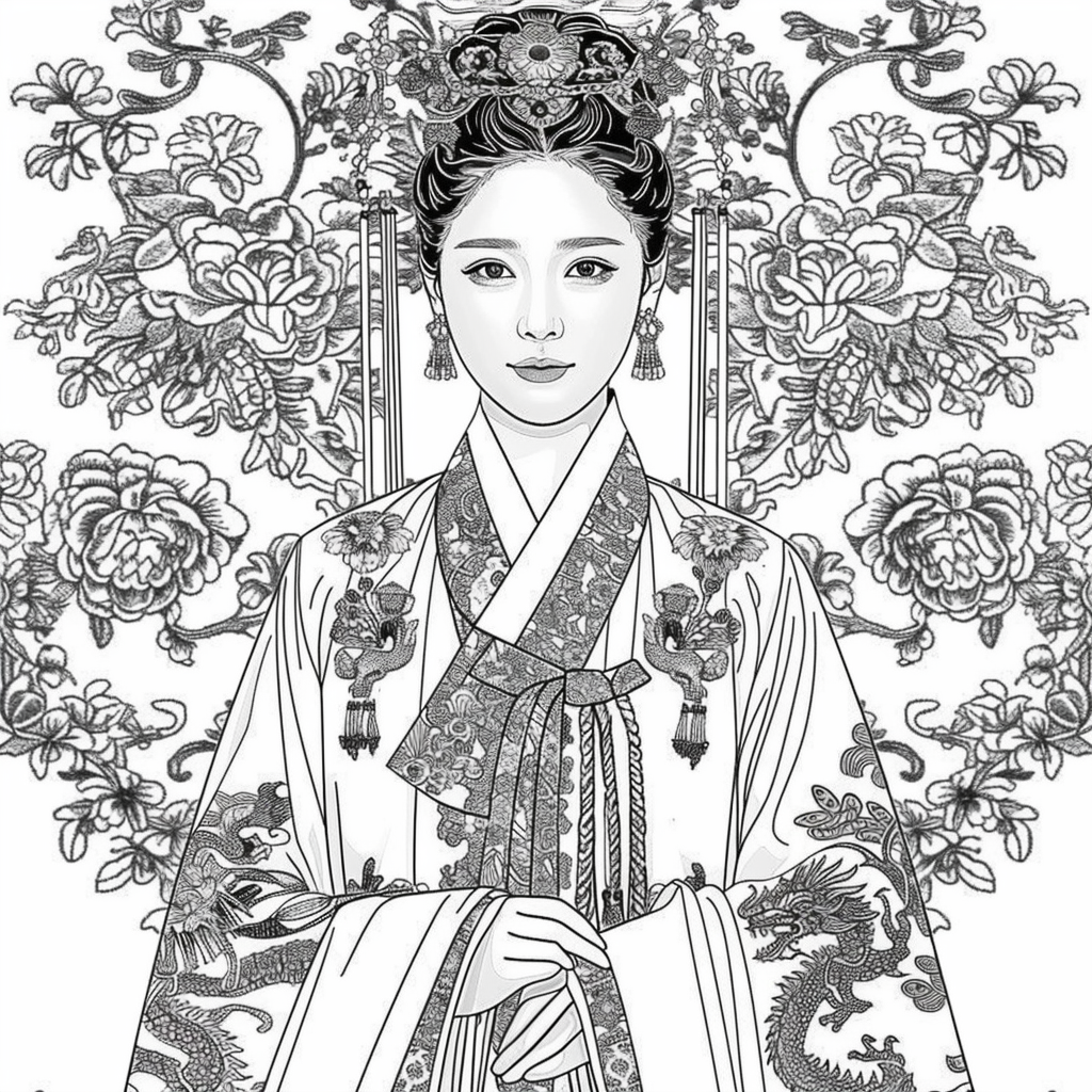 A radiant young woman dressed in a lavishly embroidered hanbok stands amidst a garden of softly illustrated blossoms. Her garments shimmer in pastel tones of sky blue, cream, and sapphire, decorated with intricate floral patterns that echo the delicate petals around her. A golden hairpiece and elegant accessories highlight her royal poise, while her gentle gaze evokes timeless charm. She represents both the elegance of Korean tradition and the spirit of nature’s renewal.
