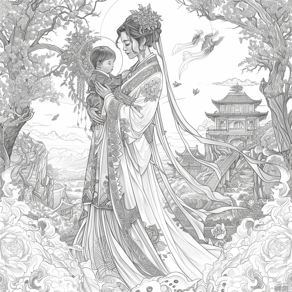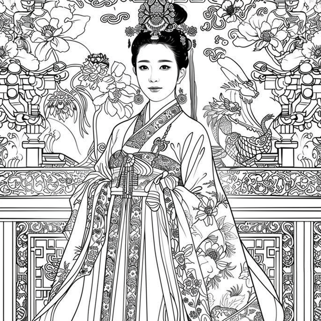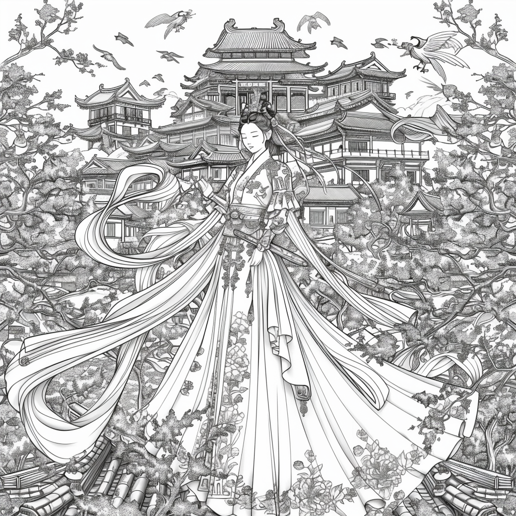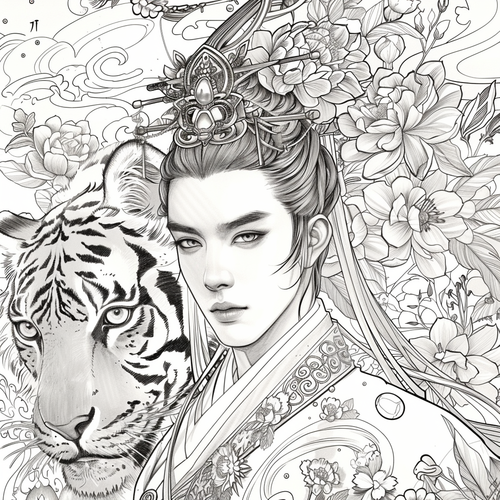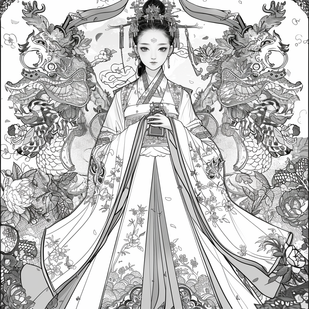 A radiant young woman dressed in a lavishly embroidered hanbok stands amidst a garden of softly illustrated blossoms. Her garments shimmer in pastel tones of sky blue, cream, and sapphire, decorated with intricate floral patterns that echo the delicate petals around her. A golden hairpiece and elegant accessories highlight her royal poise, while her gentle gaze evokes timeless charm. She represents both the elegance of Korean tradition and the spirit of nature’s renewal.