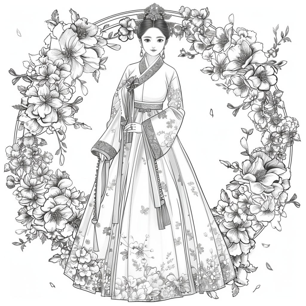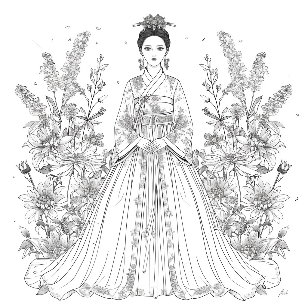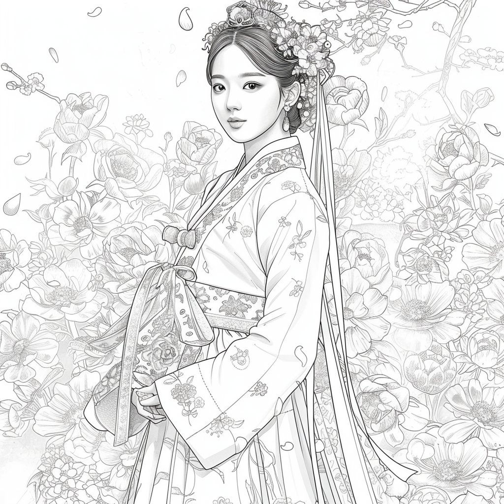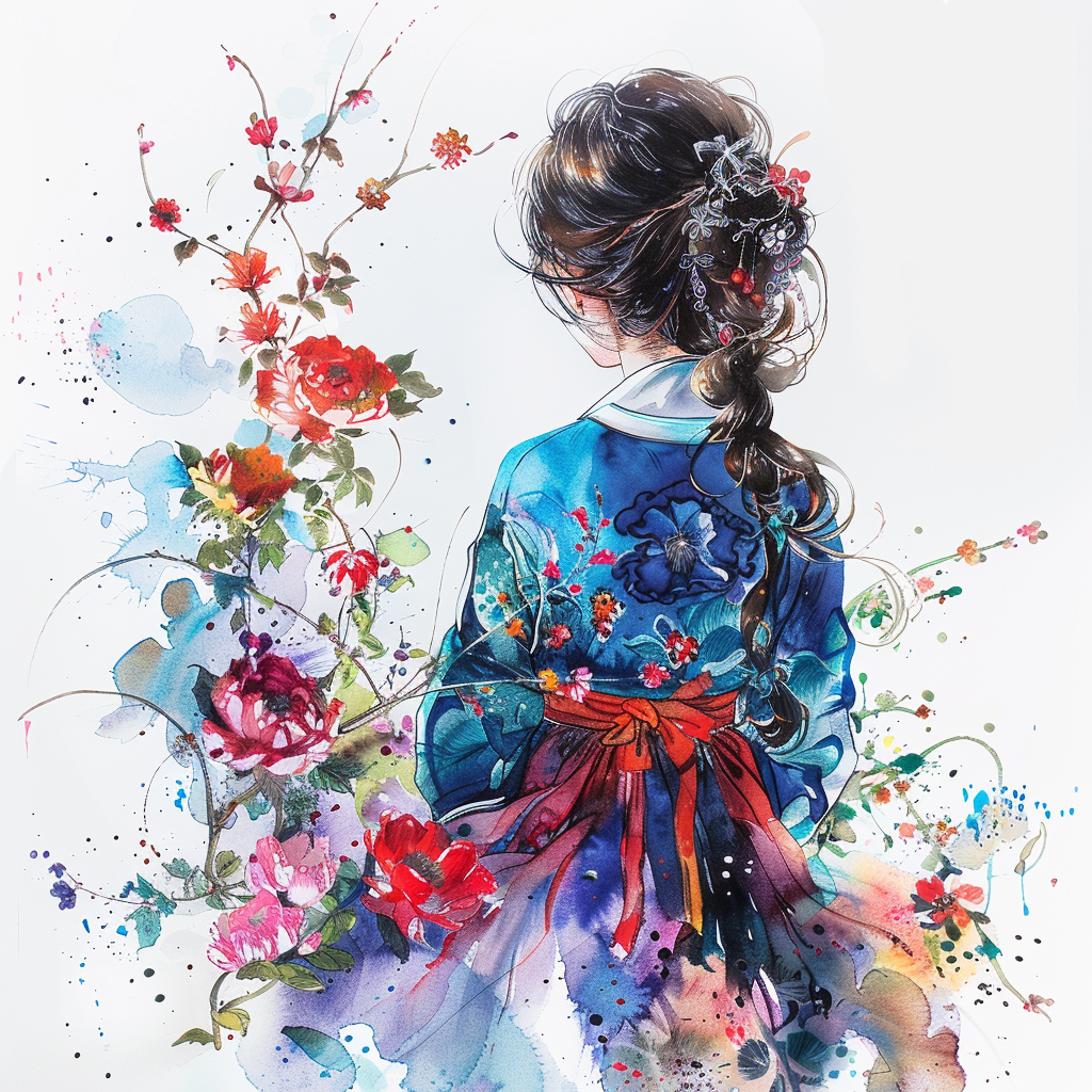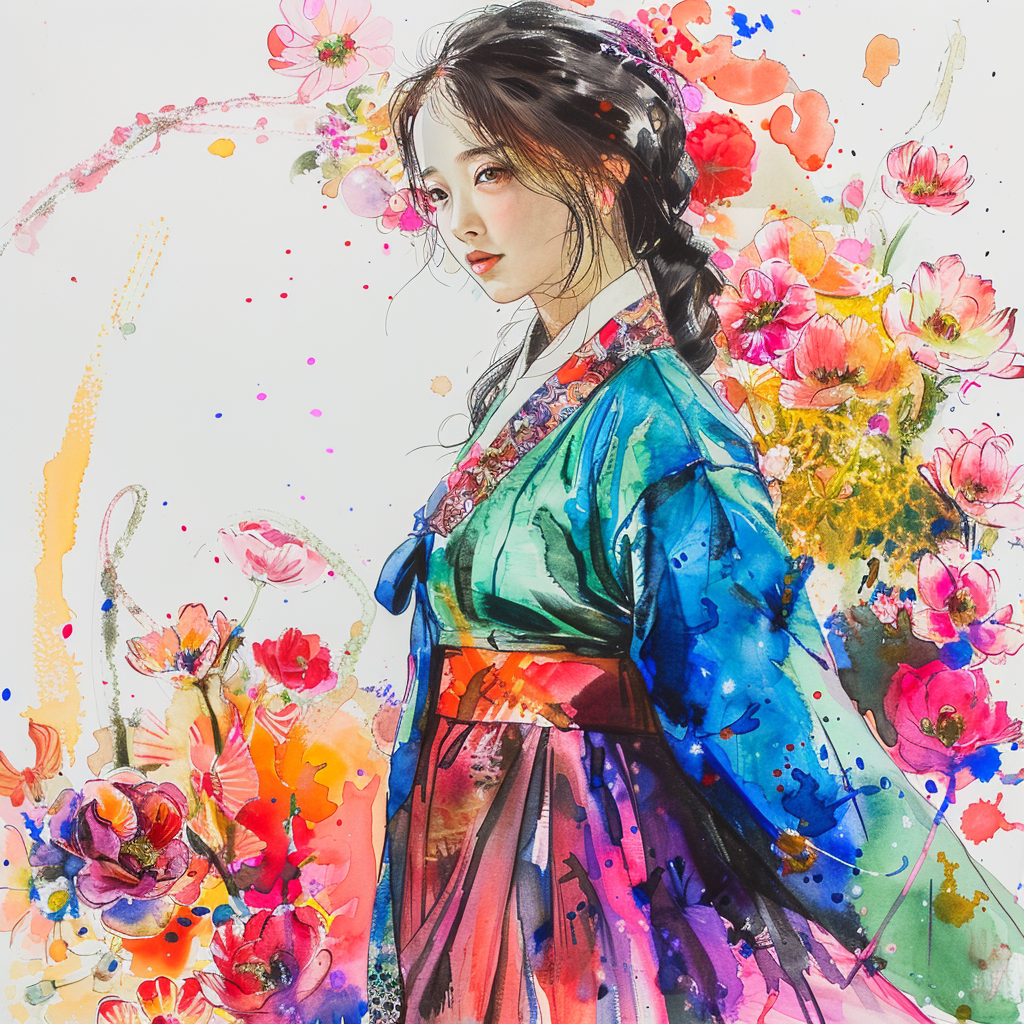 Bathed in a vivid cascade of watercolor splashes and blooming petals, this portrait captures the graceful beauty of a young Korean woman in traditional hanbok. Her poise and calm expression are accentuated by the dynamic interplay of colors — vibrant reds, lush greens, and electric blues — dancing across the fabric and background. Surrounding her are bold blossoms, delicately merging realism with abstraction, symbolizing youthful elegance, cultural pride, and the artistic bloom of life. A breathtaking blend of tradition and modern painterly expression.