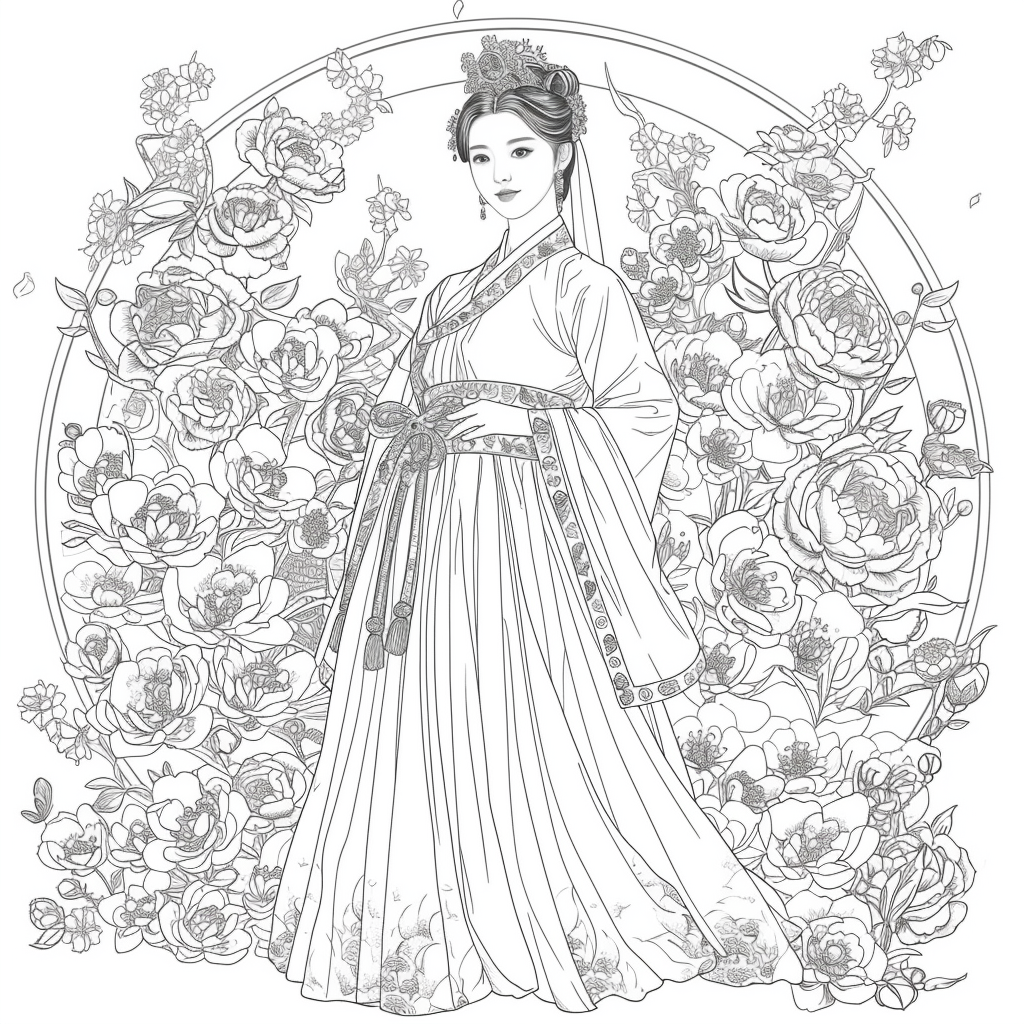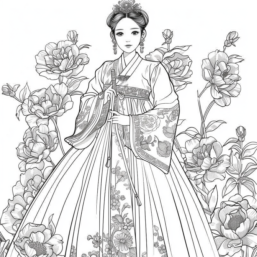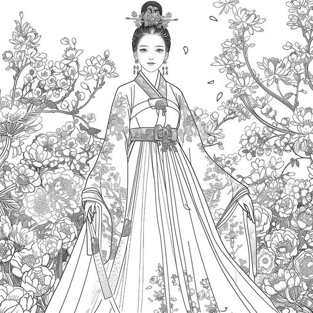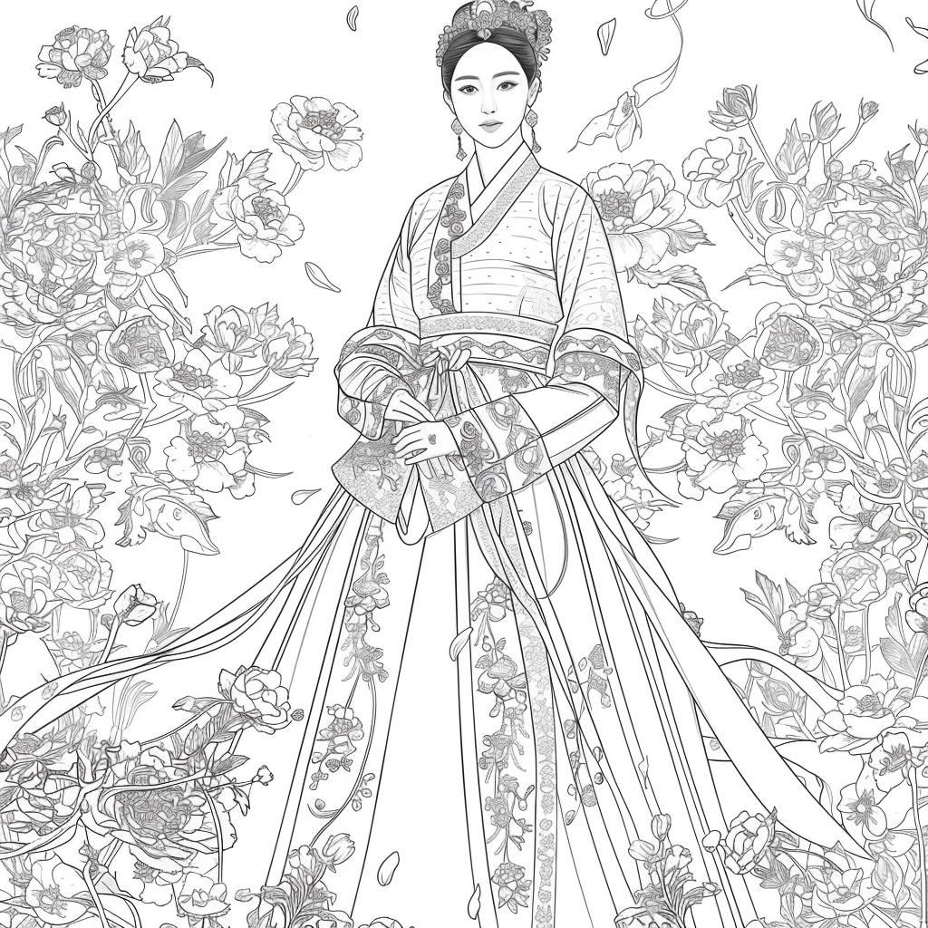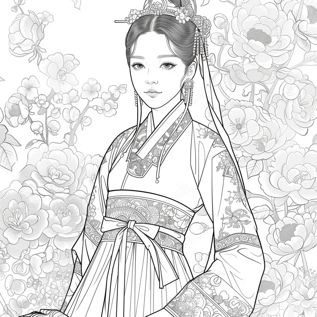 Bathed in a vivid cascade of watercolor splashes and blooming petals, this portrait captures the graceful beauty of a young Korean woman in traditional hanbok. Her poise and calm expression are accentuated by the dynamic interplay of colors — vibrant reds, lush greens, and electric blues — dancing across the fabric and background. Surrounding her are bold blossoms, delicately merging realism with abstraction, symbolizing youthful elegance, cultural pride, and the artistic bloom of life. A breathtaking blend of tradition and modern painterly expression.