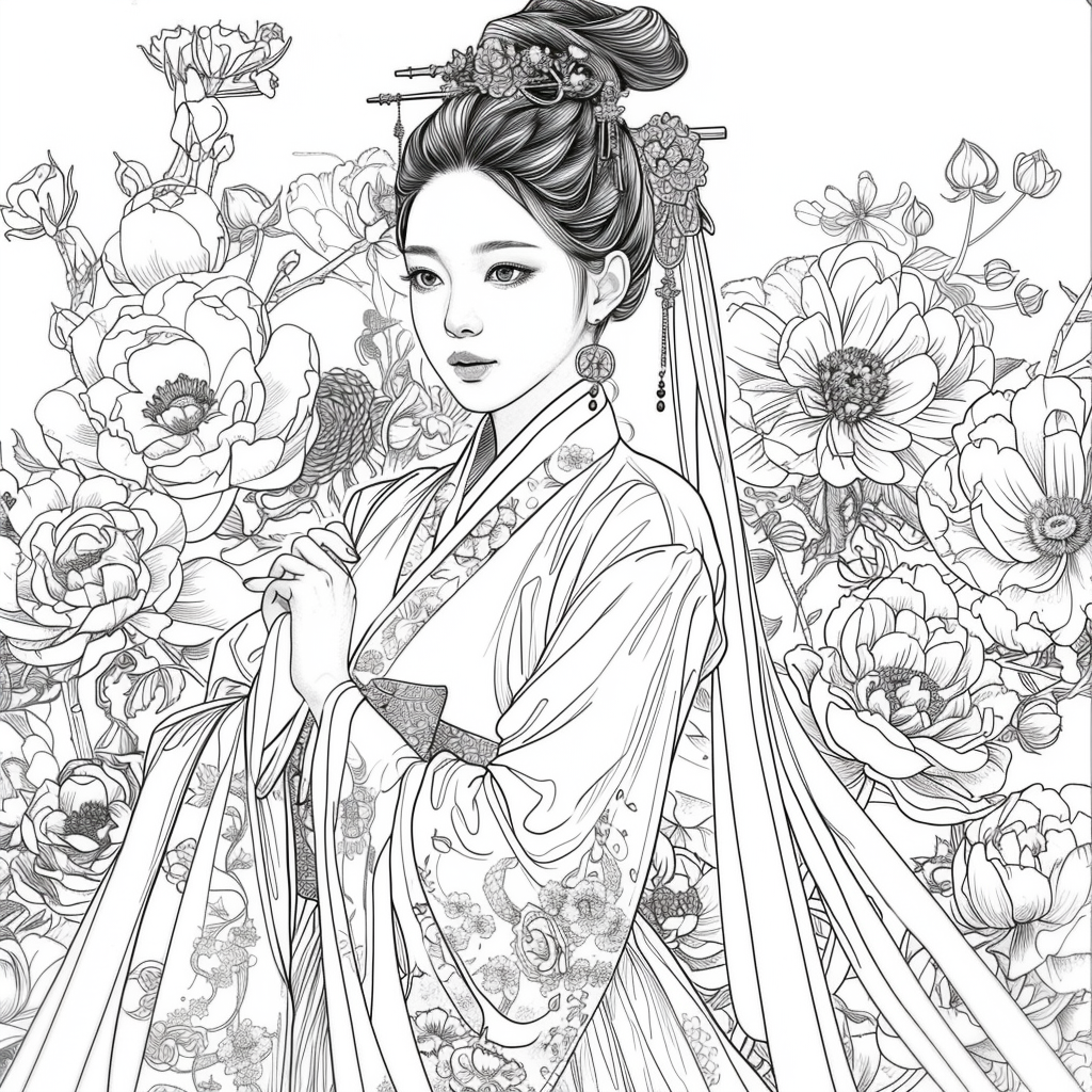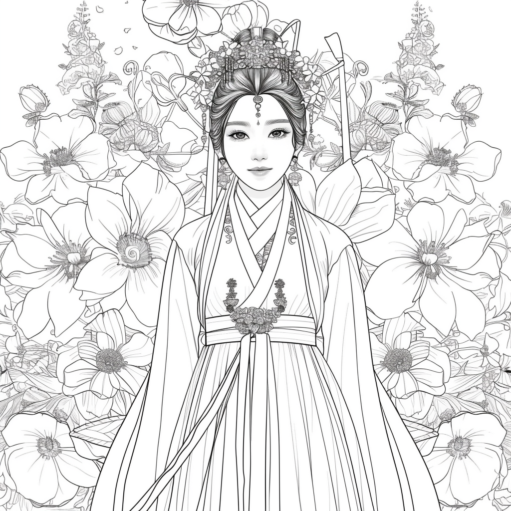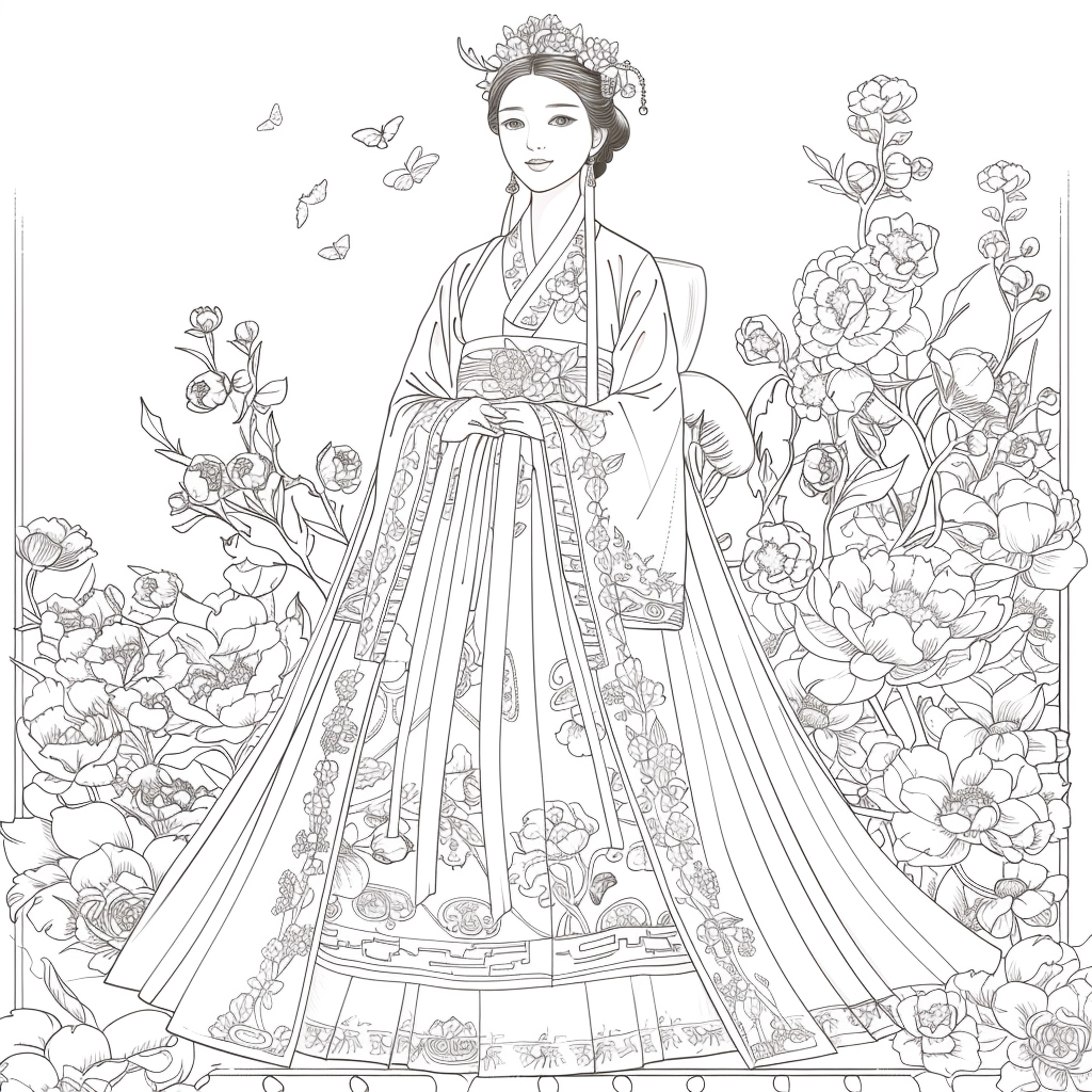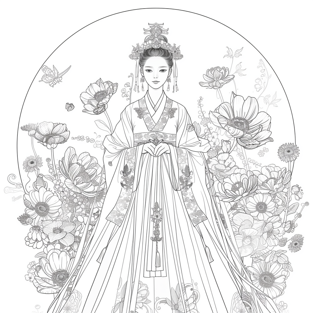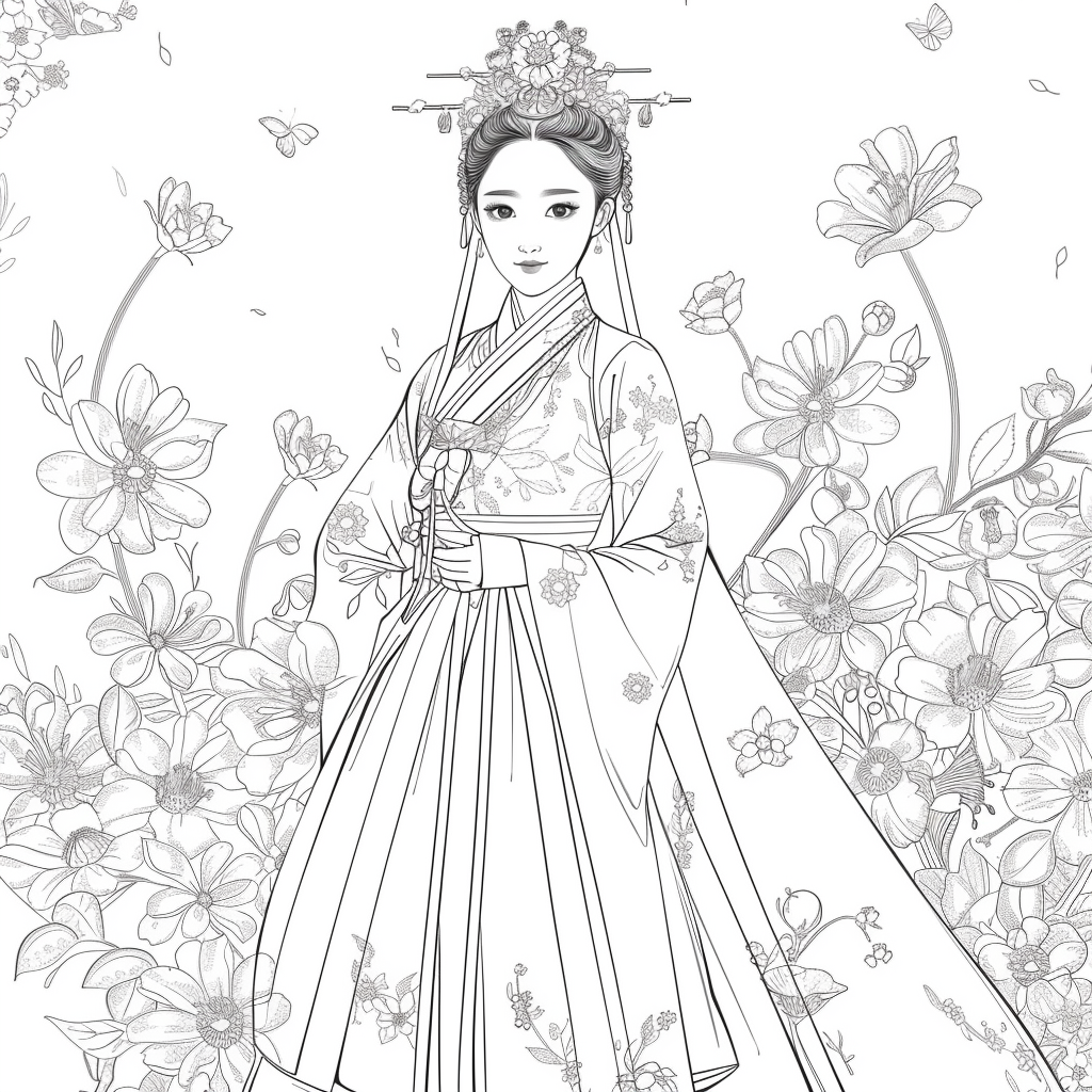 Bathed in a vivid cascade of watercolor splashes and blooming petals, this portrait captures the graceful beauty of a young Korean woman in traditional hanbok. Her poise and calm expression are accentuated by the dynamic interplay of colors — vibrant reds, lush greens, and electric blues — dancing across the fabric and background. Surrounding her are bold blossoms, delicately merging realism with abstraction, symbolizing youthful elegance, cultural pride, and the artistic bloom of life. A breathtaking blend of tradition and modern painterly expression.