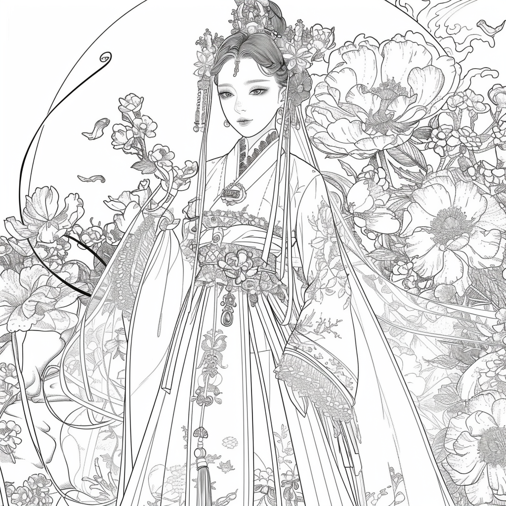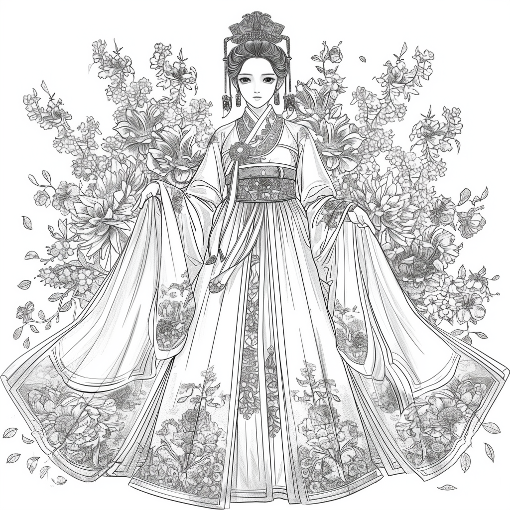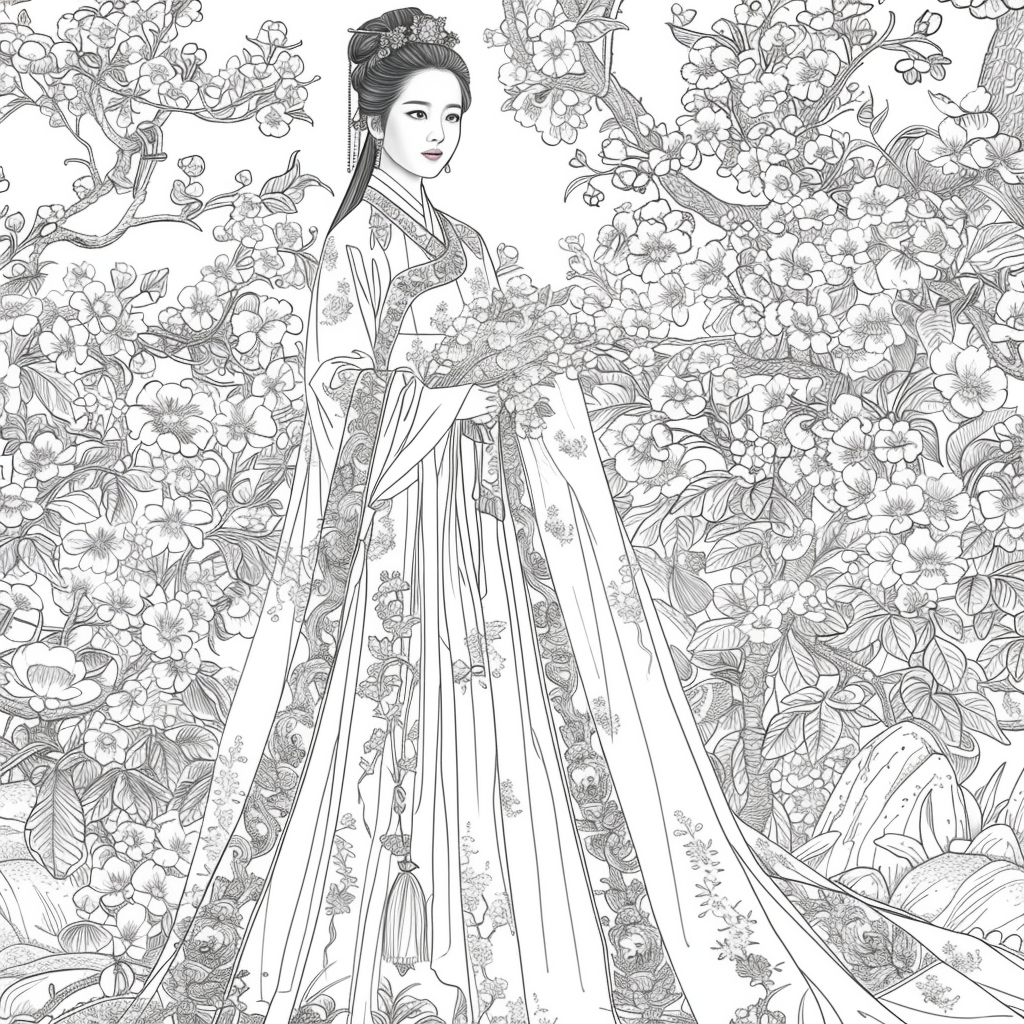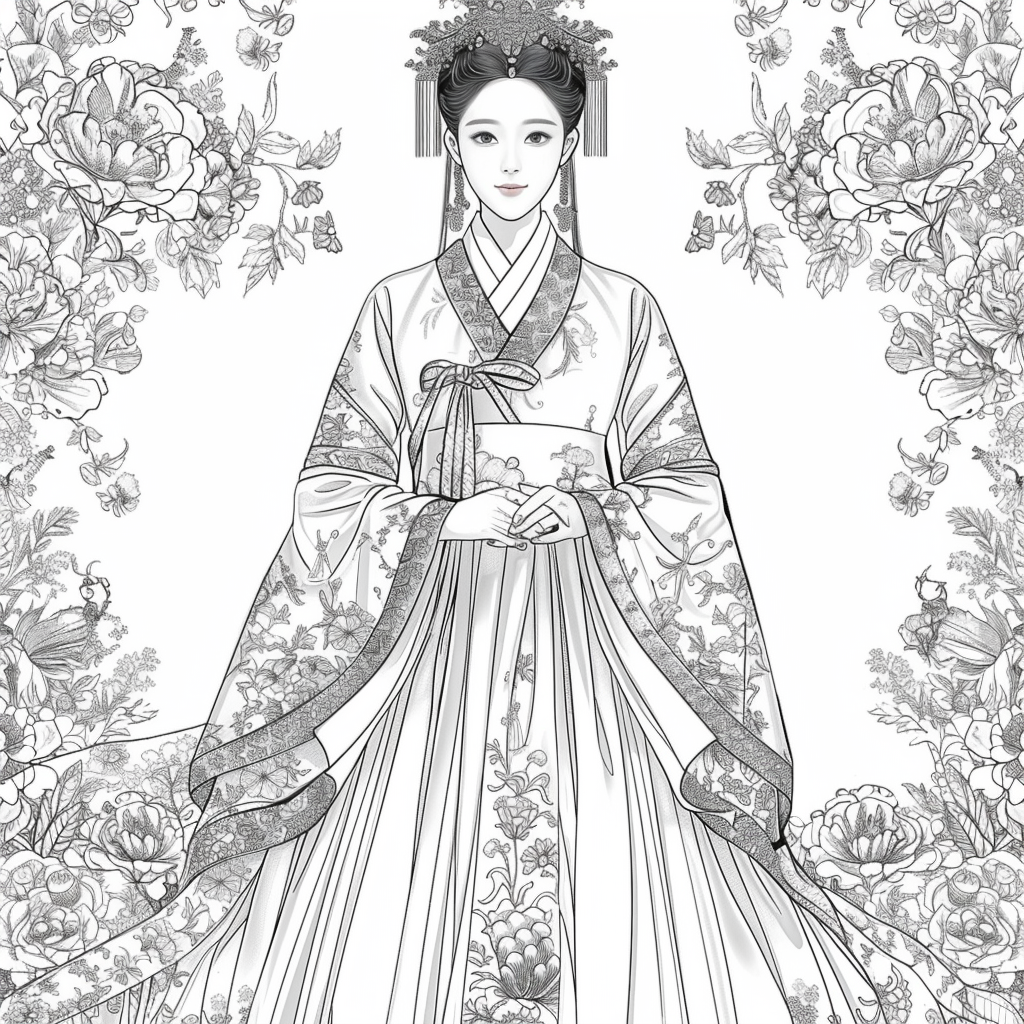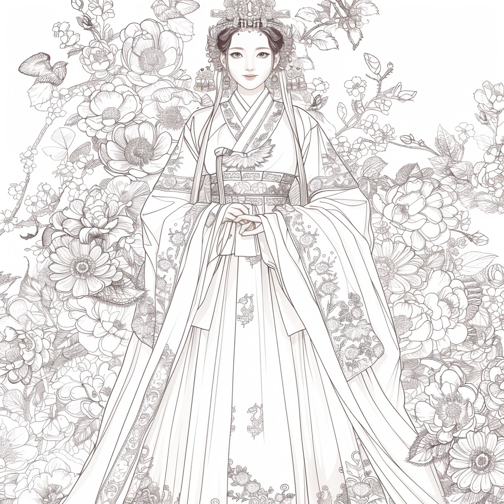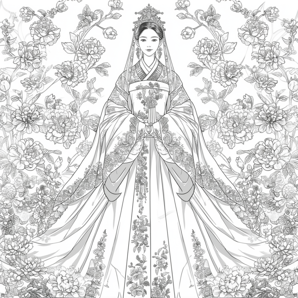 Bathed in a vivid cascade of watercolor splashes and blooming petals, this portrait captures the graceful beauty of a young Korean woman in traditional hanbok. Her poise and calm expression are accentuated by the dynamic interplay of colors — vibrant reds, lush greens, and electric blues — dancing across the fabric and background. Surrounding her are bold blossoms, delicately merging realism with abstraction, symbolizing youthful elegance, cultural pride, and the artistic bloom of life. A breathtaking blend of tradition and modern painterly expression.
