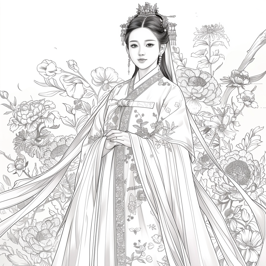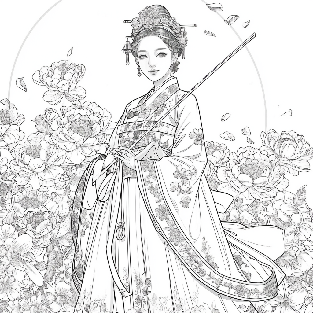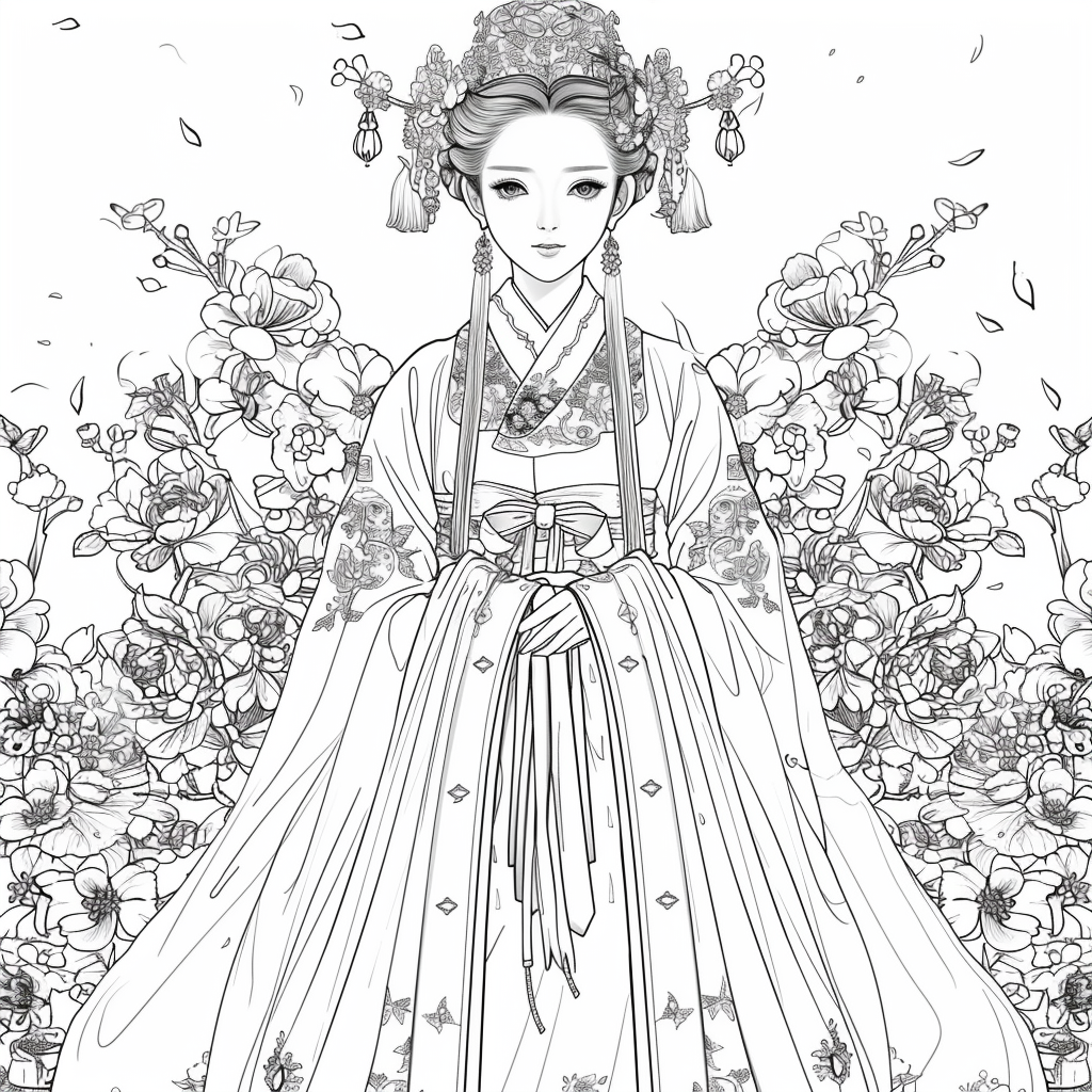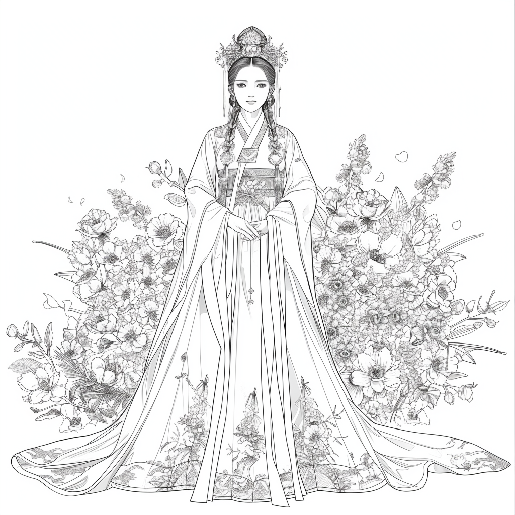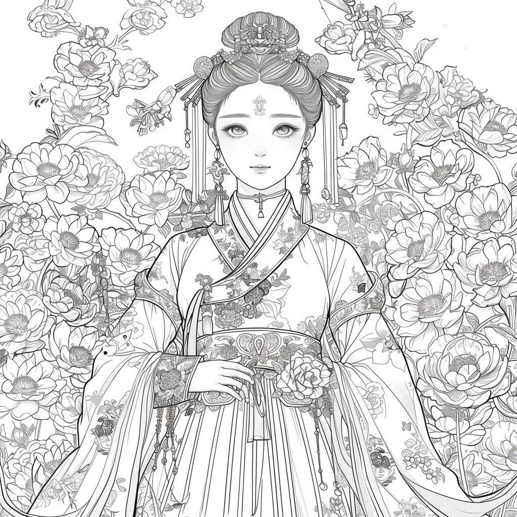 Bathed in a vivid cascade of watercolor splashes and blooming petals, this portrait captures the graceful beauty of a young Korean woman in traditional hanbok. Her poise and calm expression are accentuated by the dynamic interplay of colors — vibrant reds, lush greens, and electric blues — dancing across the fabric and background. Surrounding her are bold blossoms, delicately merging realism with abstraction, symbolizing youthful elegance, cultural pride, and the artistic bloom of life. A breathtaking blend of tradition and modern painterly expression.