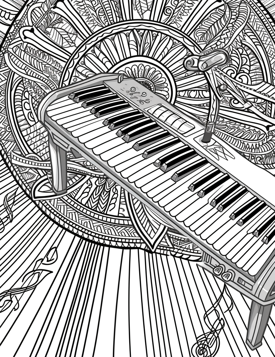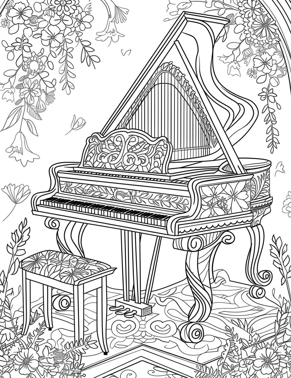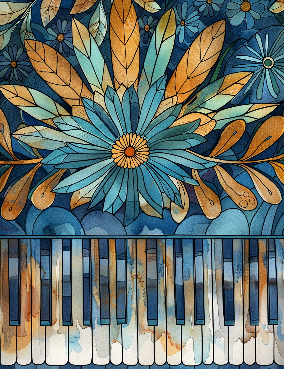 A poetic fusion of nature and melody, this watercolor mandala-style artwork weaves together delicate floral motifs and the elegance of piano keys. Golden leaves and blooming blue petals burst forth like music in motion, while the softly blended piano keys below echo the warm, earthy tones of watercolor wash. The composition suggests a symphony where flowers are notes and petals become rhythm—harmonizing visual beauty with musical grace. It’s a celebration of the unseen music that flows through nature and the soul alike.