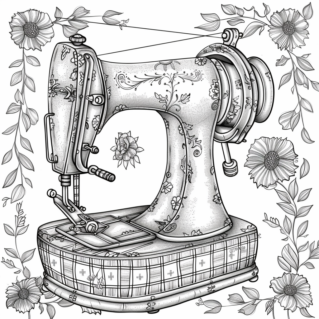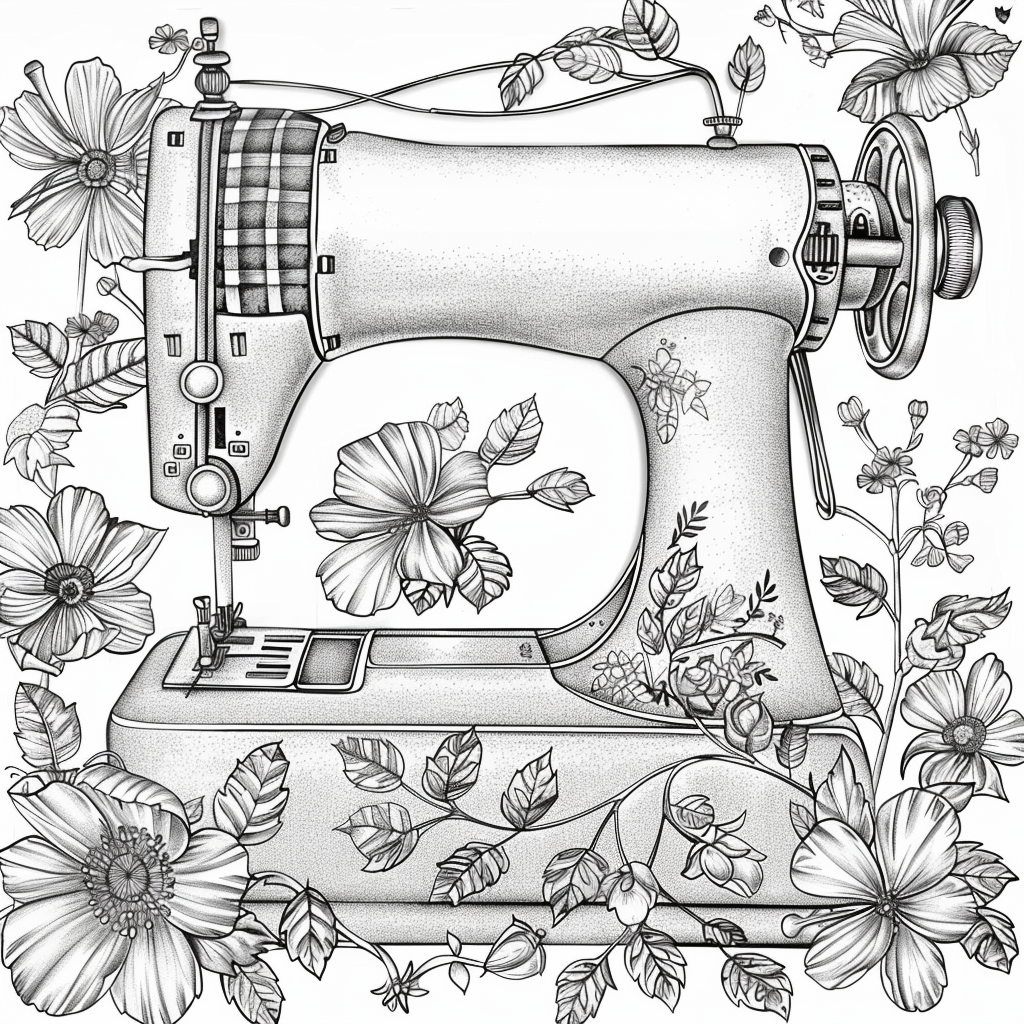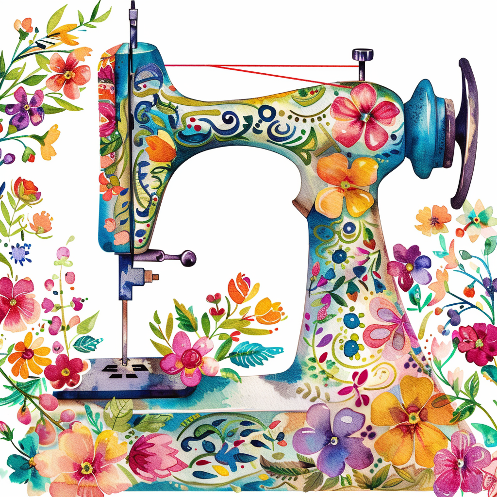 A celebration of creativity and craftsmanship, this whimsical watercolor artwork transforms a classic vintage sewing machine into a blooming canvas of floral beauty. Covered in lush hand-painted blossoms and vibrant botanical patterns, the machine pulses with life—symbolizing the joyful fusion of nature and handmade artistry. Bursts of pinks, oranges, purples, and greens surround the frame, capturing the heart of a maker’s world where every stitch tells a story.